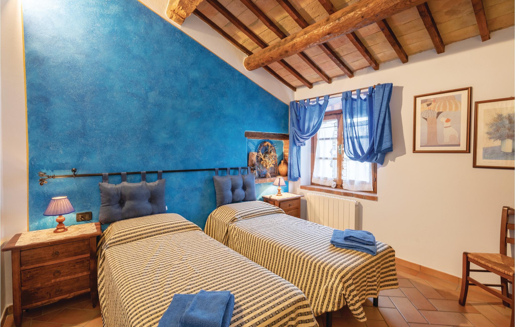 Jeres feriebolig består af et smukt feriehus, en tidligere oliemølle, og en separat lejlighed i et anneks. Ejendommen ligger på en bjergskråning med udsigt over Trasimenosøen, tæt på den lille by Magione. På den indhegnede, grønne grund findes der findes spil til børn, bocciabane og en pool med panoramaudsigt. På forespørgsel og mod betaling på stedet er følgende muligt: Ture til øerne på søen, kokkeservice med typiske måltider samt fisketure. Vinelskerne burde tage på smagsprøver langs ”Strada del vino dei Colli del Tasimeno” og ”Strada dei Vini Etrusco Romana”. Huset ligger ideelt til at besøge kunstbyerne Perugia (22 km), Assisi (46 km), Chiusi (36 km) og Arezzo (56 km). To af soveværelserne ligger i den separate lejlighed i stuen, der ikke er forbundet internt og har egen indgang.