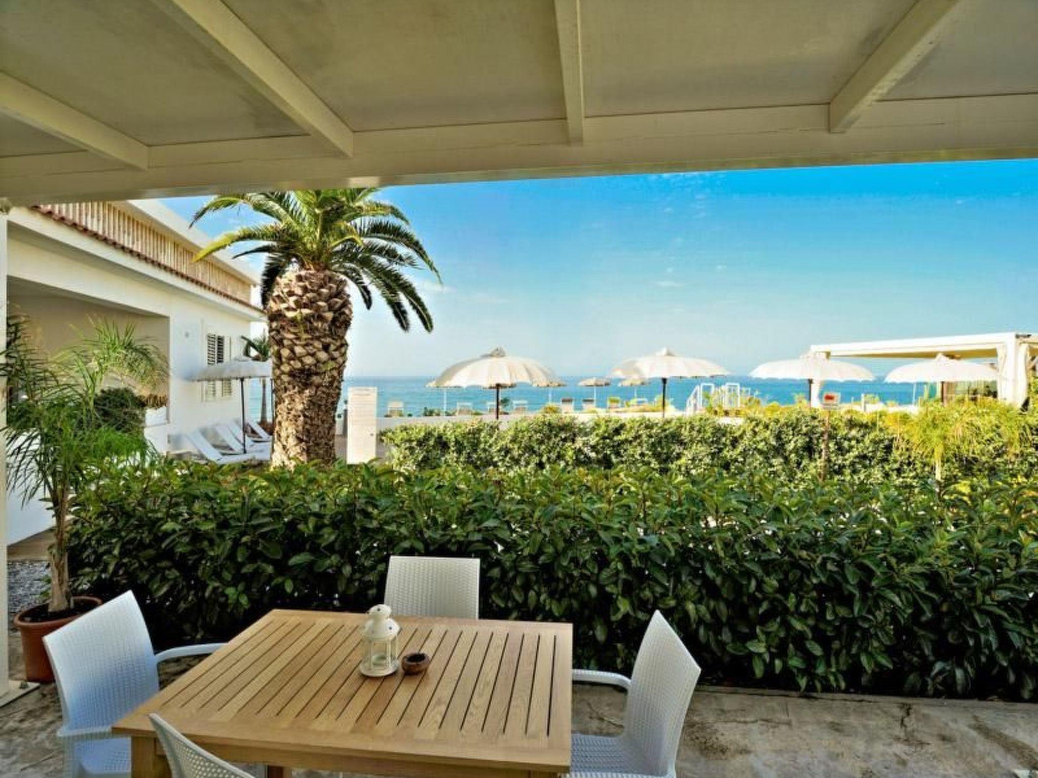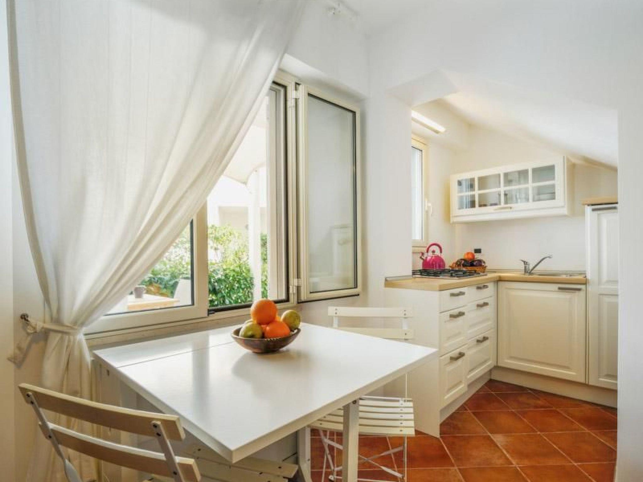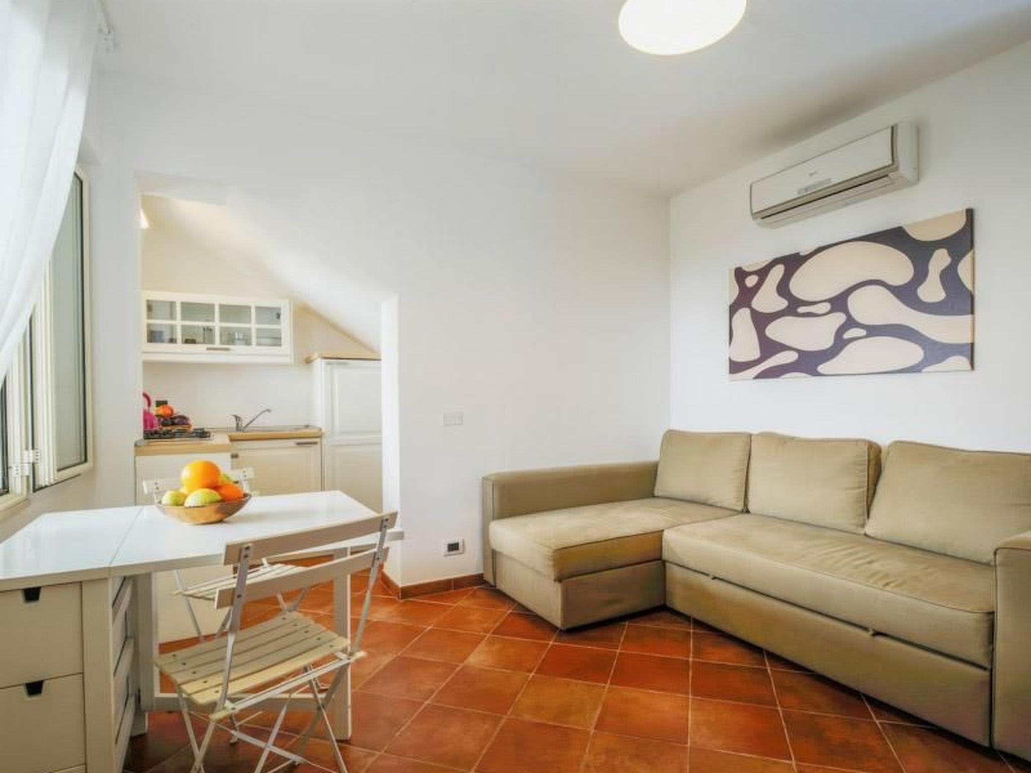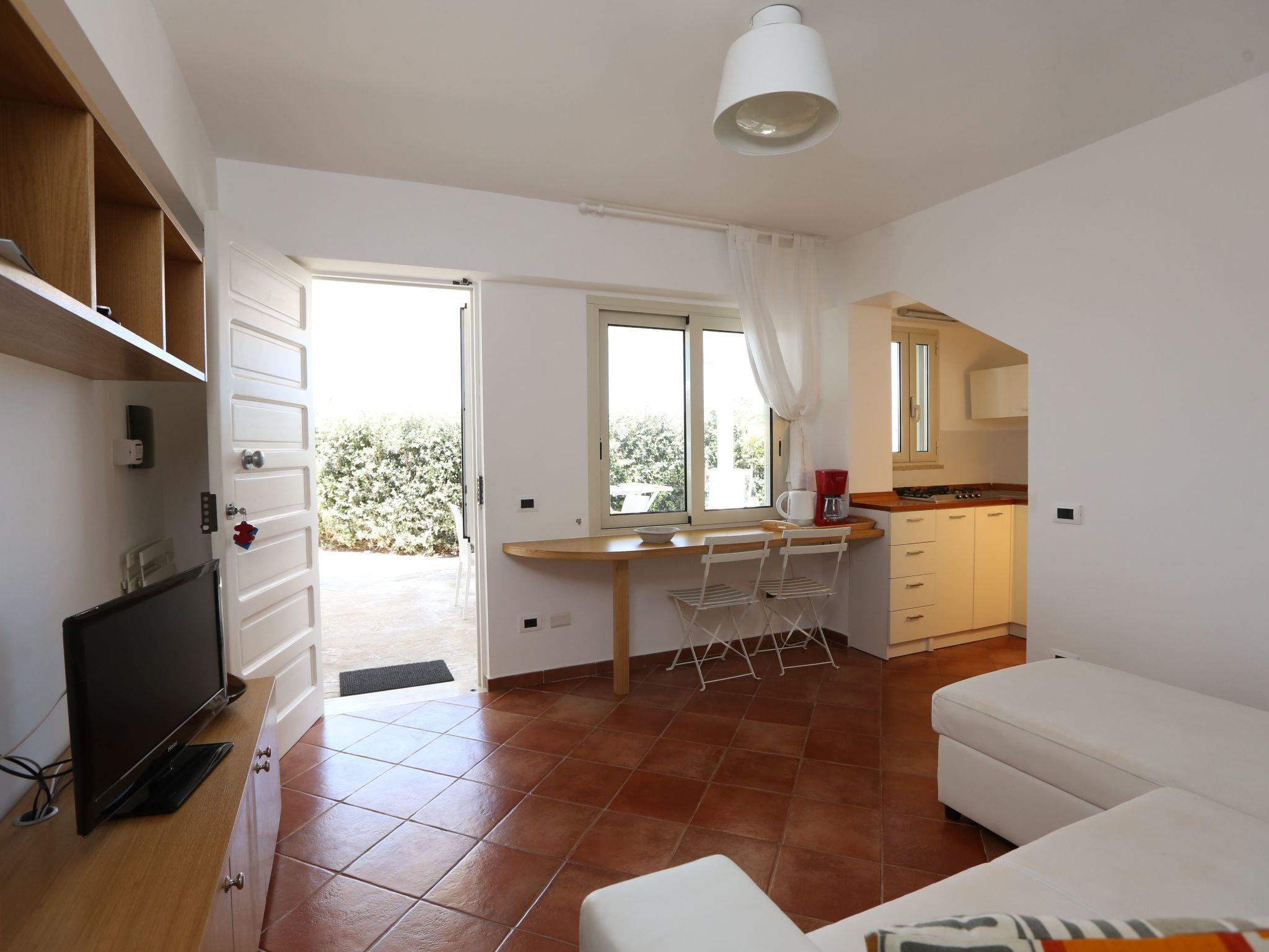 Ground level apartment consisting of 1 bedroom with double bed,a windowed bathroom with shower cabin, a fully fitted kitchenette, a living room furnished with a double sofa bed, a small extendable table with four chairs and wall unit, looking out onto a spacious external veranda furnished with a table, four chairs and a sun bed.