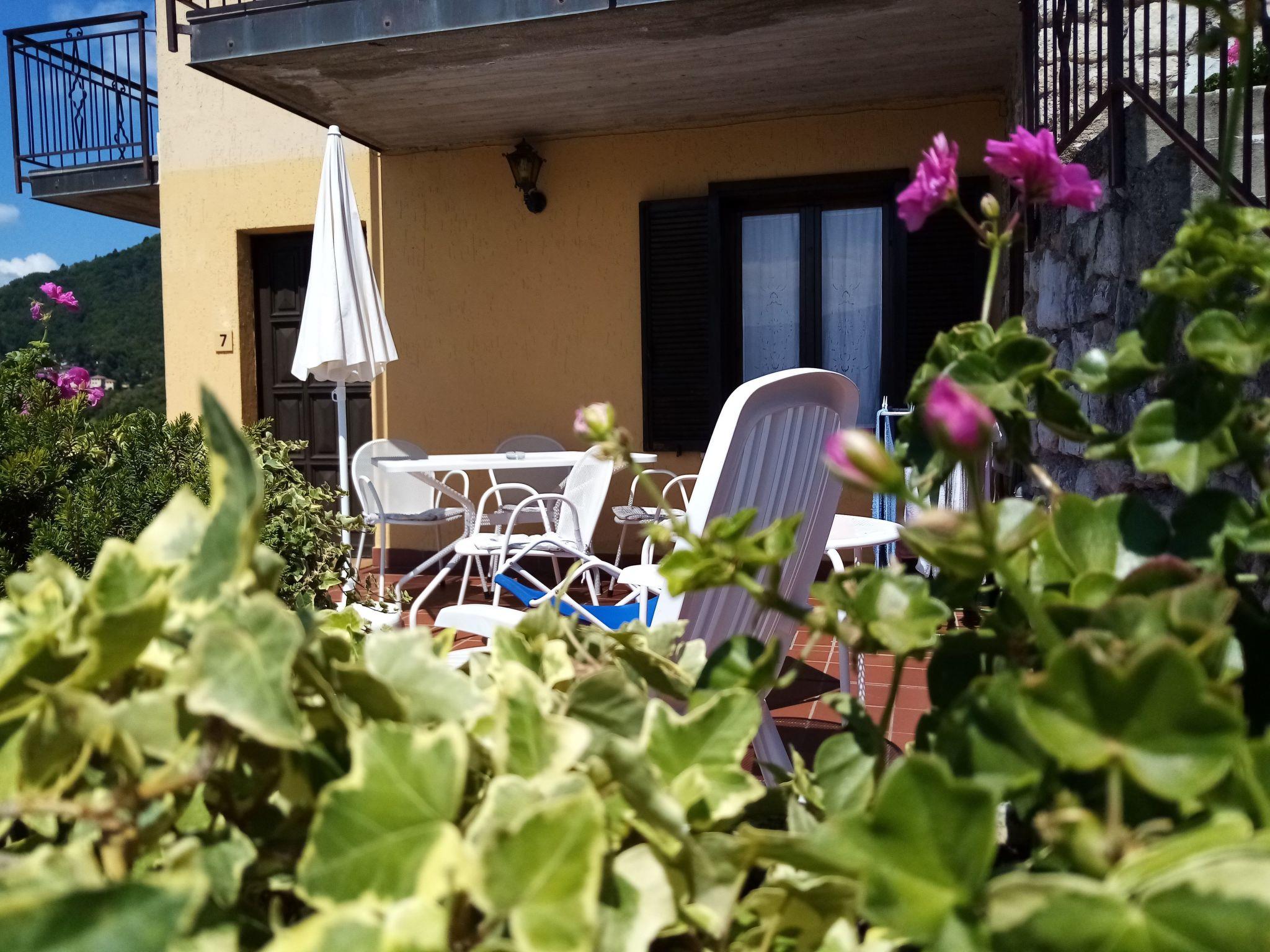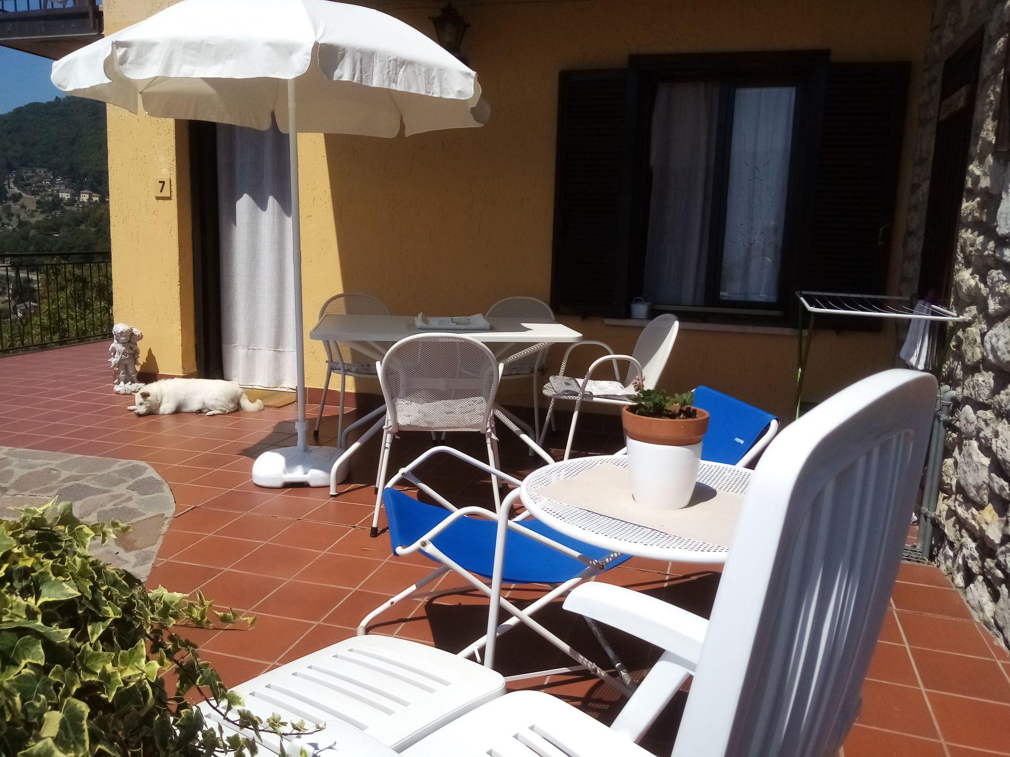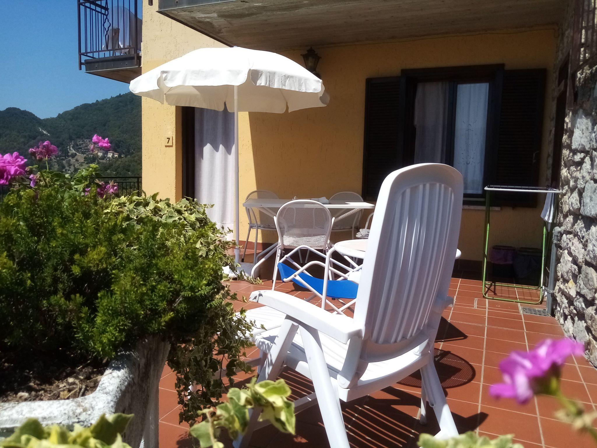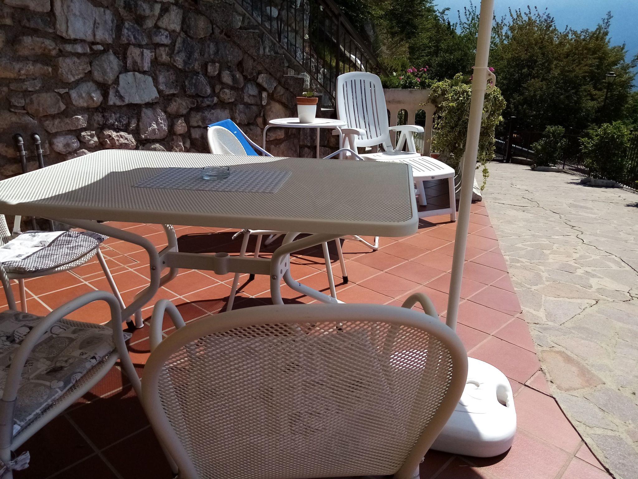 Outside there is a terrace furnished with a table, four chairs, two deck chairs and a sunshade. For this accommodation located on the ground floor it is obligatory for other people in the house to pass through.