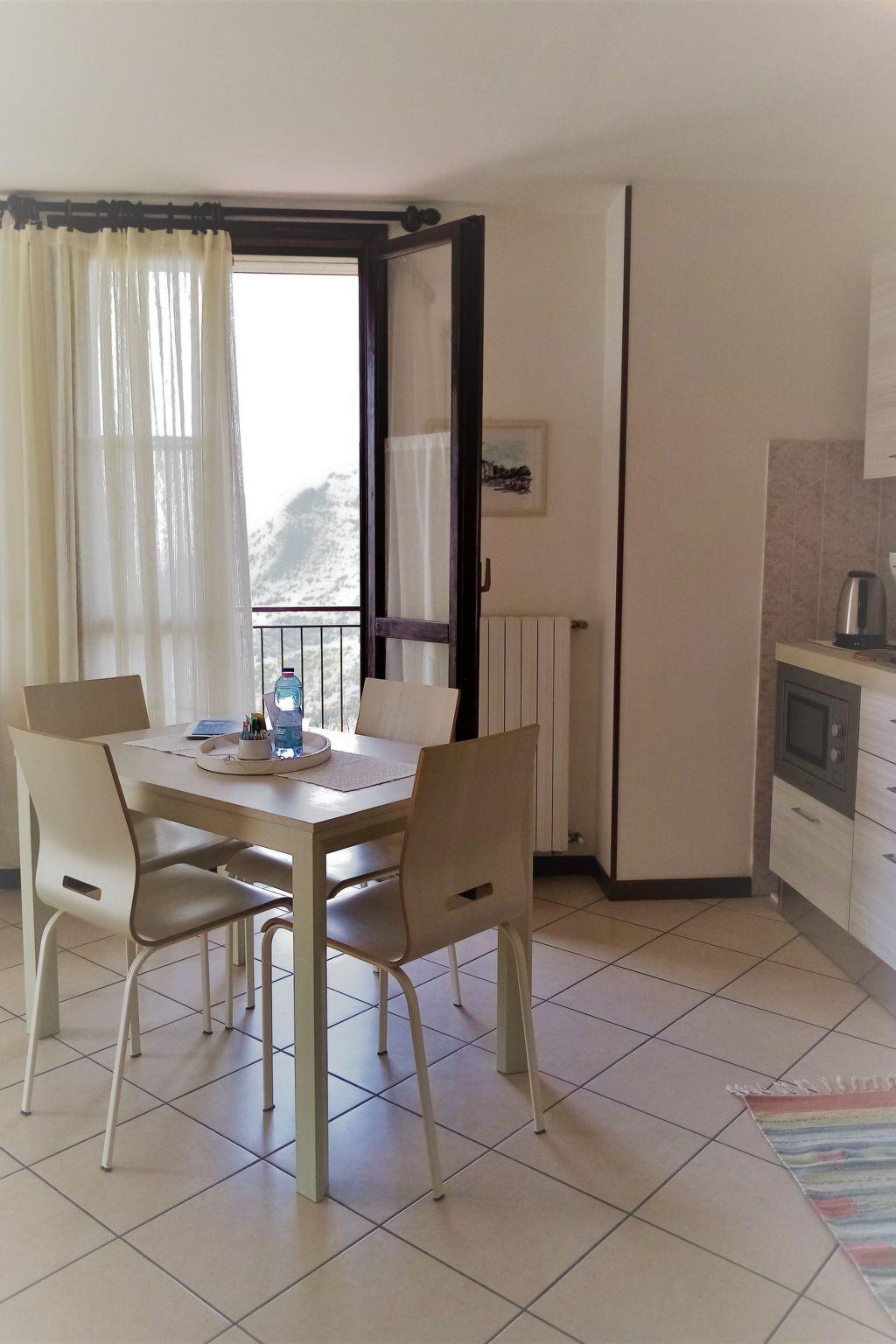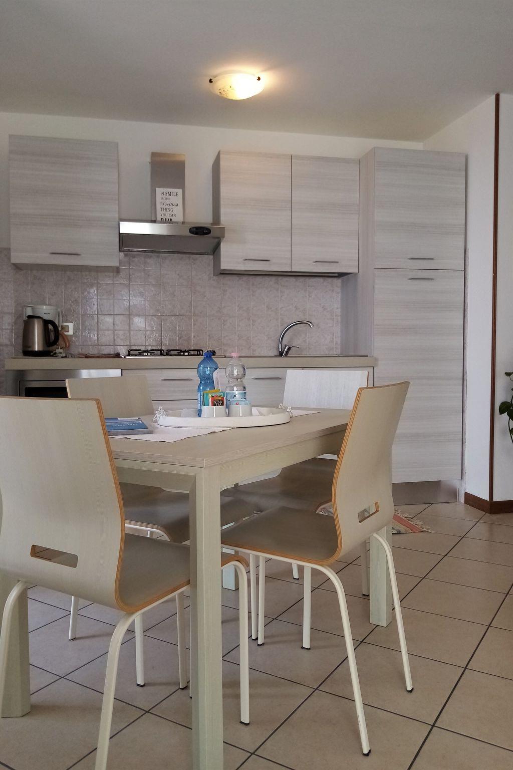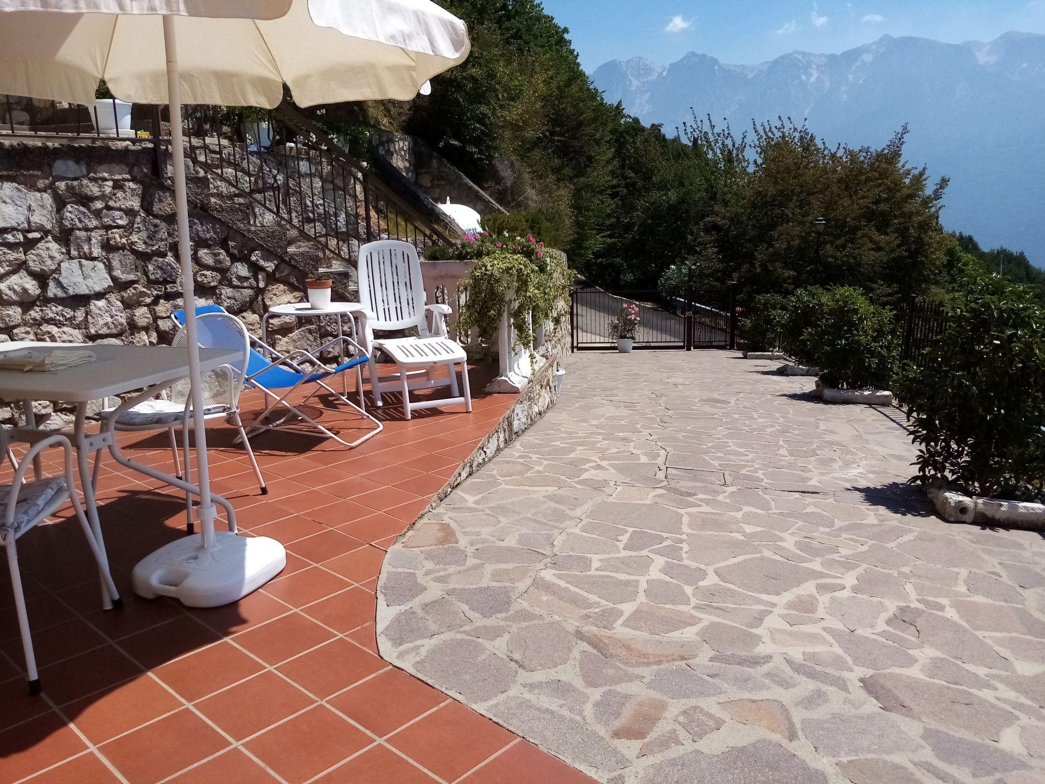 Outside there is a terrace furnished with a table, four chairs, two deck chairs and a sunshade. For this accommodation located on the ground floor it is obligatory for other people in the house to pass through.