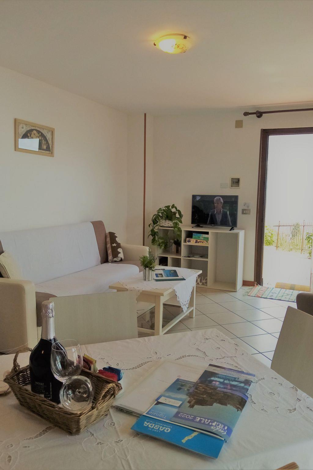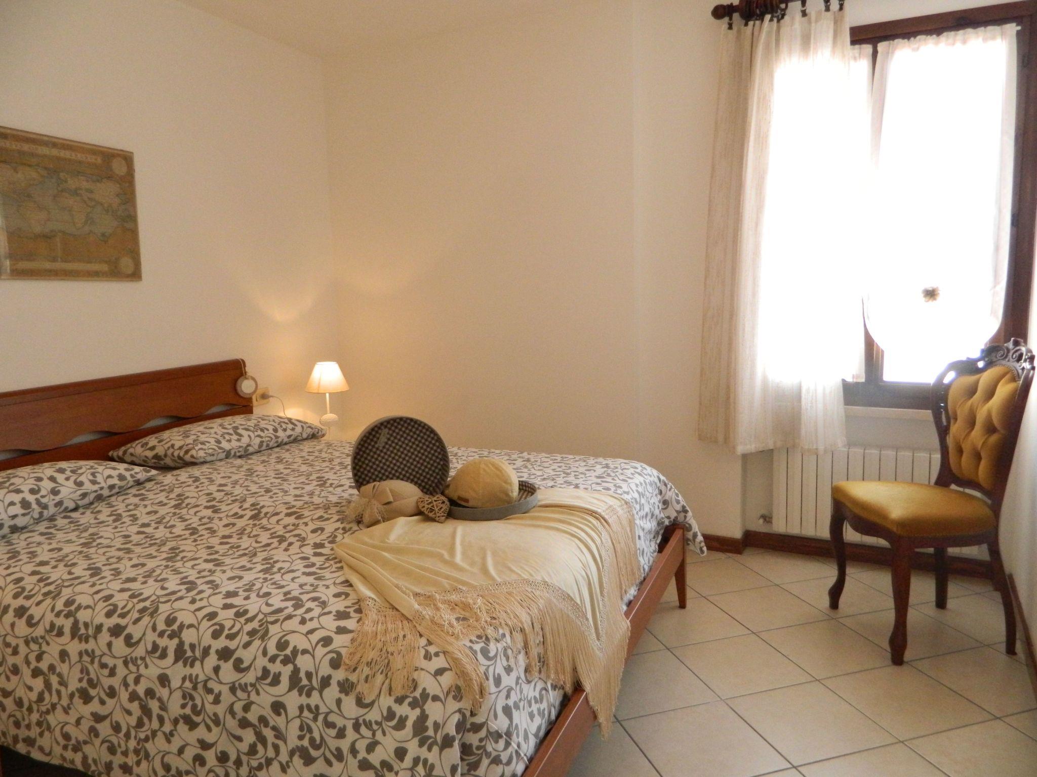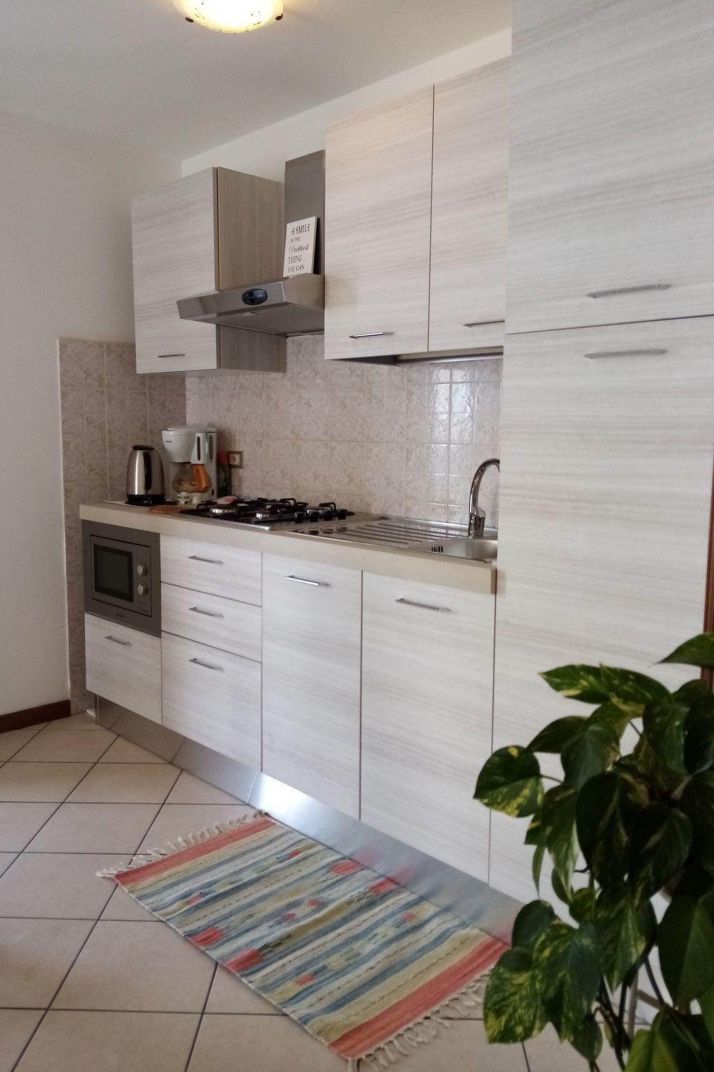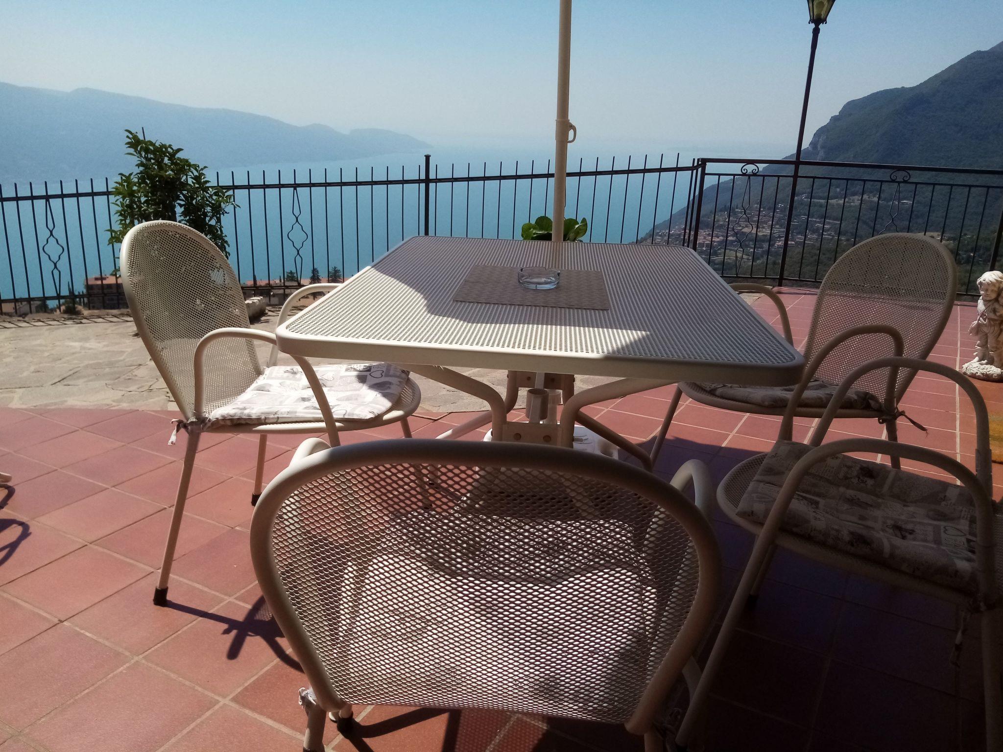 Outside there is a terrace furnished with a table, four chairs, two deck chairs and a sunshade. For this accommodation located on the ground floor it is obligatory for other people in the house to pass through.