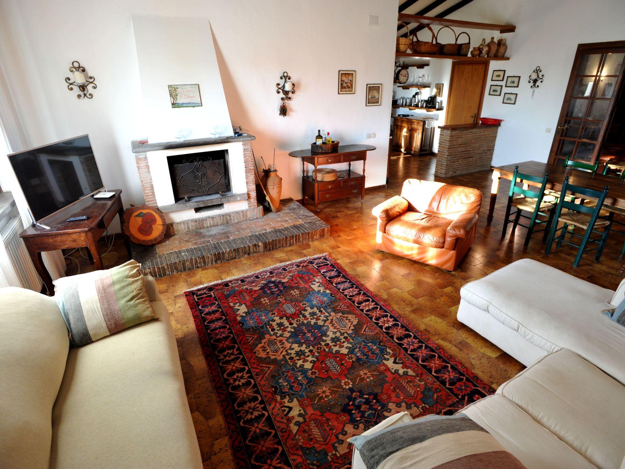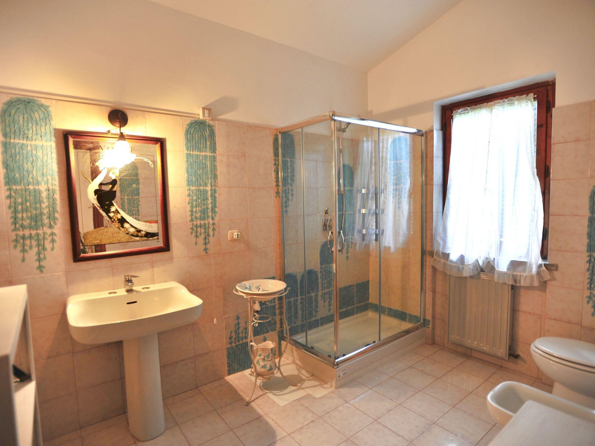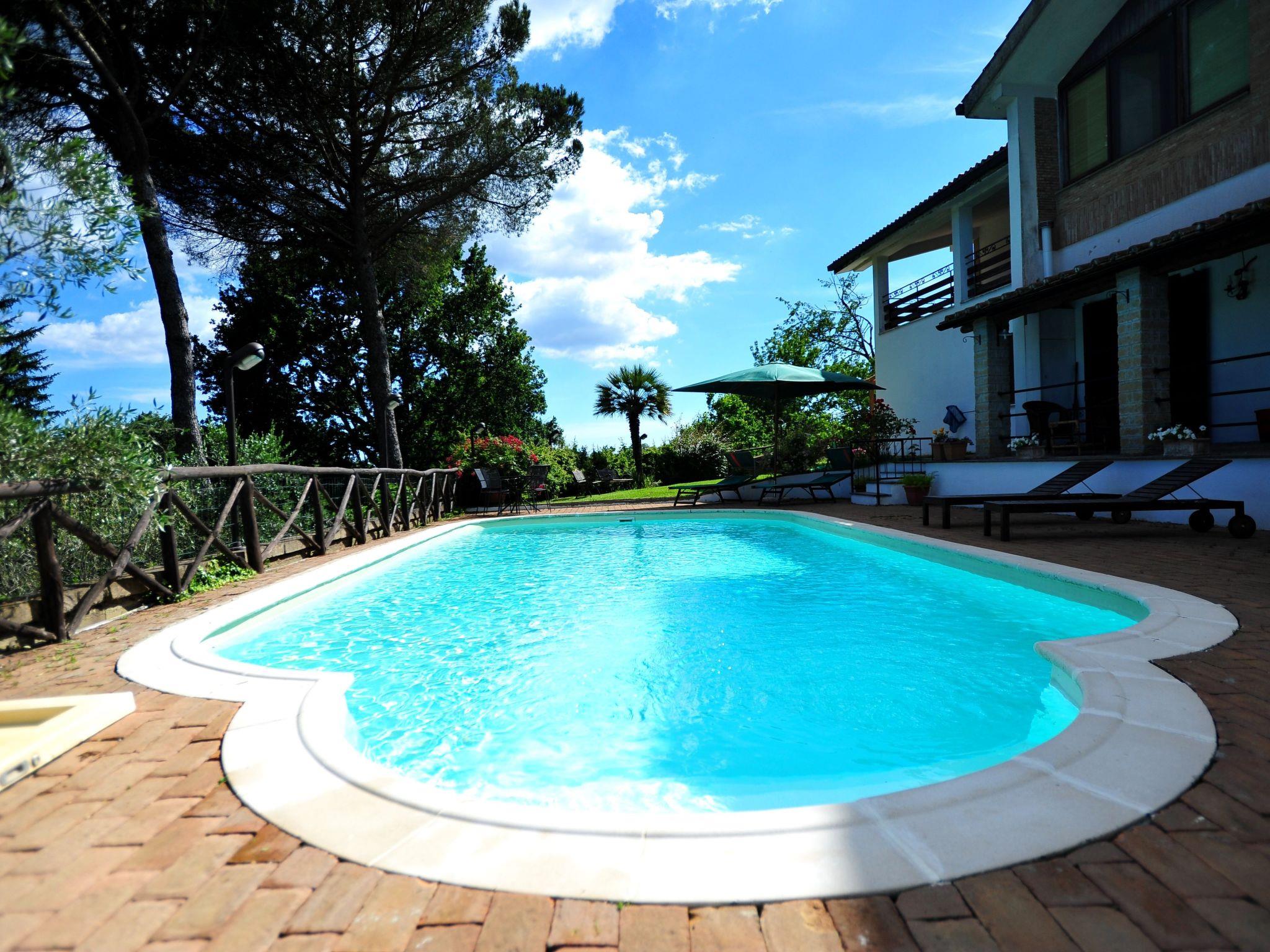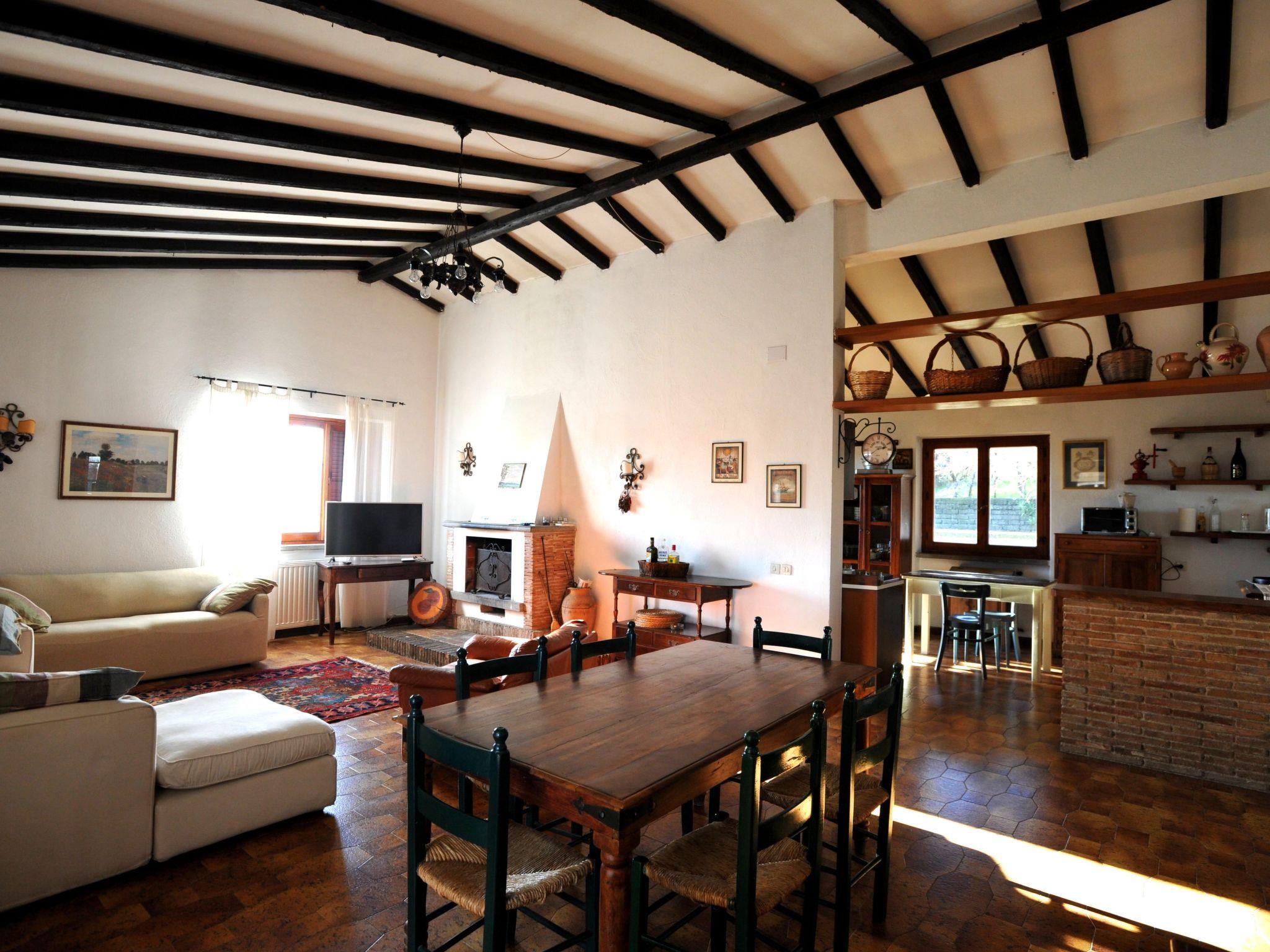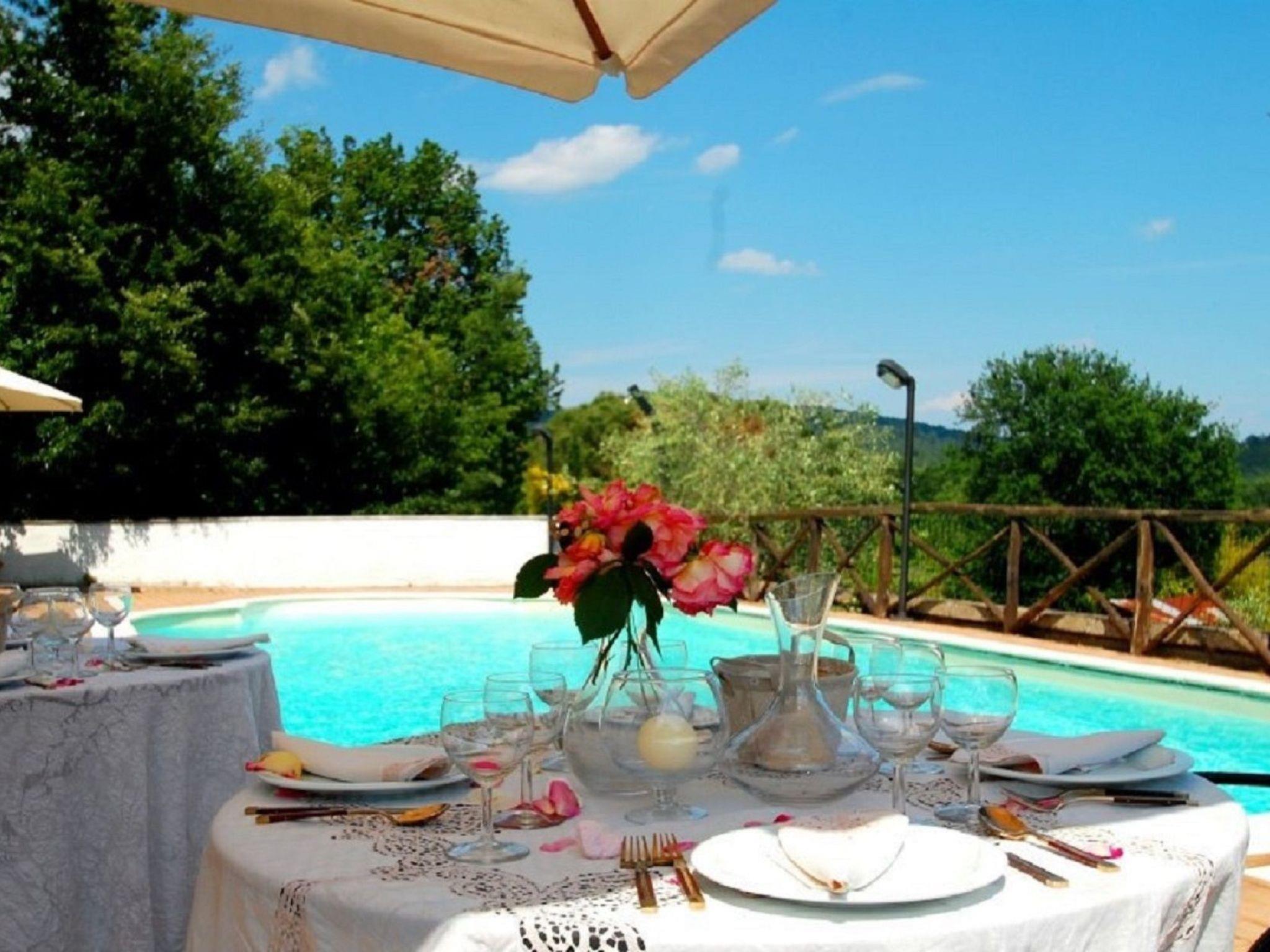 The villa consists of a main flat, with 4 bedrooms, 3 doubles and 1 triple, 2 bathrooms with shower, 1 large fully equipped kitchen with gas cooker, electric oven, fridge/freezer, dishwasher and cooking utensils, double living room with sofas and tables, panoramic terrace overlooking the pool and the hills of Lake Bracciano; a smaller flat, with 1 double bedroom, 1 triple, 1 bathroom with shower.