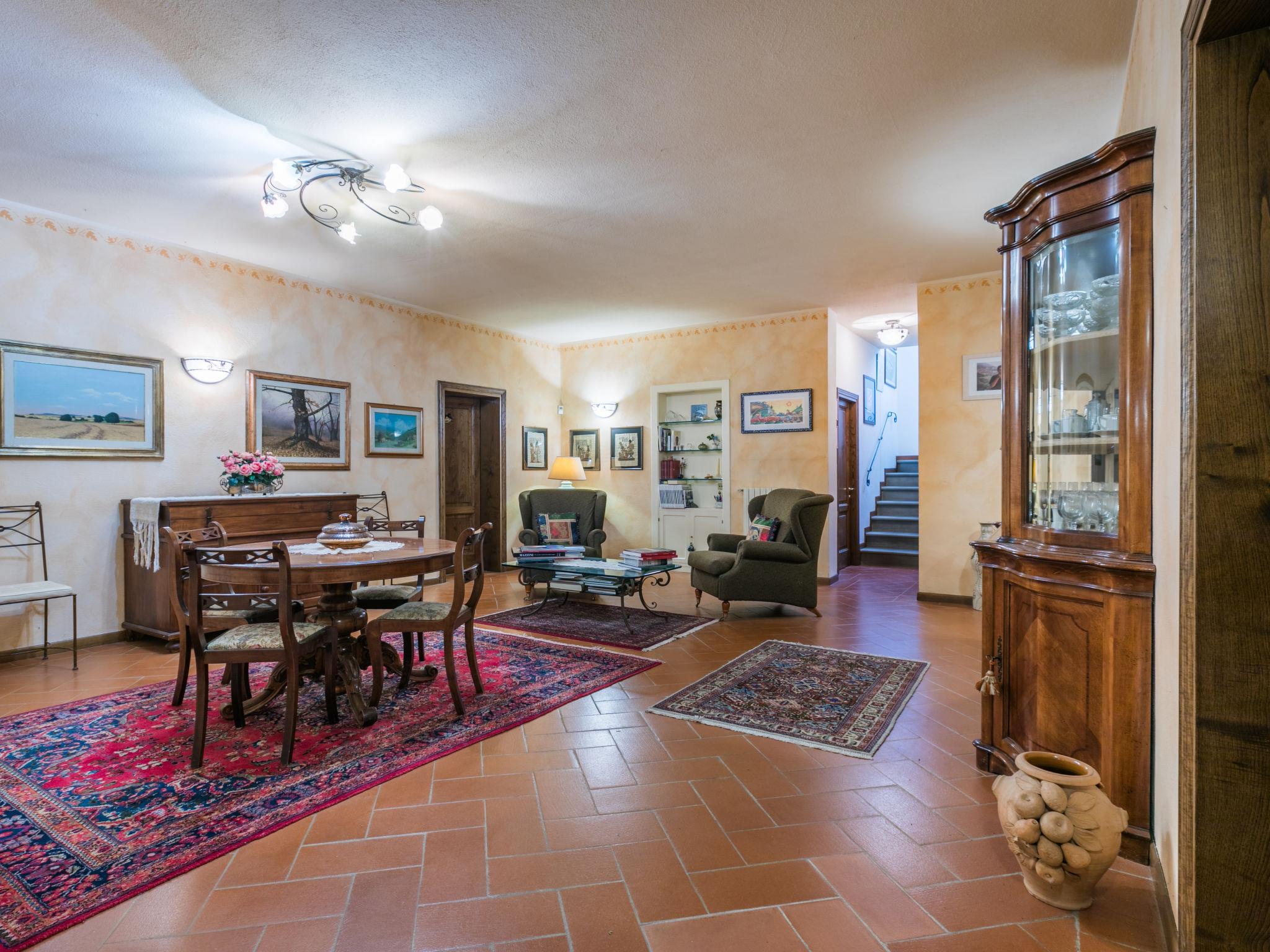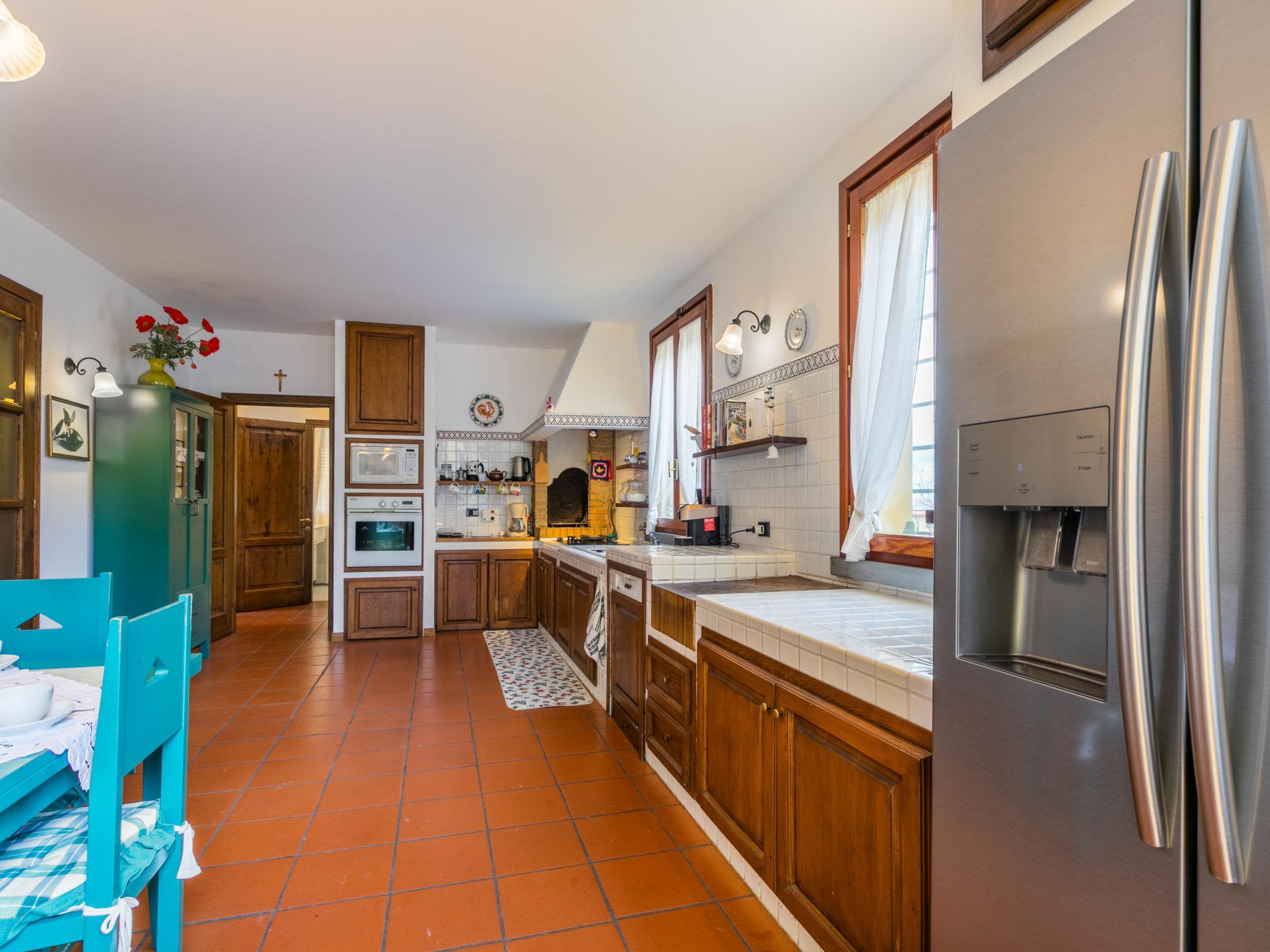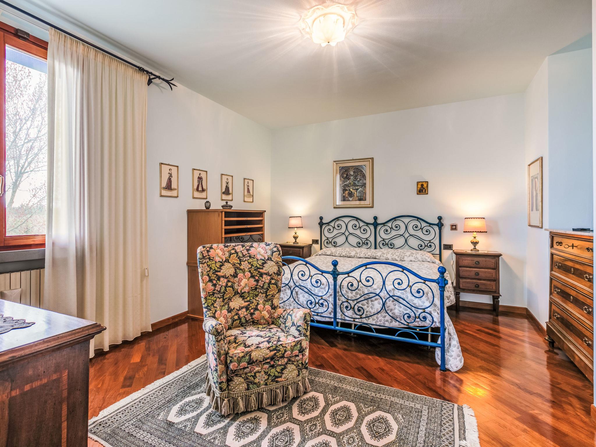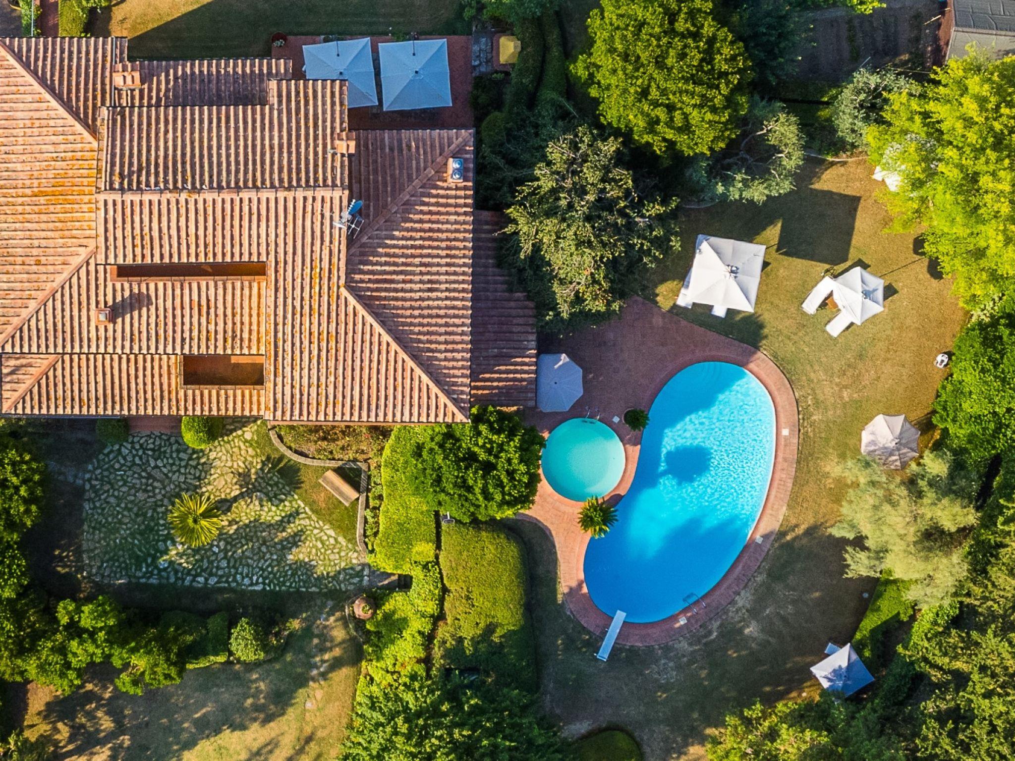"Villa Silvana", 9-room villa 350 m2 on 4 levels. Spacious, tasteful and stylish furnishings: open entrance hall. Open dining room. Open large living room with open-hearth fireplace and TV (flat screen). Exit to the terrace, to the swimming pool. Large kitchen (oven, dishwasher, 4 induction hot plates, Gas stove, 2 gas rings, toaster, kettle, microwave, grill, electric coffee machine) with dining table. Exit to the terrace. Shower/bidet/WC. On the lower ground floor: open large dining room. Open large living/dining room with open-hearth fireplace. Playroom. Large kitchen (oven, dishwasher, Gas stove, 6 gas rings, toaster, kettle, microwave, freezer, electric coffee machine). Shower/bidet/WC. Upper floor: 2 double bedrooms. 1 large room with Dressing room with 2 beds (120 cm), bath/shower/bidet/WC and TV (flat screen), air conditioning. Exit to the balcony. 2 showers/bidet/WC. 2nd upper floor: 1 double bedroom with sloping ceilings with panoramic window. Exit to the balcony. Gas heating, air-conditioning. Parquet floors, natural stone floors. 2 terraces covered, patio, lawn. Terrace furniture, barbecue, deck chairs, covered balcony, sitting area, box-room. Marvellous panoramic view of the countryside. Facilities: washing machine, dryer, iron, mosquito net, children's high chair, baby cot for up to 2 year olds, hair dryer. Internet (WiFi, free). Parking (fenced 4 cars). Please note: suitable for families. Non-smokers only. Private entrance, smoke alarm, fire extinguisher. The pool mentioned in the description is for private use. IT048054C26OX2COPC