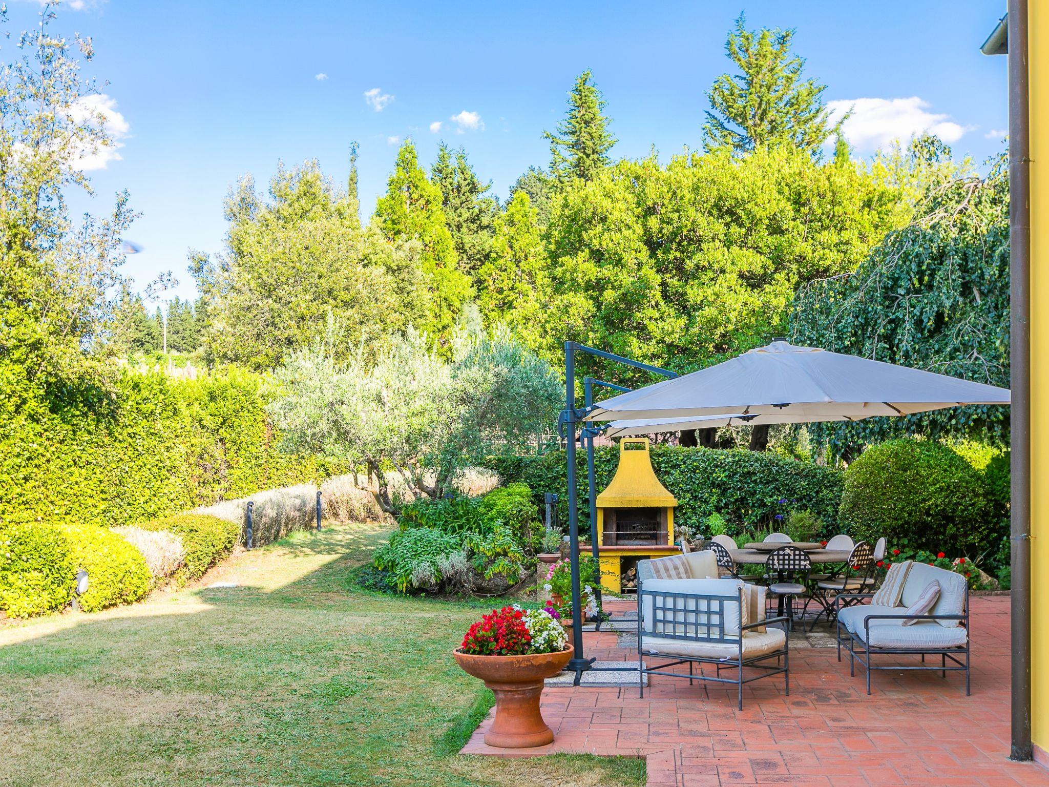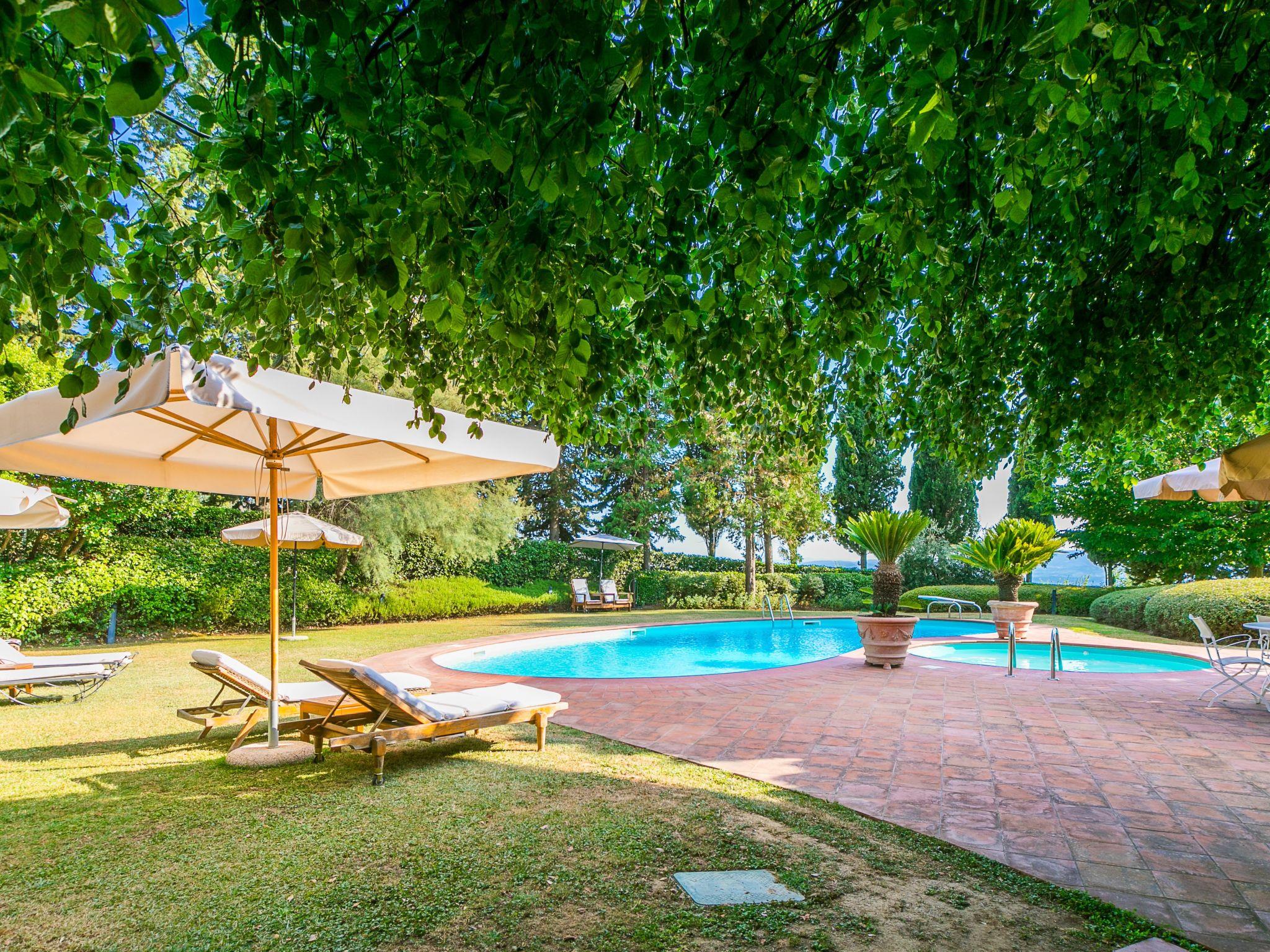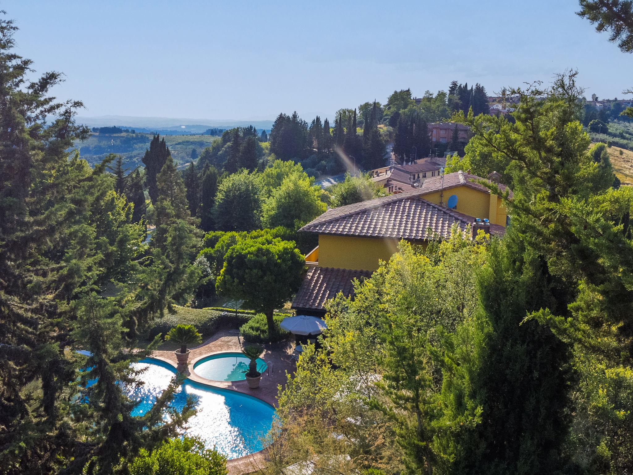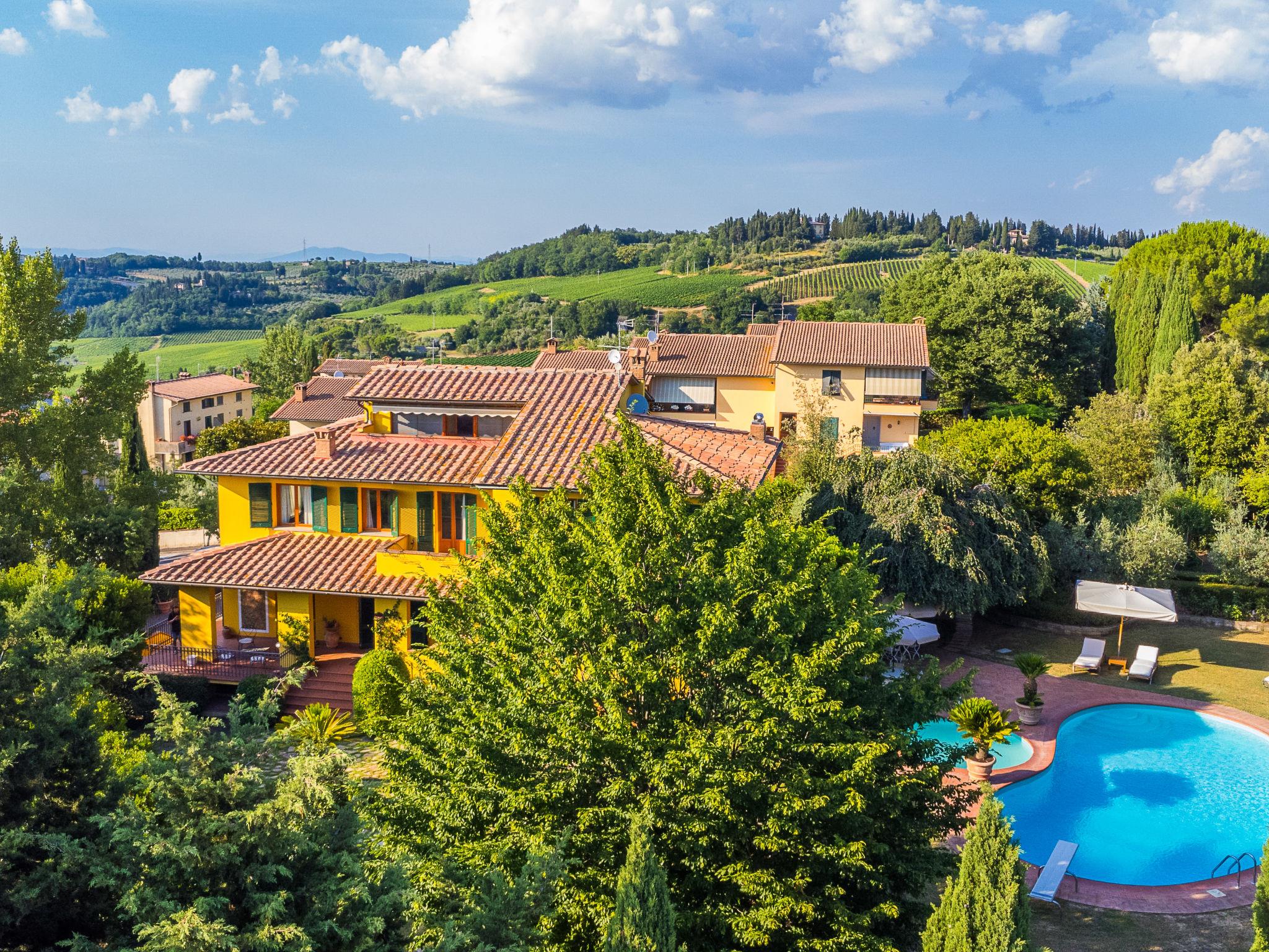 Marcialla 3 km from Tavarnelle Val di Pesa: Very beautiful, comfortable single-family house "Villa Silvana", 3 storeys. 800 m from the centre of Marcialla, in a secluded position in the residential district. Private: large, well-kept garden (fenced) with wildlife garden and trees, swimming pool (5 x 10 m, depth 100 - 250 cm, seasonal availability: 20.Apr. - 15.Oct.). Outdoor shower, hot tub, arbour, pergola, terrace, garden furniture, barbecue, pool maintenance by the owner/gardener. In the house: fitness room, hot tub (all included). Linen change (suppl. charge extra). Towel change (suppl. charge extra). Room cleaning on request (extra). House maid on request (extra). Cook on request (extra). Breakfast and half board possible (extra). Parking at the house, single garage at the house. Shop, grocery 800 m, supermarket 3 km, restaurant, bakery 800 m, bus stop 100 m, railway station "Zambra" 13 km, sandy beach "Cecina Mare" 90 km. Golf course (14 hole) 30 km. Nearby attractions: Certaldo 11 km, San Gimignano 22 km, Firenze 36 km, Siena 46 km, Volterra 47 km, Pisa 86 km. Please note: baby equipment (included). Suitable for events. Cooking courses bookable on request. The owner does not accept any youth groups.