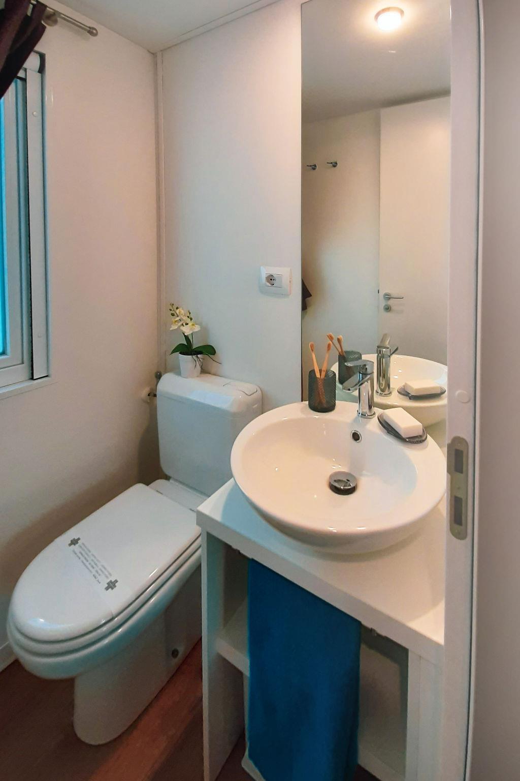 "Maestrale", 3-room mobile home 30 m2. Modern furnishings: living/sleeping room with 1 sleeping facility, dining table, kitchen corner and air conditioning. Exit to the terrace. 1 room with 1 double bed (160 cm, length 195 cm), separate WC. 1 room with 2 beds (70 cm, length 190 cm), 1 x 1 bunk beds (70 cm, length 185 cm). Open kitchen (4 gas rings, microwave, freezer). Shower/WC. Heating, air-conditioning. Terrace 15 m2, roofed. Terrace furniture. Facilities: mosquito net. Parking (1 car). IT049001B1KRISVGSR