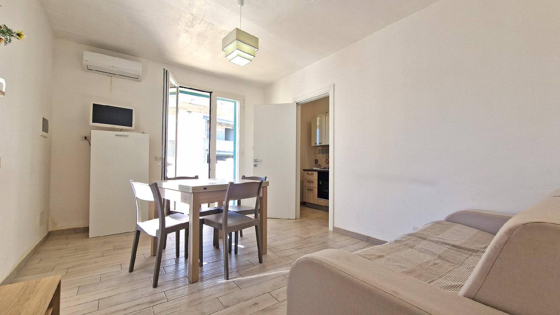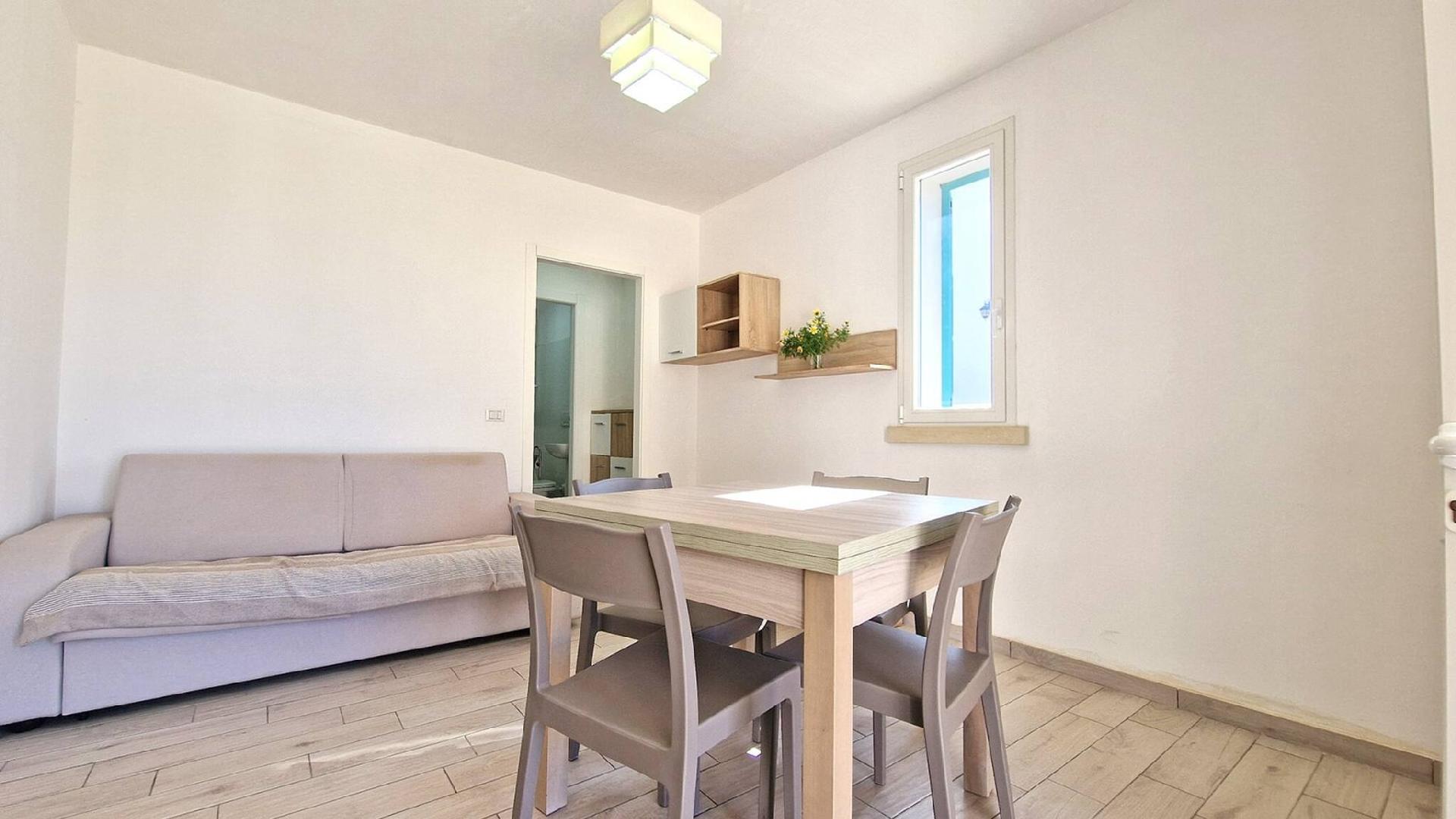 The interiors are cool and well-organised: a double bedroom, a spacious air-conditioned living room with a sofa bed, a fully equipped kitchen with everything necessary, and a bathroom with a shower and washing machine.