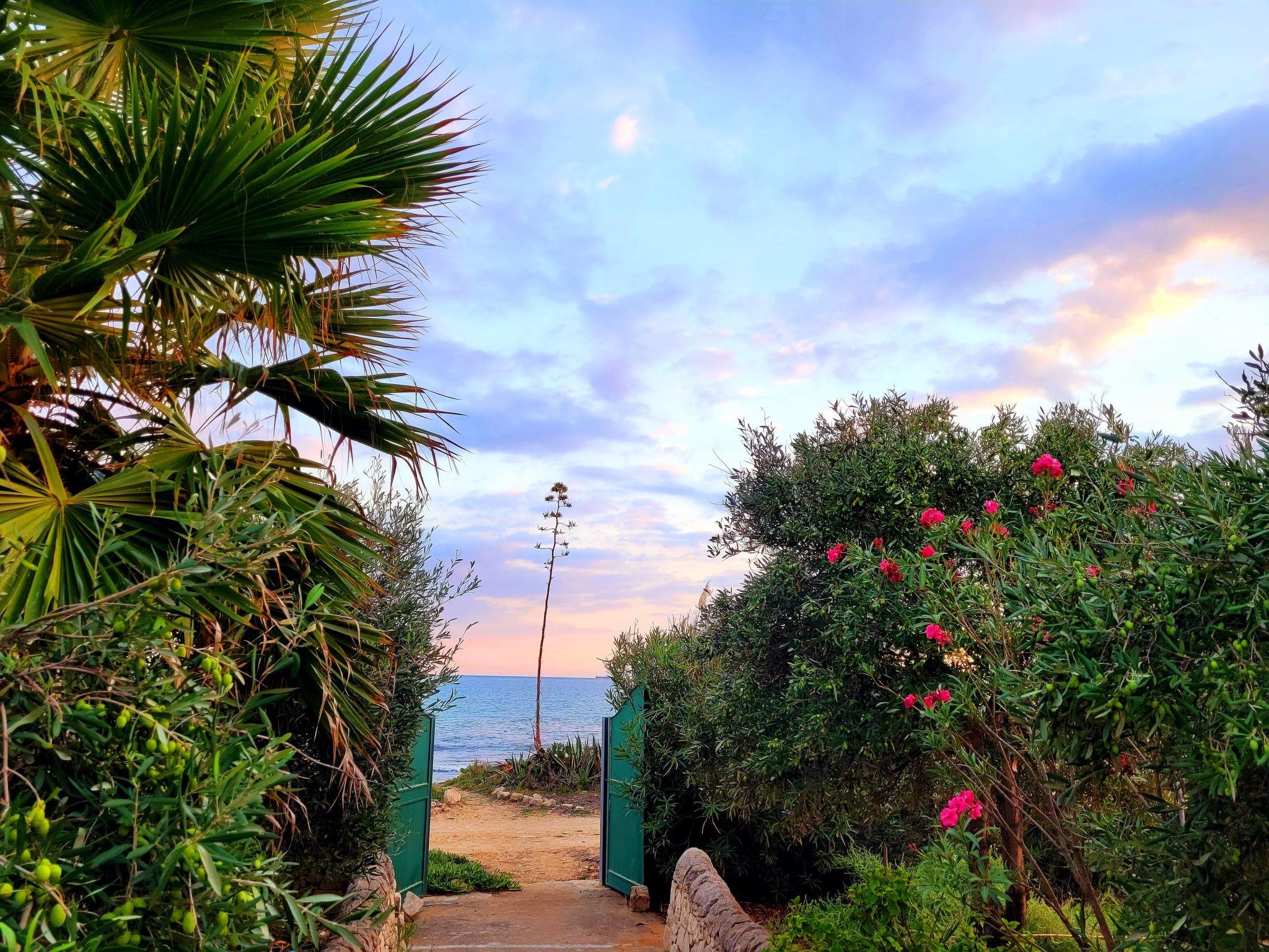 The Mediterranean garden, where the holiday flat and two other holiday houses are located, borders on a shallow, sandy rocky reef. You can reach it directly through the garden gate.During a walk through the green park, one encounters flowering oleander bushes, apricot and medlar trees, whose delicious fruits can be enjoyed in late spring, small and large palms, almond and numerous olive trees, cacti, agaves, and much more.The shallow rocky sandy coast in front of the park is almost a private house-beach, which, even in the busy high season, is not very frequented. Here you can enjoy the peace and idyll, let yourself be pampered by the sun during the day and watch the sunset in the evening with a glass of red wine.Only 2 minutes by car from the holiday home are beautiful dune beaches and romantic bays.During the summer months, various fruit, vegetable and cheese trucks come directly to the garden. At this time, the baker also comes and brings fresh bread, biscuits and croissants directly in front of the holiday home every morning.