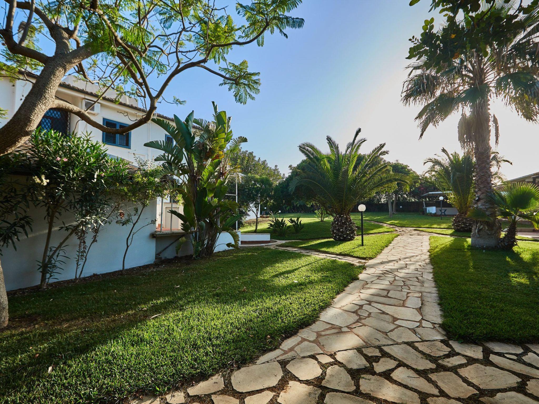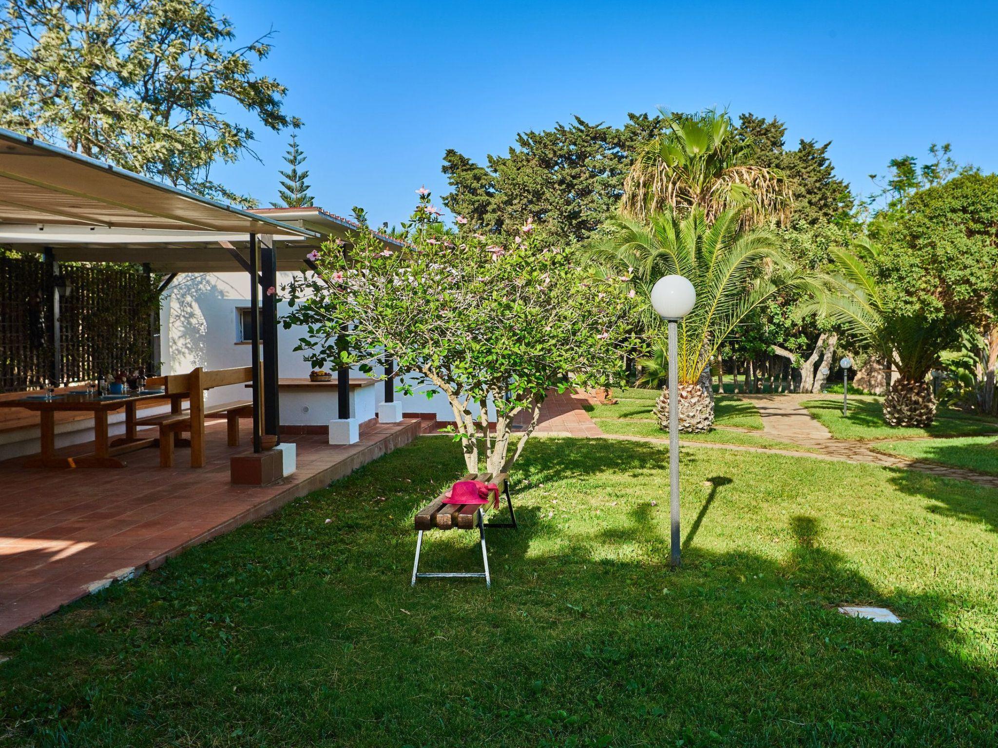 Leaving the room where there is the large table, there is a patio of about 50 square metres furnished with polirattan lounges and a table for 20 people where you can dine in the evening enjoying the coolness of the park. As soon as you pass through the entrance gate you have the feeling that you have arrived in a wonderful place, at guests' disposal there is a 10,000 square metre lawn, decorated and embellished with palm trees and centuries-old carob trees as well as many other species of Mediterranean plants. The park is criss-crossed with lanes of local white stone so that it already looks like a painting. Then we find a gazebo with a very large wooden table for sitting at the barbecue and in the immediate vicinity bordering on another area where there is a nice table tennis table, and further on, to the delight of the little ones, there is a small recreation area. Continuing the walk, we come to the centrepiece of the park, a large inregular swimming pool and all around sun loungers with sunshades and 2 round wrought-iron tables with chairs so that you can spend days in absolute relaxation. About 15 metres away is a semi-covered terrace with sails and furnished with polirattan loungers, all adjacent to the kitchen.