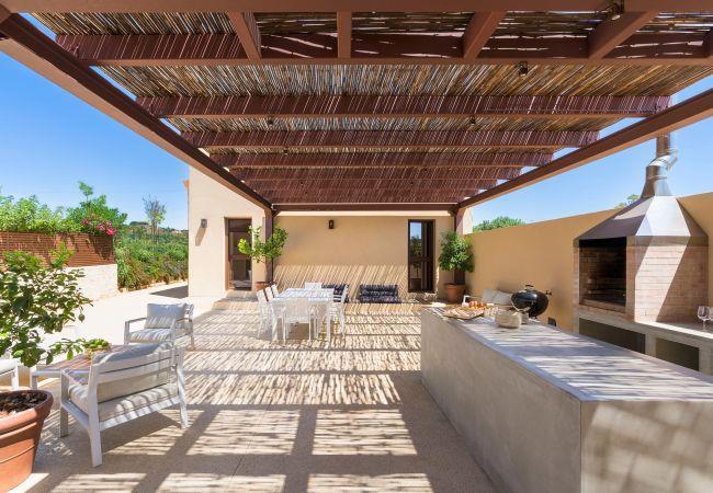 Patio with pergola (relaxation area, barbecue and dining area), terraces, garden, swimming pool.