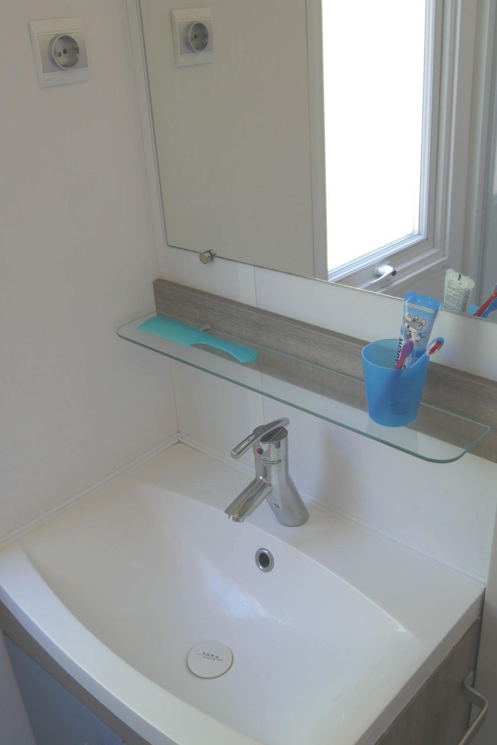 "Happy Comfort", 3-room mobile home 25 m2. Practical furnishings: living/sleeping room with 1 sleeping facility (120 cm, length 200 cm), dining table, electric heating and air conditioning. 1 room with 1 french bed (140 cm, length 190 cm). 1 room with 2 beds (70 cm, length 190 cm). Open kitchen (4 hot plates). Shower/WC. Air-conditioning (extra). Terrace partly roofed. Terrace furniture, electric barbecue (portable), deck chairs (2). Facilities: mosquito net. Parking (1 car) at the house. Please note: non-smokers only. IT056035B1GG3W5URK