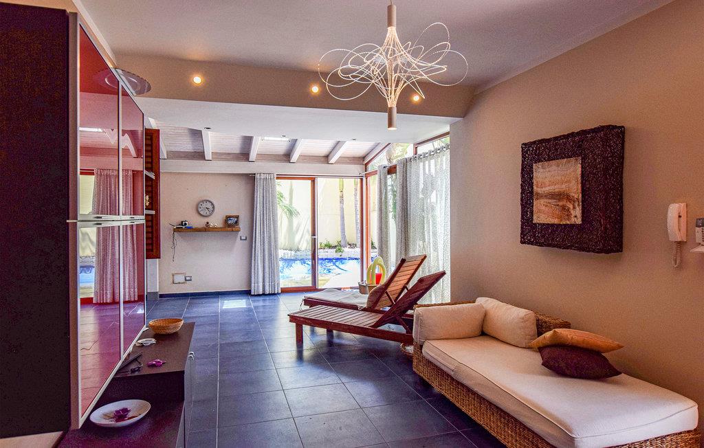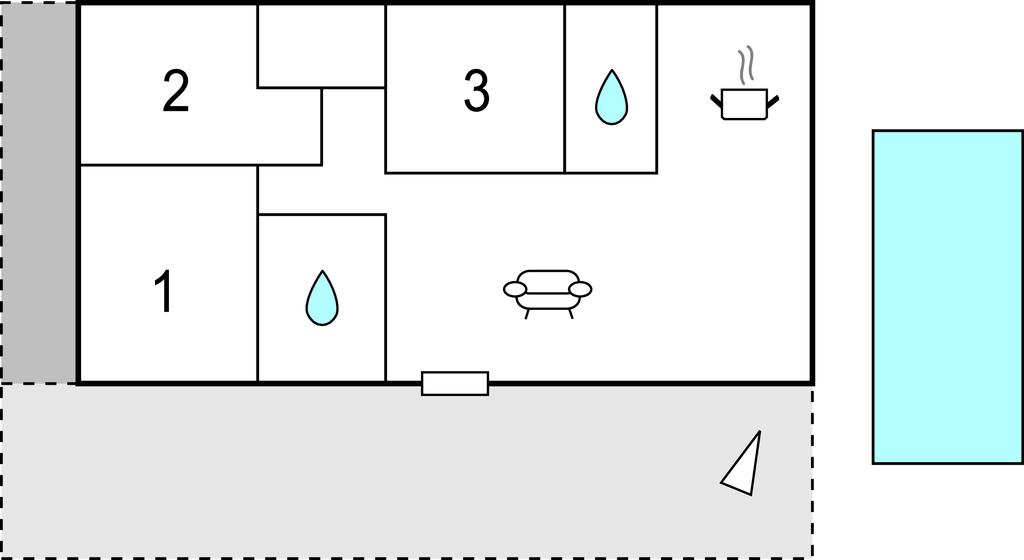 Huset har en solrig udendørs veranda, et siddeområde udstyret med havemøbler og en pool (dybde 1,20 m - 2,40 m) med et hydromassagehjørne til to personer samt en udendørsbruser.
