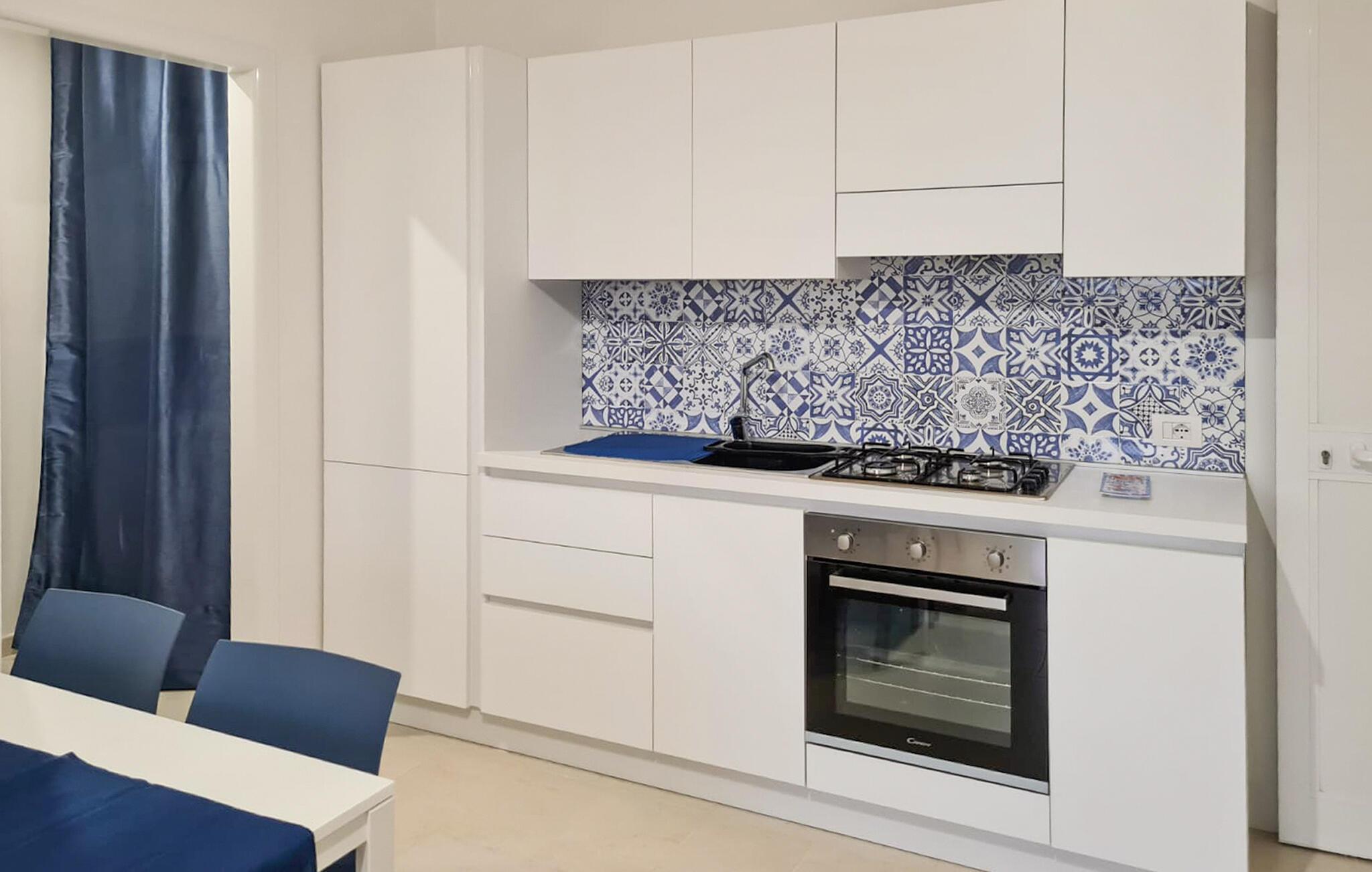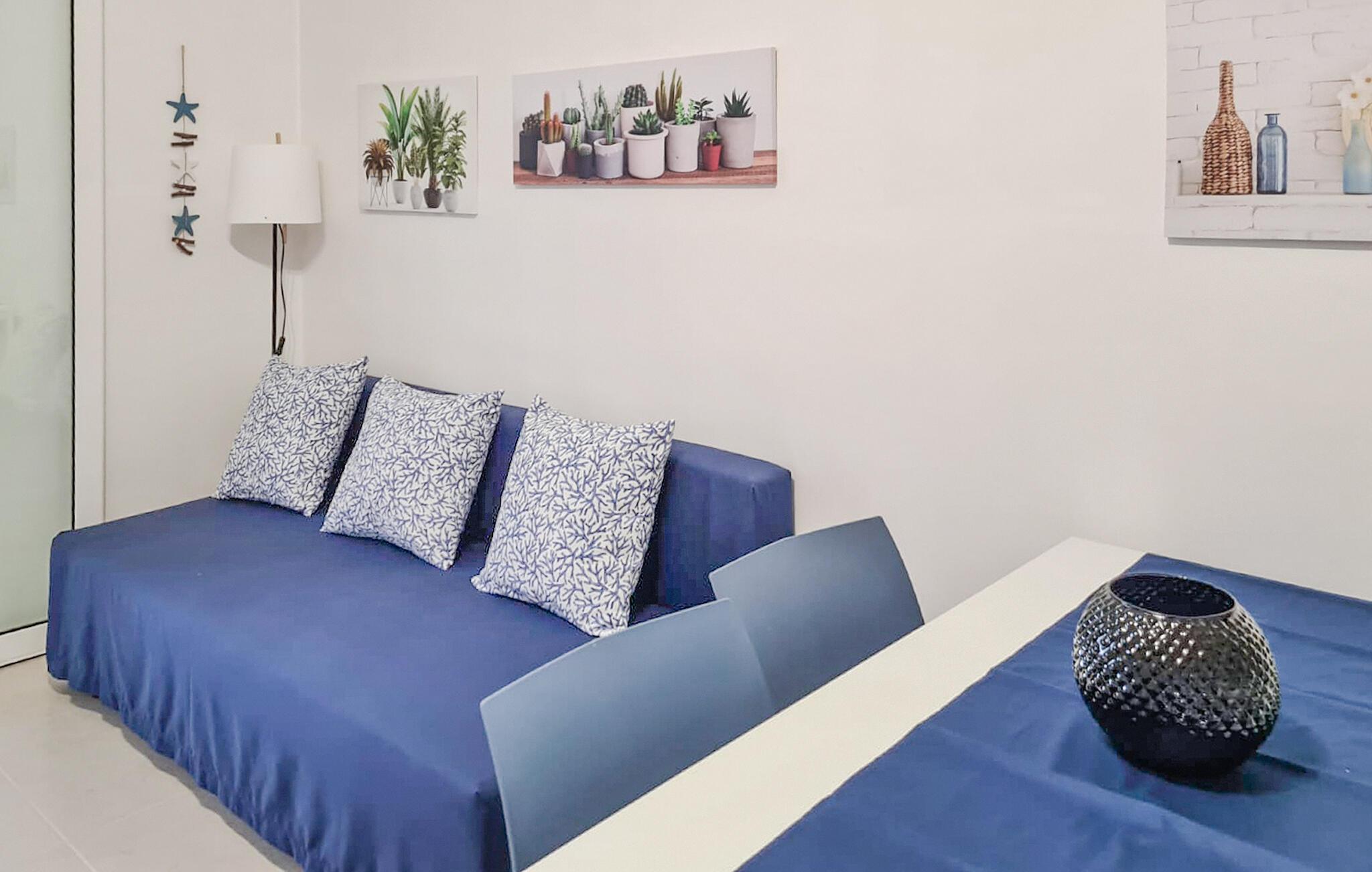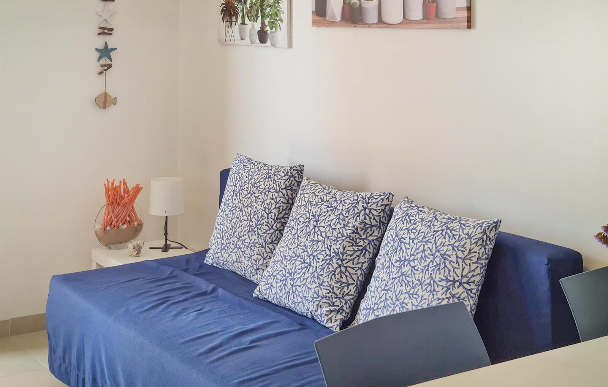 Denne smukke ferielejlighed har en harmonisk, maritim farveskala og en hyggelig atmosfære, der straks skaber feriestemning. Den lyse opholdsstue lægger op til omgængelige timer, mens det veludstyrede køkken giver jer mulighed for at tilberede friske regionale specialiteter. Nyd jeres måltider på balkonen med en fantastisk havudsigt, og lad middelhavsbrisen forkæle jer - det perfekte sted at slappe af efter en solrig dag på stranden.