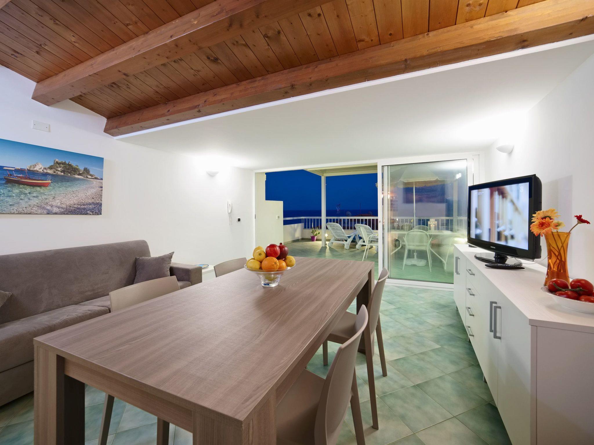 The living room is very bright and panoramic thanks to large glass walls overlooking the terrace and is furnished with a dining table, TV and sofa bed.