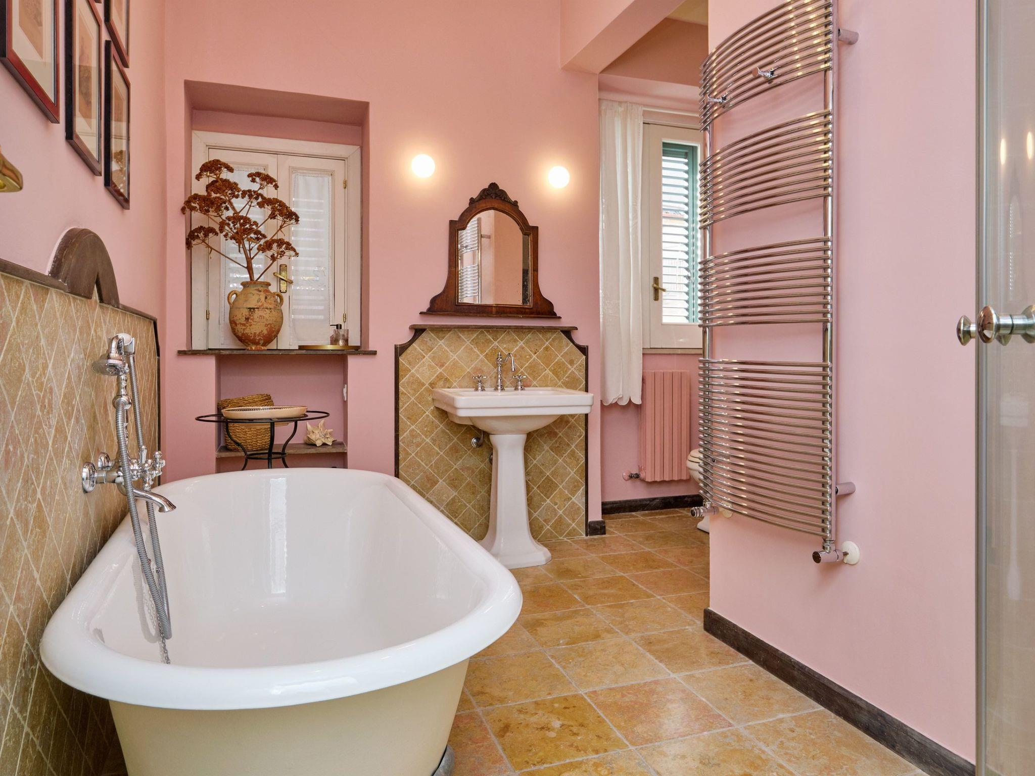 One bedroom, with a double bed and access to the terrace, has a walk-in wardrobe.