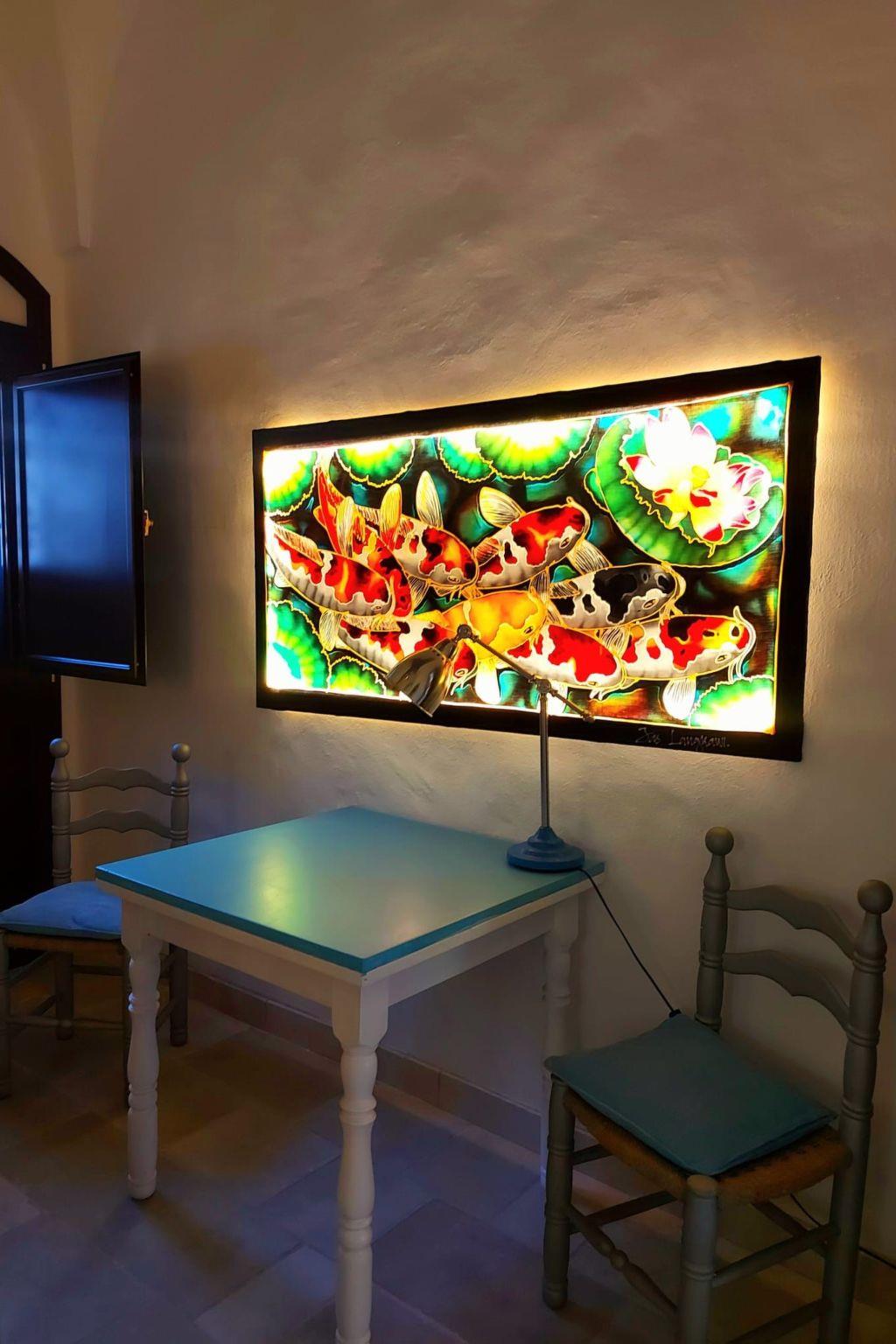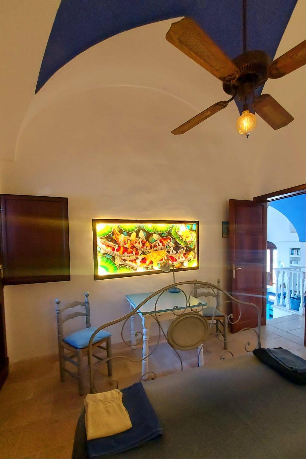 The villa has a stylish decor and provides wireless Internet access, a stereo system and a TV with a satellite receiver. There is a big living room with a dining table and a sofa, as well as a rocking chair. An open fireplace creates a rustic and cosy atmosphere. There is one bedroom with a double bed and another bedroom with a double bed and two single beds. The kitchen has a gas stove and an oven, a dishwasher and everything you need for preparing meals. The bathroom comprises a free-standing bath, a shower and WC. The interior is functional and especially the bathroom has an original décor. Air conditioning is available.