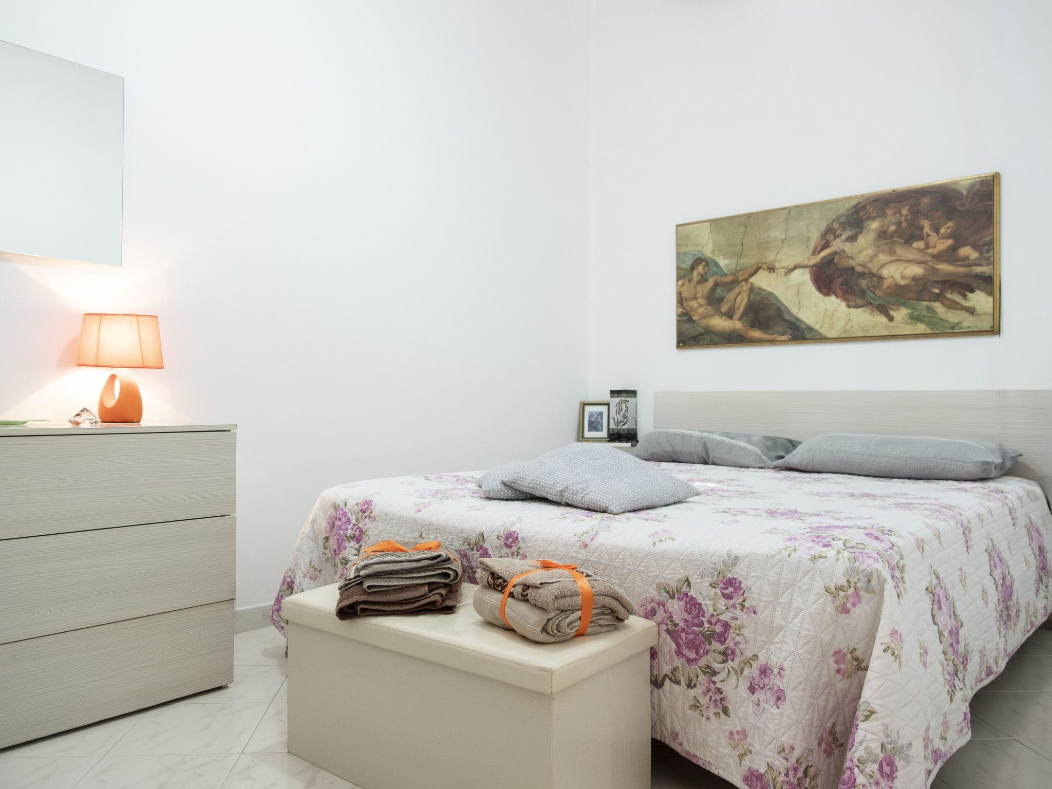 The double bedroom is a real jewel of comfort, with an ergonomic mattress that guarantees nights of regenerating rest. Bedside tables with lamps, wardrobes and spacious drawers for storing your personal belongings complete the furnishings. A touch of class is provided by the beautiful painting reproducing Michelangelo's Creation of Adam, positioned above the headboard of the bed. The room is air-conditioned to ensure maximum comfort even on hot Sicilian summer days.