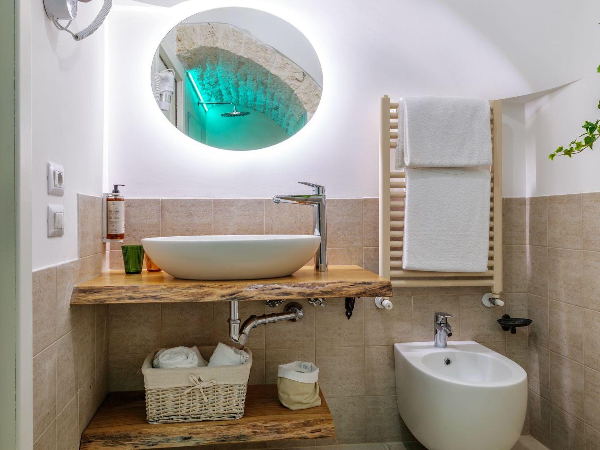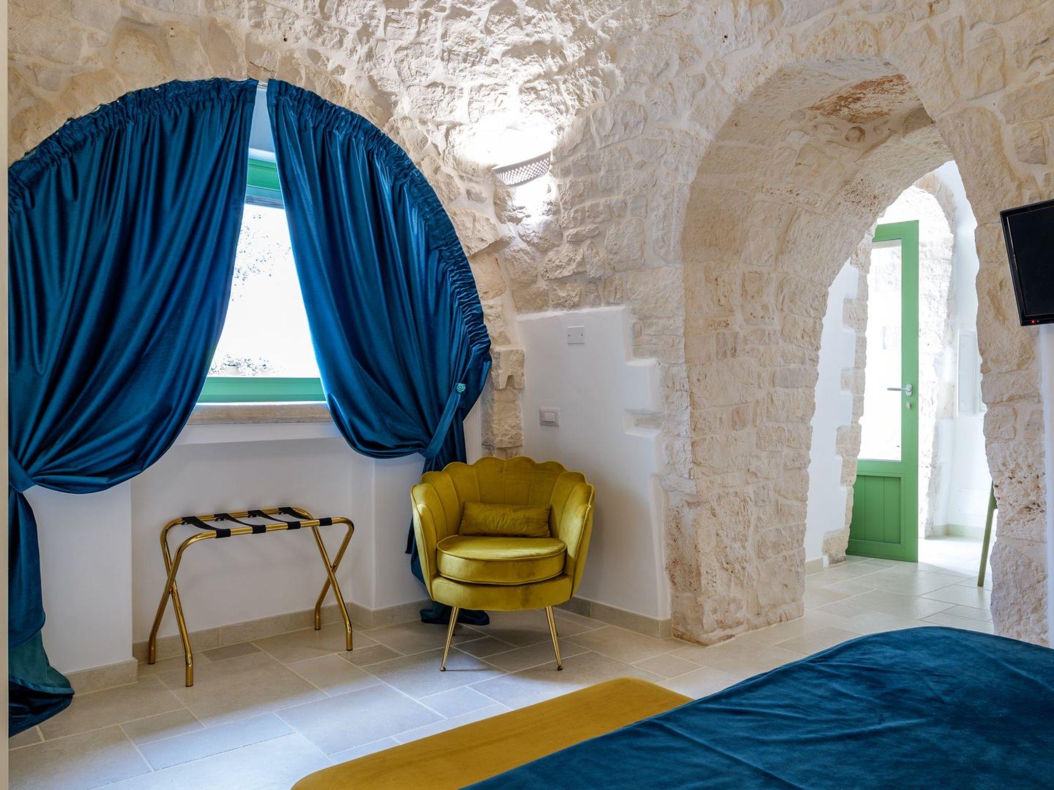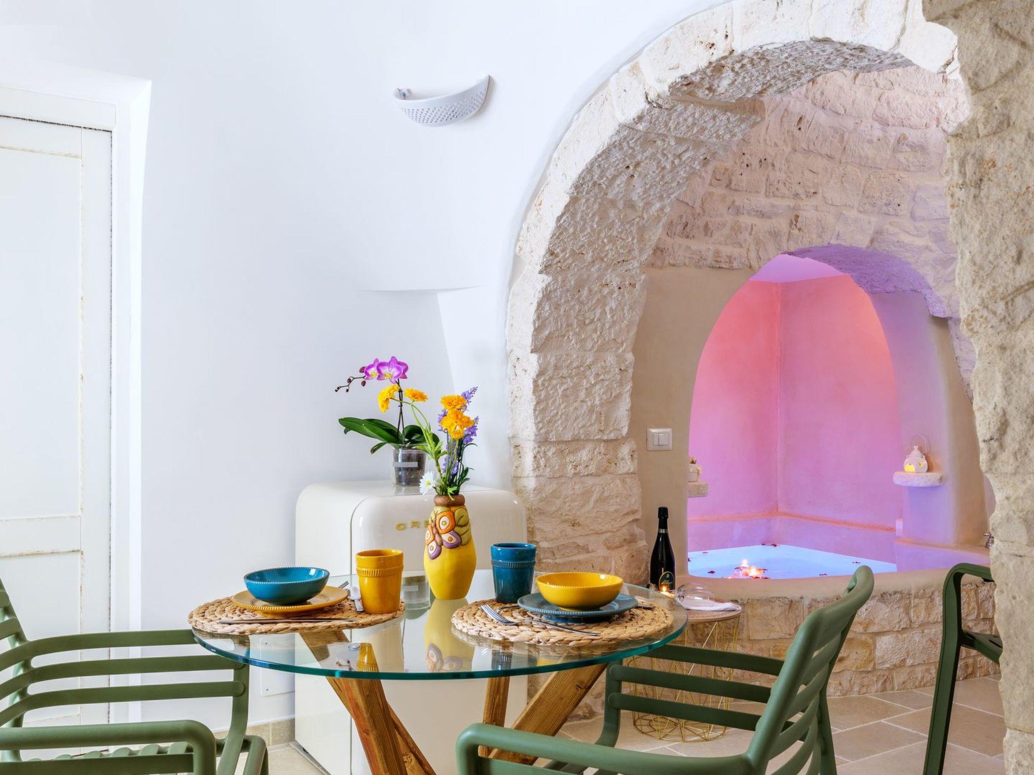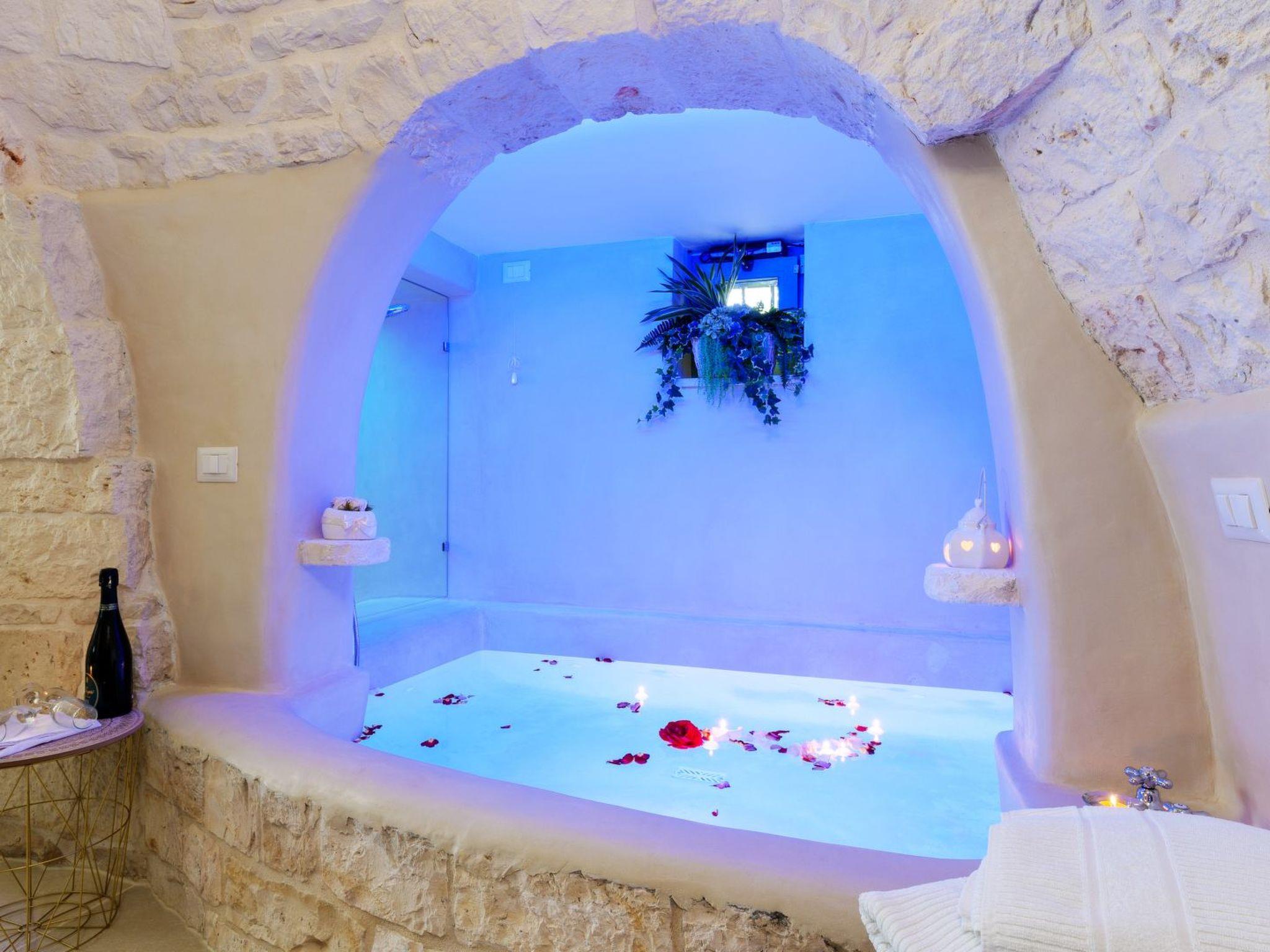 The 'Palmento' trullo, recently renovated into a romantic suite, consists of an entrance hall, double bedroom, bathroom with shower and stone hydromassage tub, and relaxation corner.