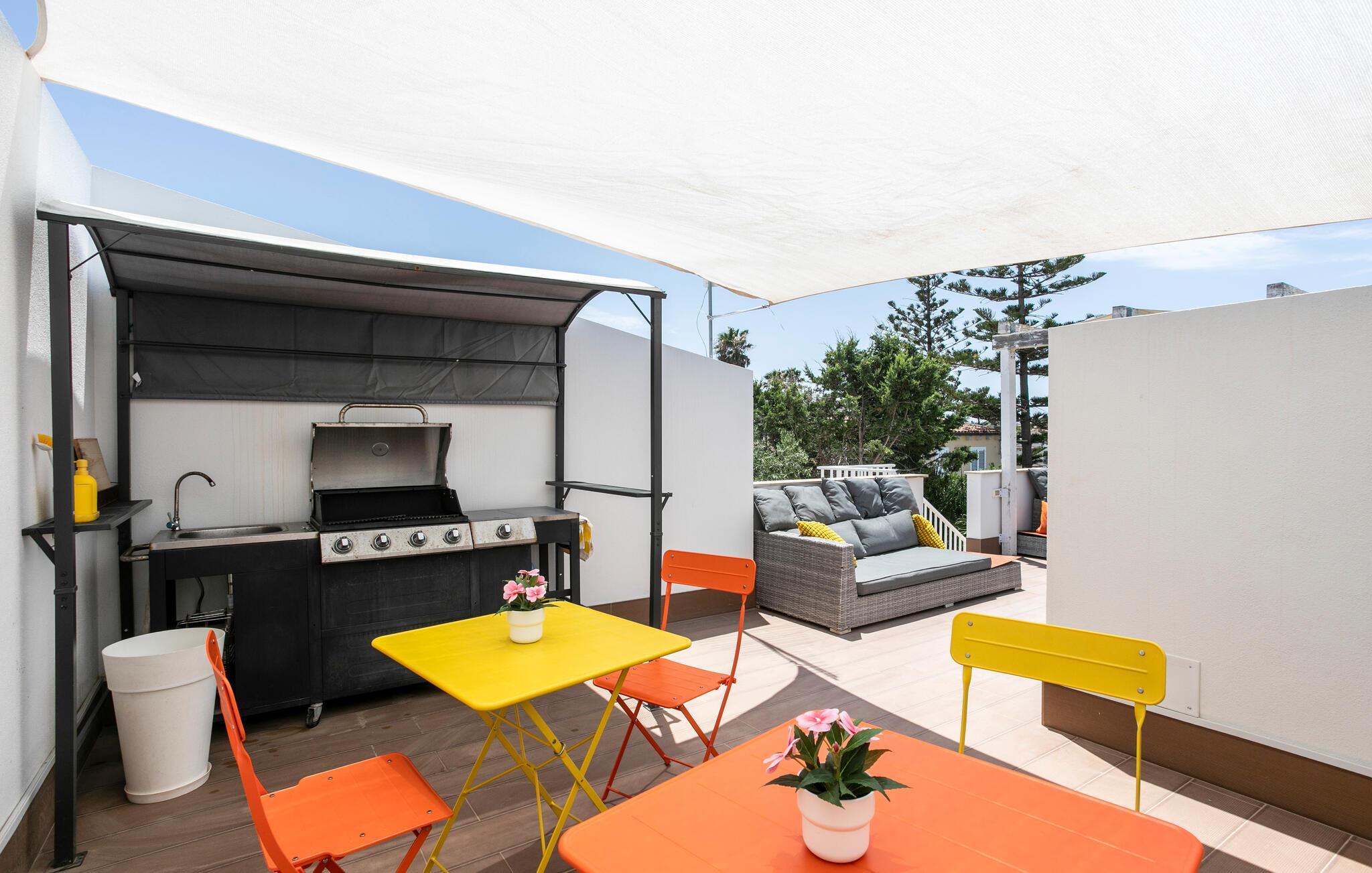 Det smukt designede udendørsområde er perfekt til at nyde det vidunderlige middelhavsklima når som helst på dagen. Start jeres dag med en afslappet morgenmad på terrassen, forkæl jer selv med en forfriskende drink på komfortable havemøbler efter en svømmetur i havet, slap af i spabadet ved solnedgang, og tryl lækre måltider frem på grillen.