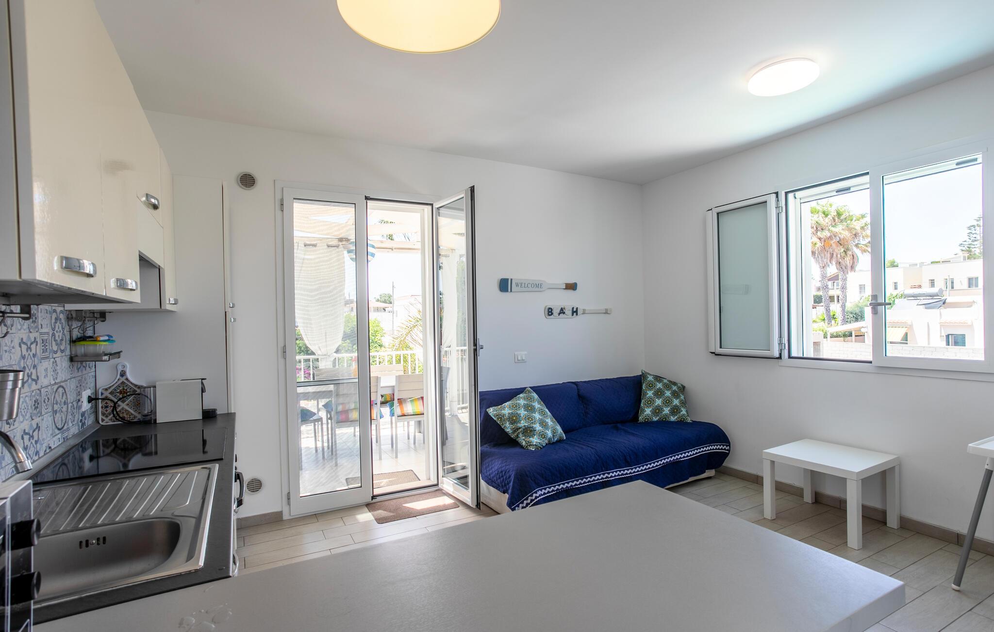 Denne lyse og luftige ferielejlighed byder jer velkommen kun få skridt fra stranden. Tilbered middelhavsretter, og nyd afslappede måltider i en venlig atmosfære. Planlæg jeres dag i jeres eget tempo, og efter lange timer under den blå himmel kan I slappe af med en spilleaften.