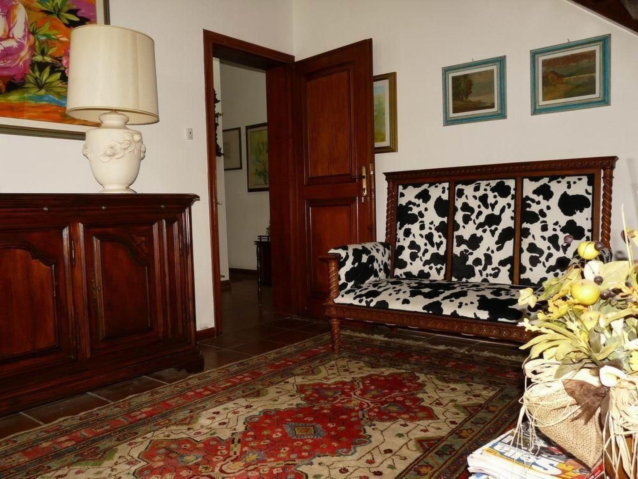 Spacious and bright living room with satellite TV, a large dining room, a small and a large kitchen (oven, 3 fridges with freezer, dishwasher, toaster, kettle, coffee machine, microwave), laundry room and a large covered terrace, ideal for outdoor dining, with access to the garden. A bathroom with shower. A beautiful carved wooden staircase leads to the first floor, with balcony and mountain views.