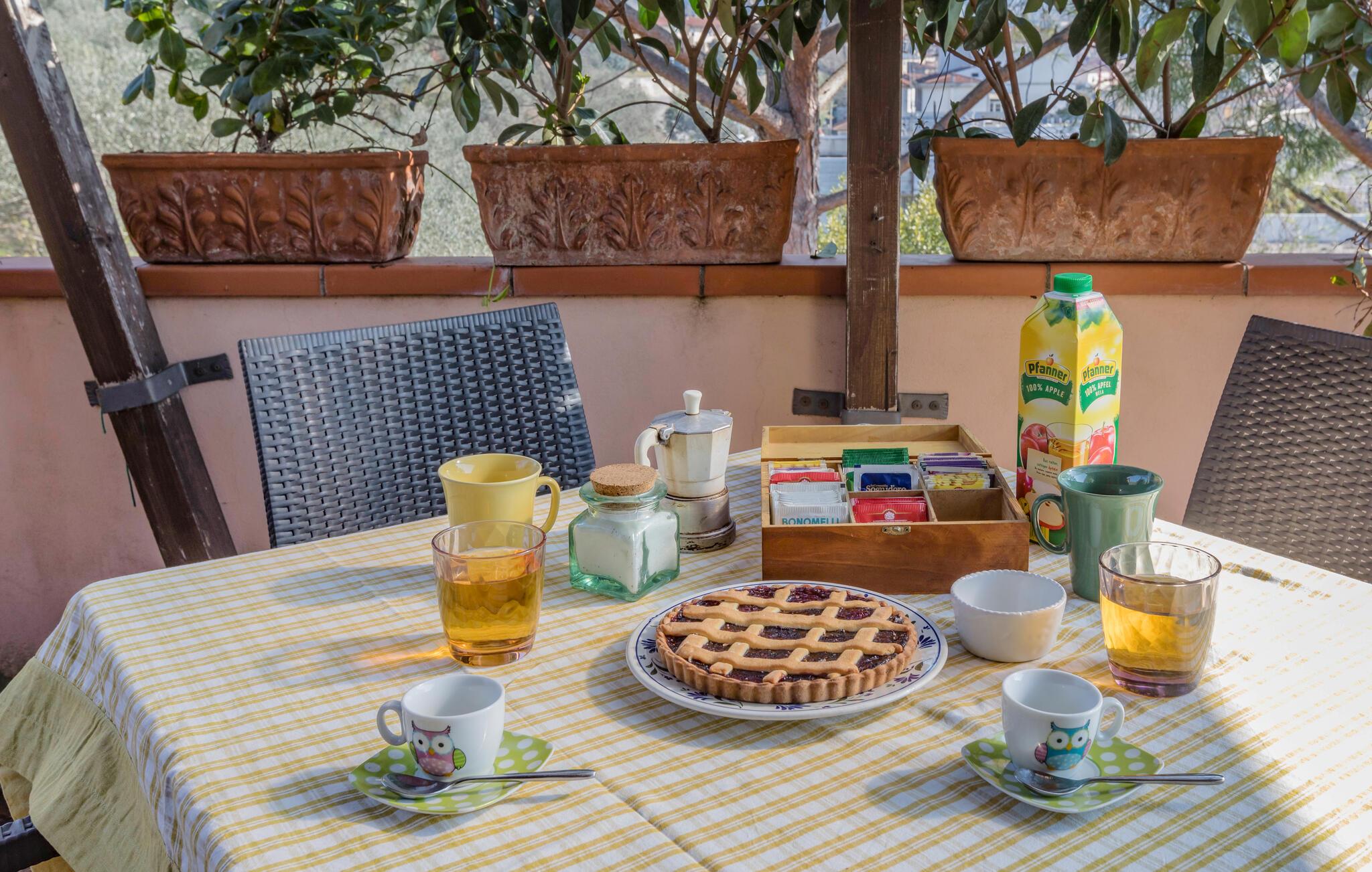 Træd ud i den smukke have om morgenen med en duftende kop kaffe og nyd det bløde morgenlys og de frodige grønne områder, der omgiver jer. Nyd en afslappet morgenmad og fordyb jer derefter i jeres ferielæsning. Om aftenen inviterer terrassen jer til at afslutte dagen sammen med et godt glas italiensk vin.