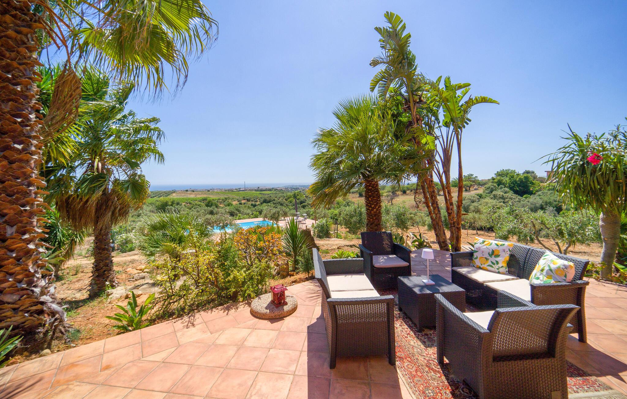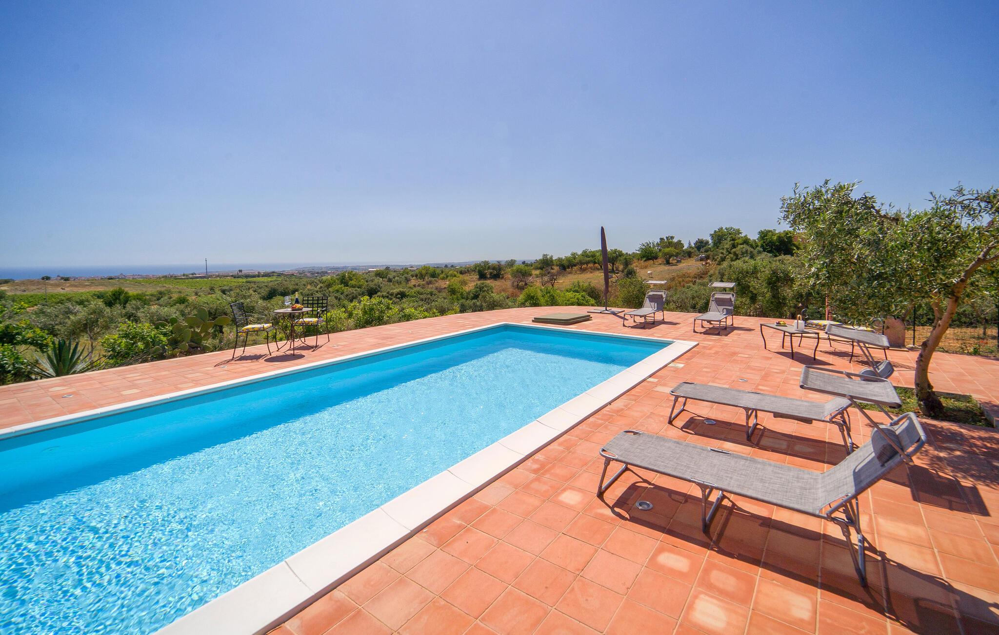 Udendørs venter et sandt højdepunkt: En rummelig terrasse, omgivet af palmer og middelhavsplanter, lægger op til at nyde et glas vin om aftenen, mens I nyder den betagende panoramaudsigt over Menfi og havet og lægger hverdagen bag jer. Den store pool tilbyder ikke kun forfriskende dukkerter, men også en betagende havudsigt - ideel til solrige dage og stemningsfulde aftener. Slap af sammen på de komfortable loungemøbler eller nyd et måltid under åben himmel.