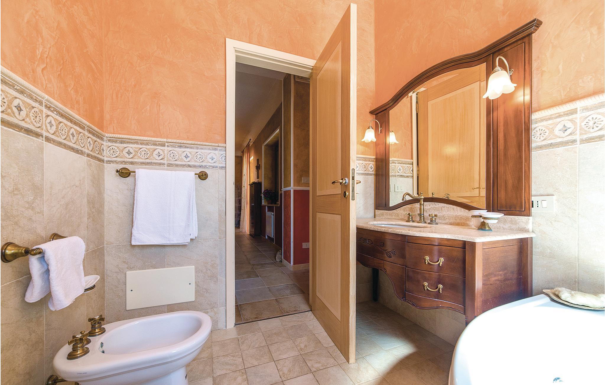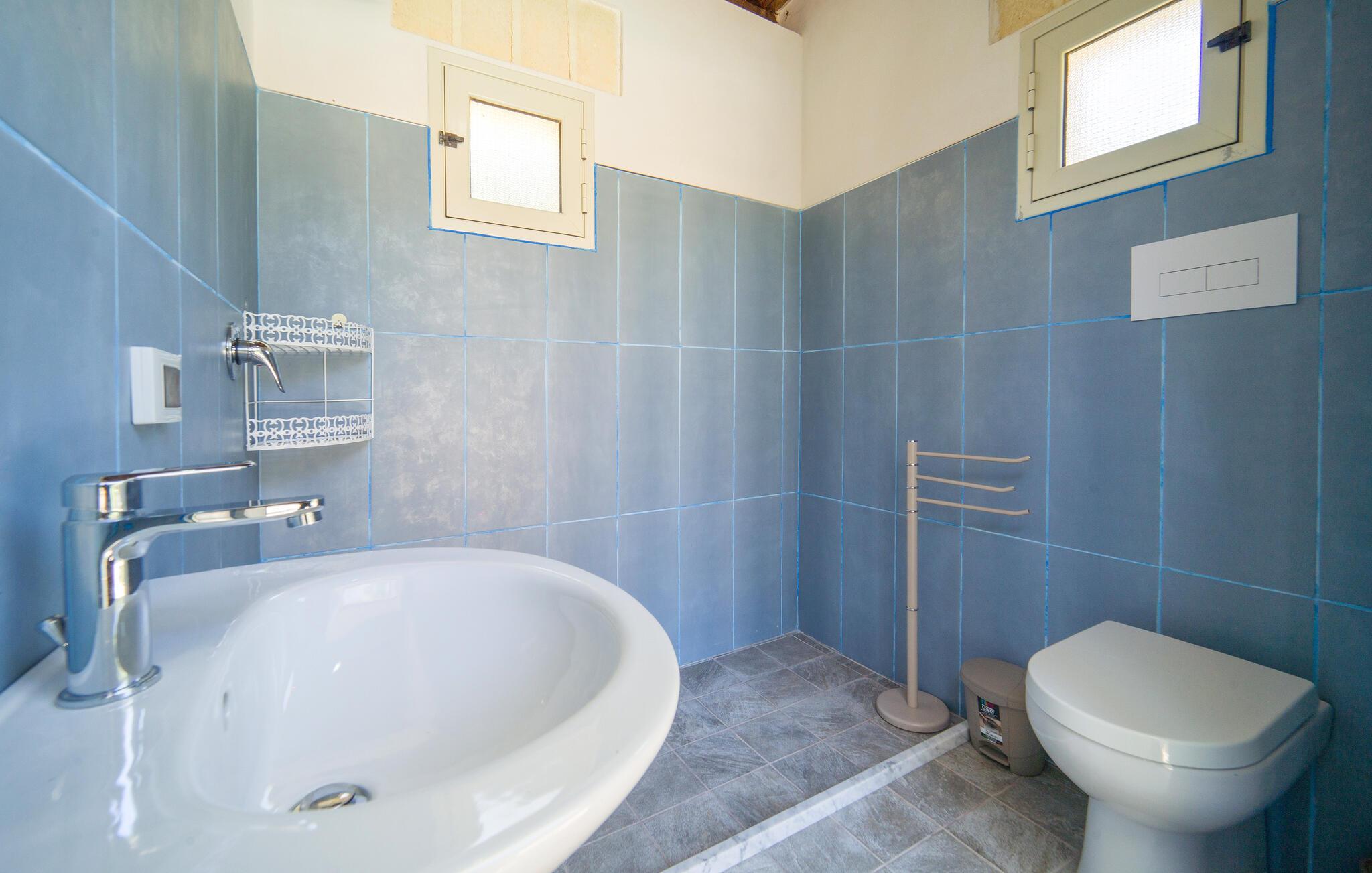 Et af badeværelserne er udstyret med boblebad, det andet badeværelse har brusebad. Der er også et boblebadområde til 4 personer i poolen, og familiens yngste kan glæde sig til at plaske rundt i børnepoolen.