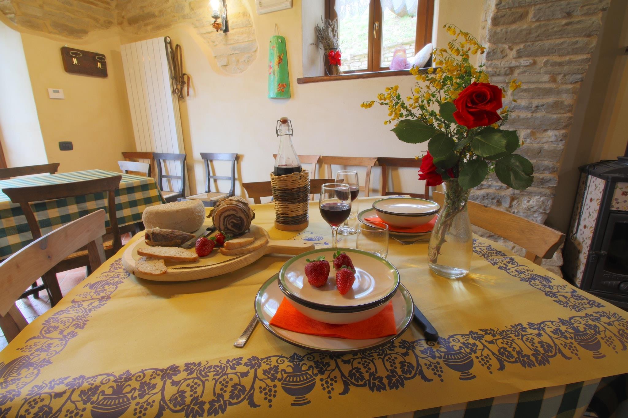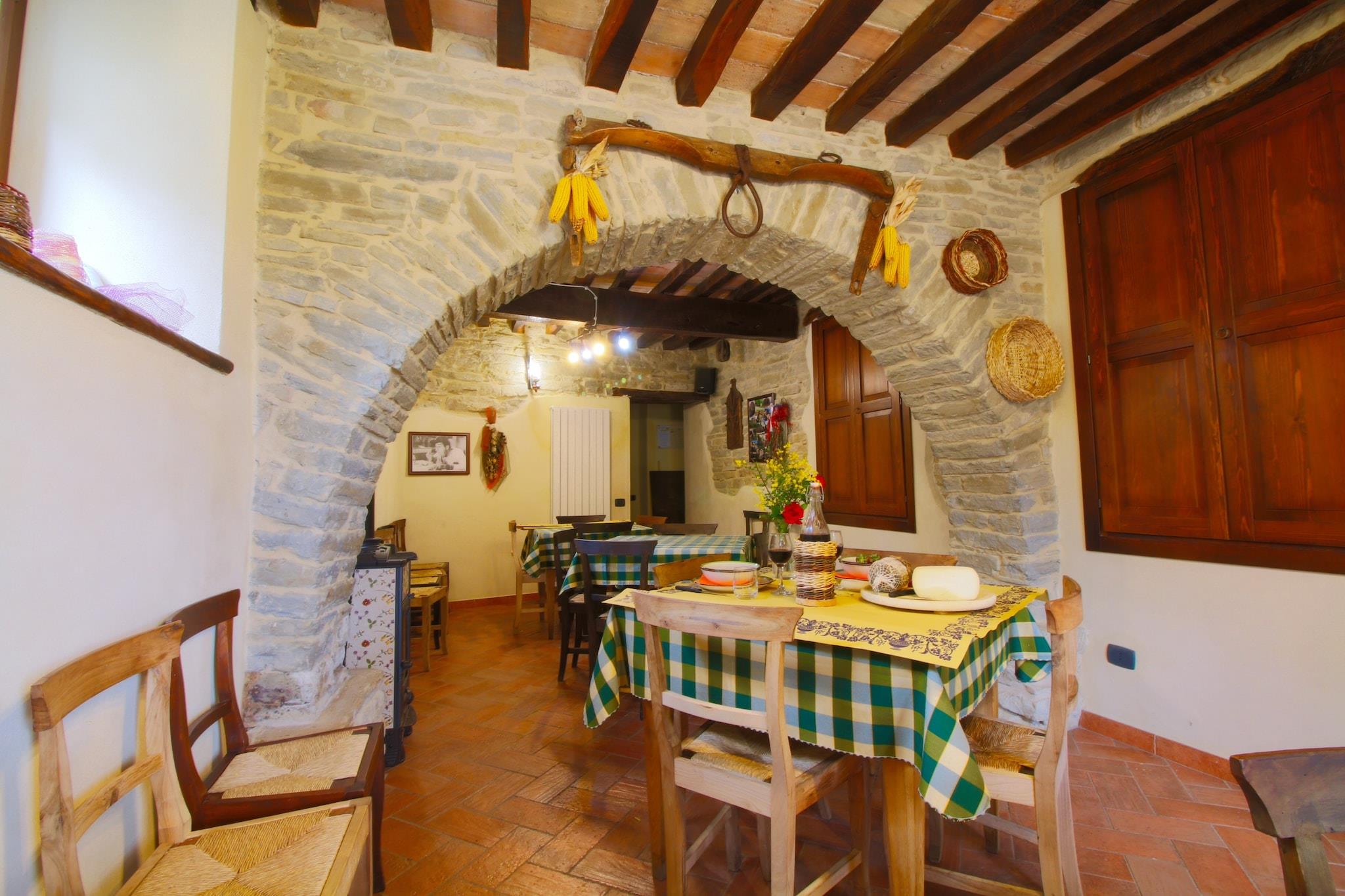 Denne gård går tilbage til det fjortende århundrede og ligger i Mercatello sul Metauro på grænsen mellem Umbrien og Toscana. Agriturismo er beliggende i bakkerne nær Massa Trabaria, et afskårne af Apenninerne. Fra agritourismen har du en smuk udsigt over enge og skov. Den gamle gård er blevet renoveret og der er 3 lejligheder til gæster. Sole lejlighed har et rummeligt køkken med en stor pejs. Dobbeltværelserne er rummelige og elegant indrettet med smedejern senge og antikke garderobeskabe. Atmosfæren er hyggelig og rustik. Der er en dejlig swimmingpool, bowlingbane og et sted hvor du kan bueskytte. Og i restauranten, der kun er åben for gæster på agriturismo, kan du prøve det lokale køkken. Restauranten tilbyder hjemmelavet pasta, focaccia, pizza, kød fra deres egen gård og sæsonbetonede produkter på menuen. I dette agriturismo kan du nyde naturen, poolen, regionen og restauranten. Farmhus i bakkerne, smuk udsigt, swimmingpool og autentisk restaurant This house is suitable for 4 adults and 4 minors, not for 8 adults