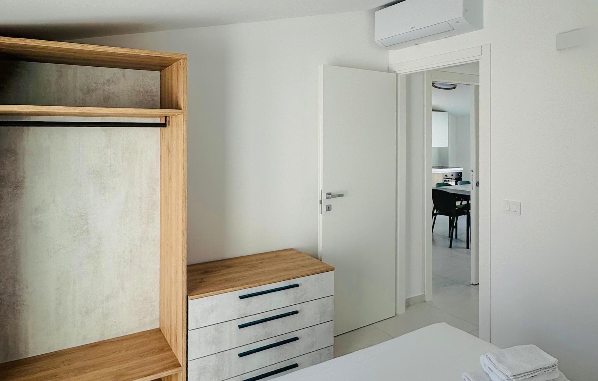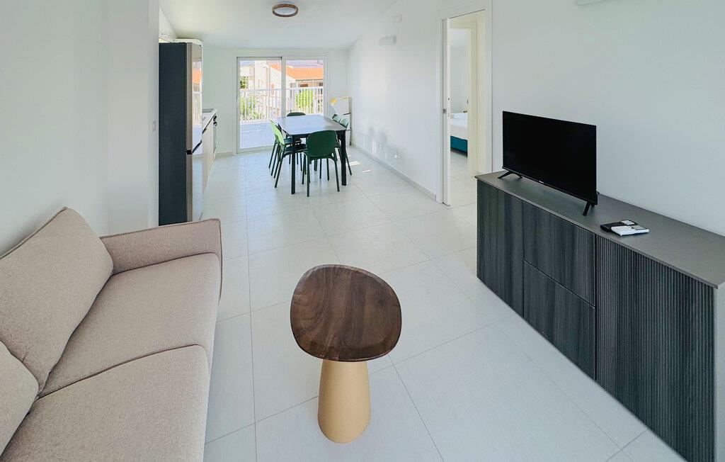 Denne moderne lejlighed på første sal er noget særligts rene linjer og masser af lys. Den åbne stue og spisestue med integreret køkken tilbyder en lys og indbydende atmosfære og er udstyret med alt, hvad I behøver for et behageligt ophold.