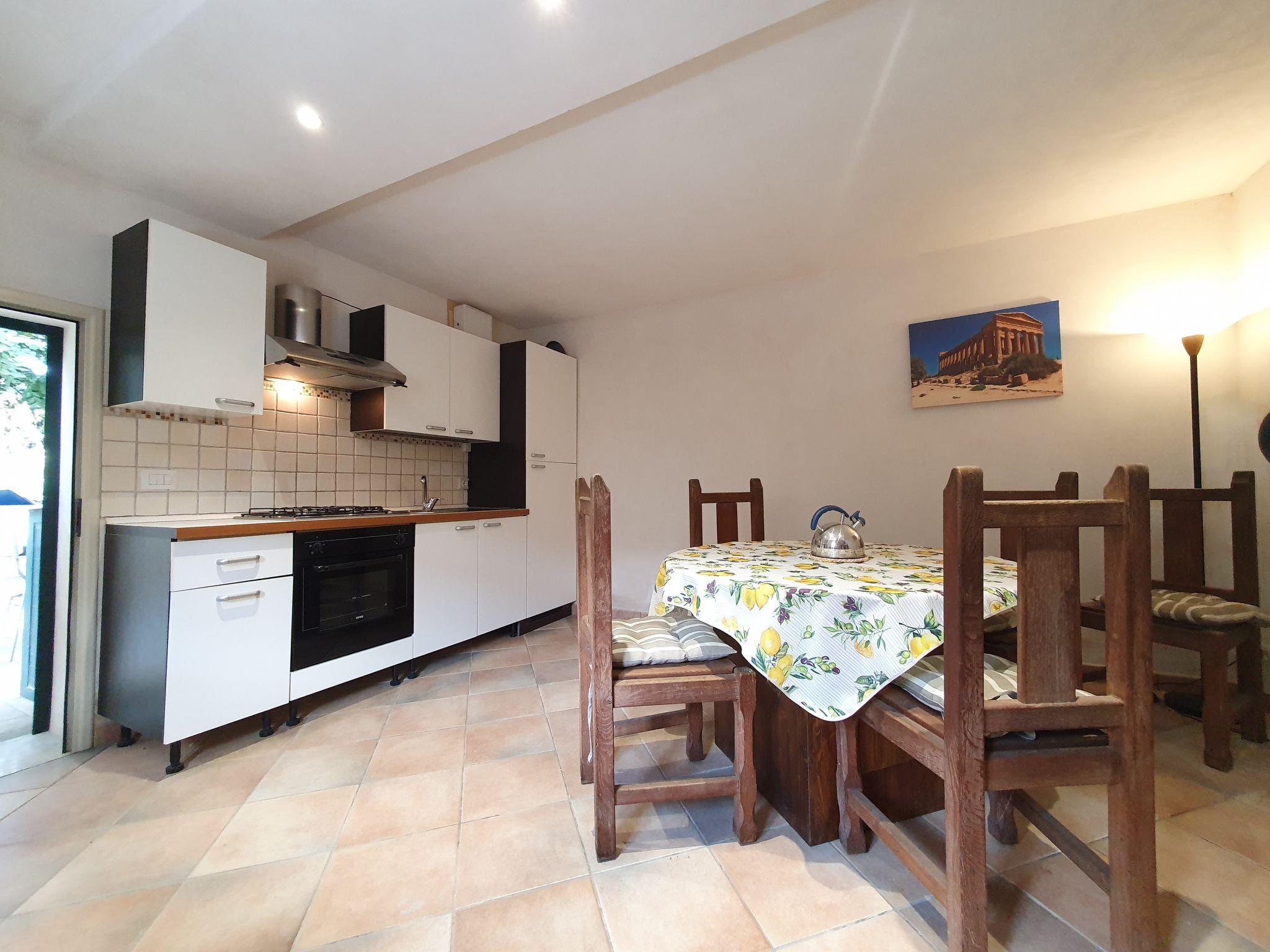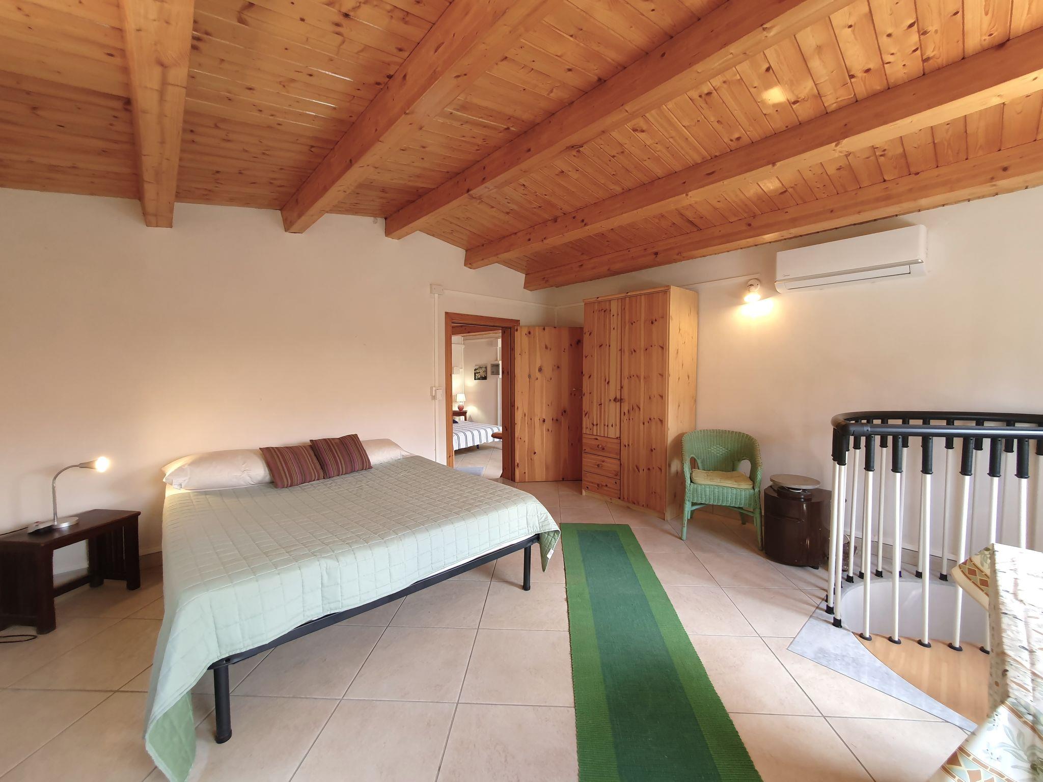 "Casa Paolina", 3-room semi-detached house 116 m2 on 2 levels, on the ground floor. Practical and comfortable furnishings: kitchen-/living room (4 hot plates, oven, toaster, kettle, microwave, electric coffee machine) with dining table, air conditioning and forced-air heating. Exit to the garden, to the terrace. Upper floor: (spiral staircase) small lounge. 1 double bedroom with TV, air conditioning, fan and forced-air heating. 1 room with 2 beds, air conditioning and forced-air heating. Shower/WC. Heating, forced-air heating. Terrace 10 m2, roofed. Terrace furniture, deck chairs (2). View of the valley and the resort. Facilities: washing machine, iron, mosquito net, children's high chair, baby cot for up to 2 year olds (extra), hair dryer. Internet (WiFi, free). Please note: maximum 1 pet/ dog allowed. Private entrance, smoke alarm, fire extinguisher, no lift. The pool mentioned in the description is for private use. It is possible to access the room with 2 single beds also via an external staircase. IT088006C2QA9MP7LS