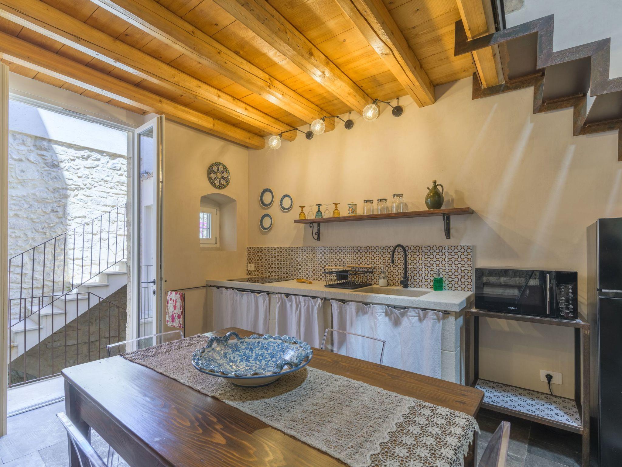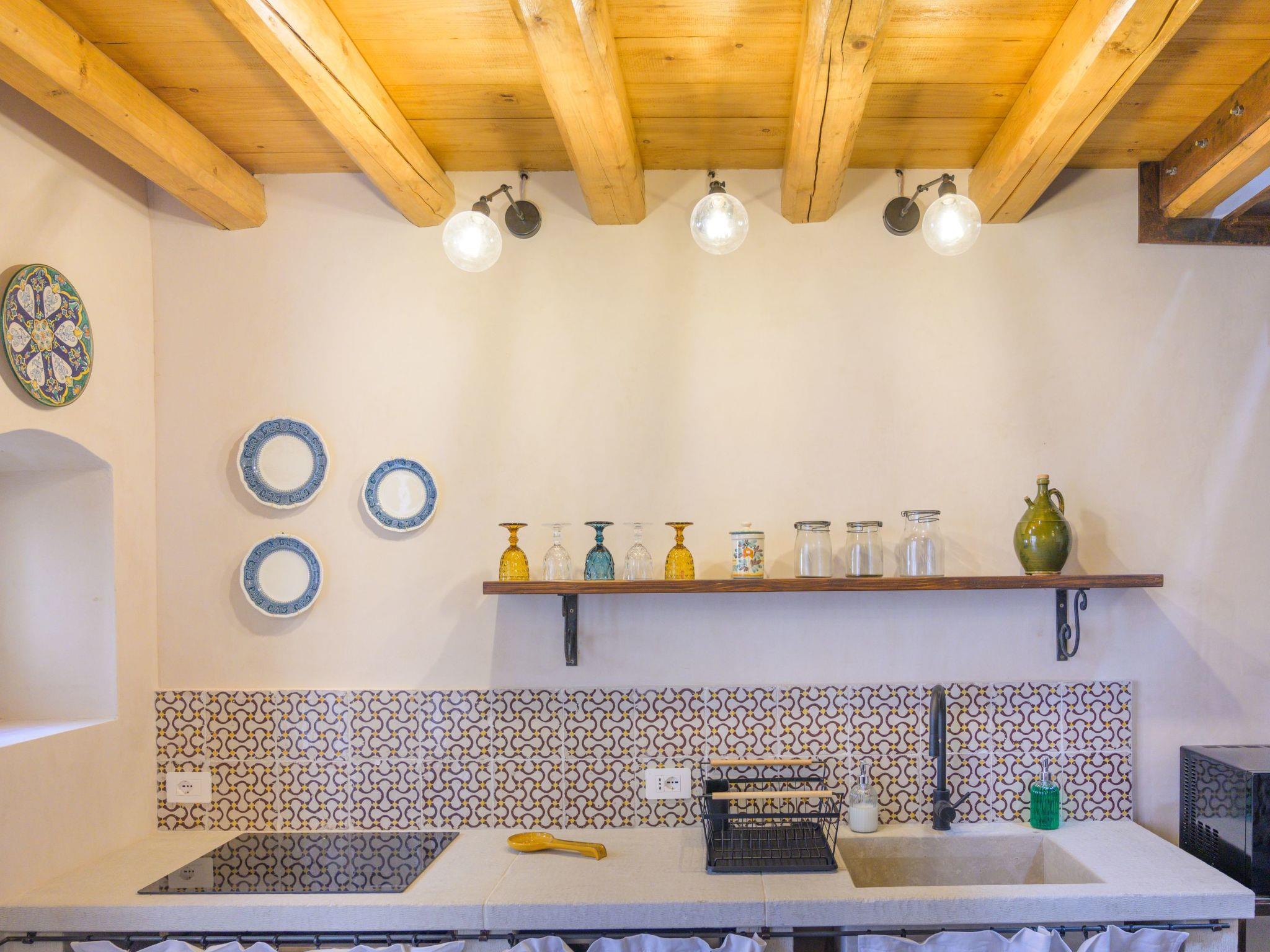 The flat is furnished in an original and refined antique style, with white stone walls, a wooden ceiling and floors in pitch stone and decorated tiles.
