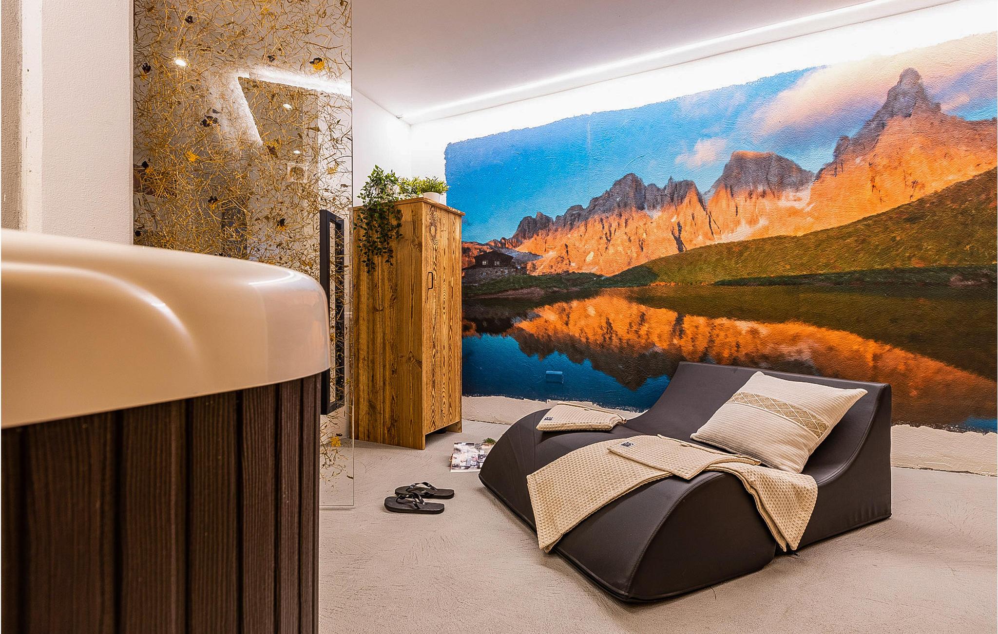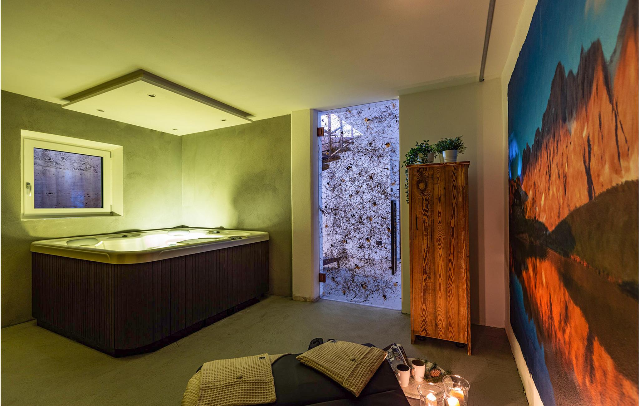 Efter en lang dag i den friske luft kan I tilbringe afslappende øjeblikke i det udendørs spabad og nyde en massage, mens I nyder bjergpanoramaet. Der er endnu et spabad i huset.
