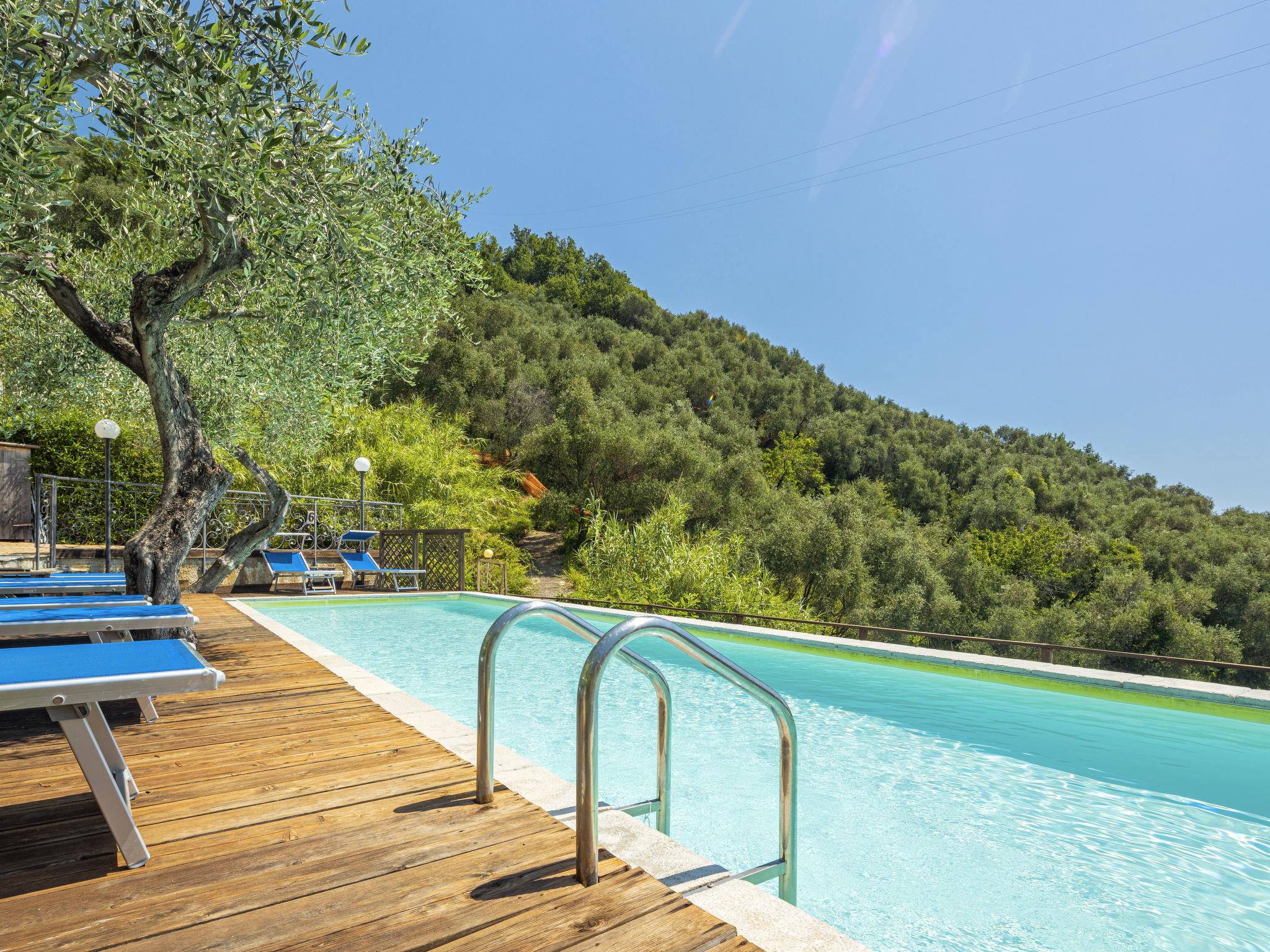 Small residence "I Monili", 3 storeys. 800 m from the centre of Moneglia, 12 km from the centre of Sestri Levante, on a slope, in the residential district, 1 km from the sea. For shared use: property 1'000 m2 with trees, orchard, swimming pool (12 x 3 m, depth 125 cm, seasonal availability: 15.May. - 15.Sep.). Outdoor shower, garden furniture, parking on the premises. Grocery, restaurant, bar 800 m, bus stop 400 m, railway station "Moneglia" 700 m, pebble beach 1.1 km, rocky beach 1.1 km. Please note: car recommended. Residence with electric gates.