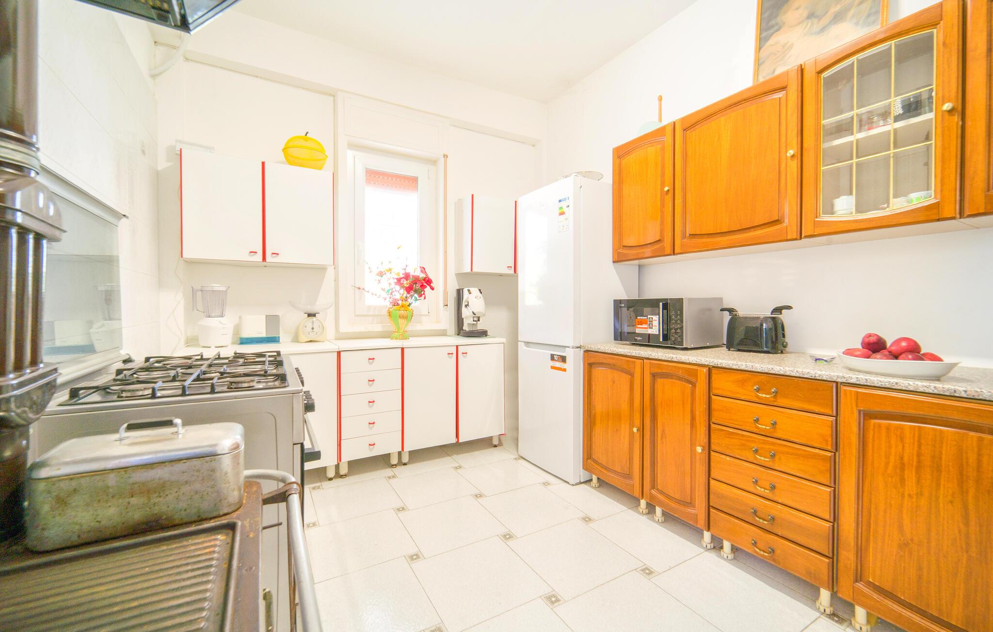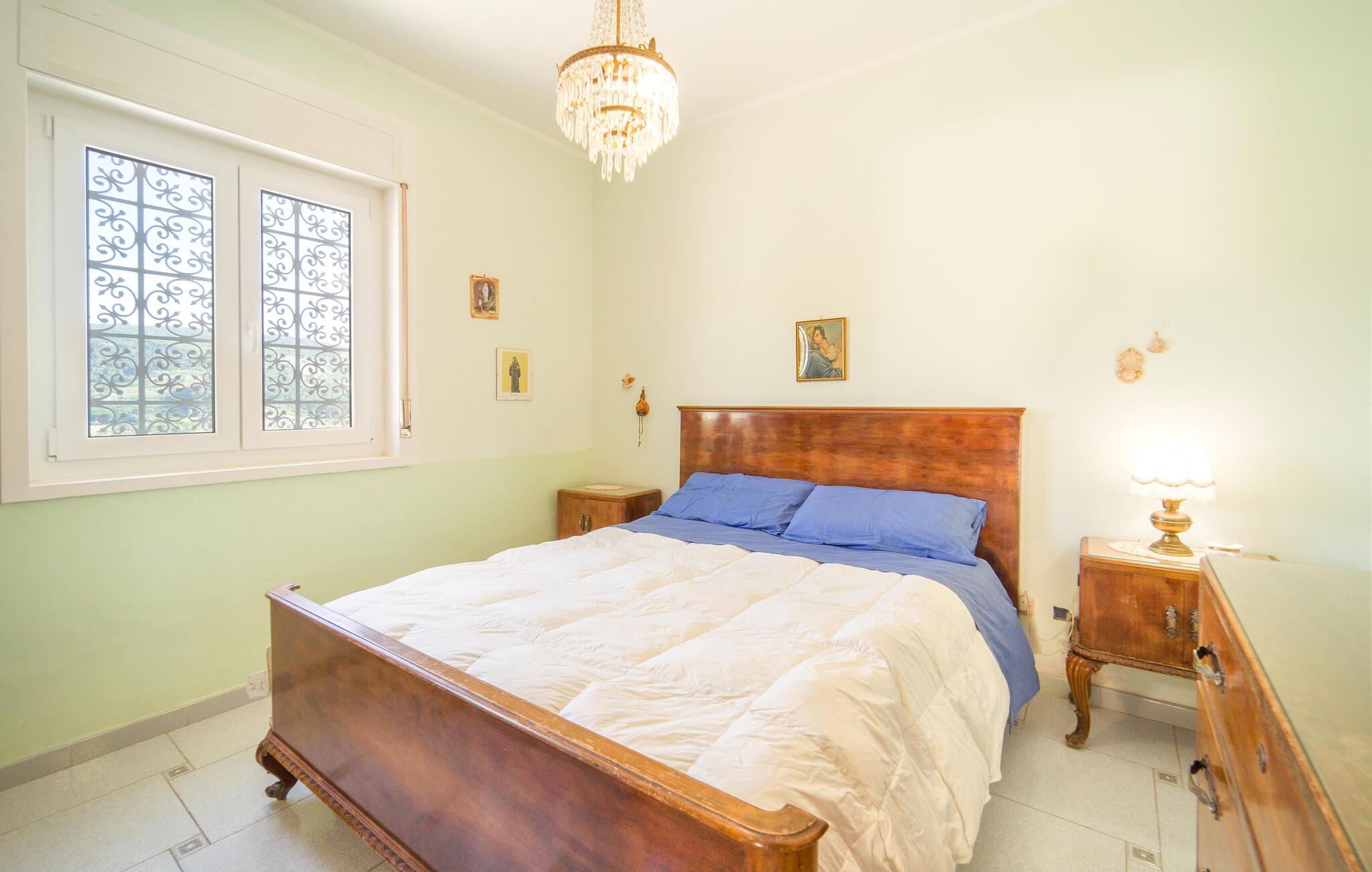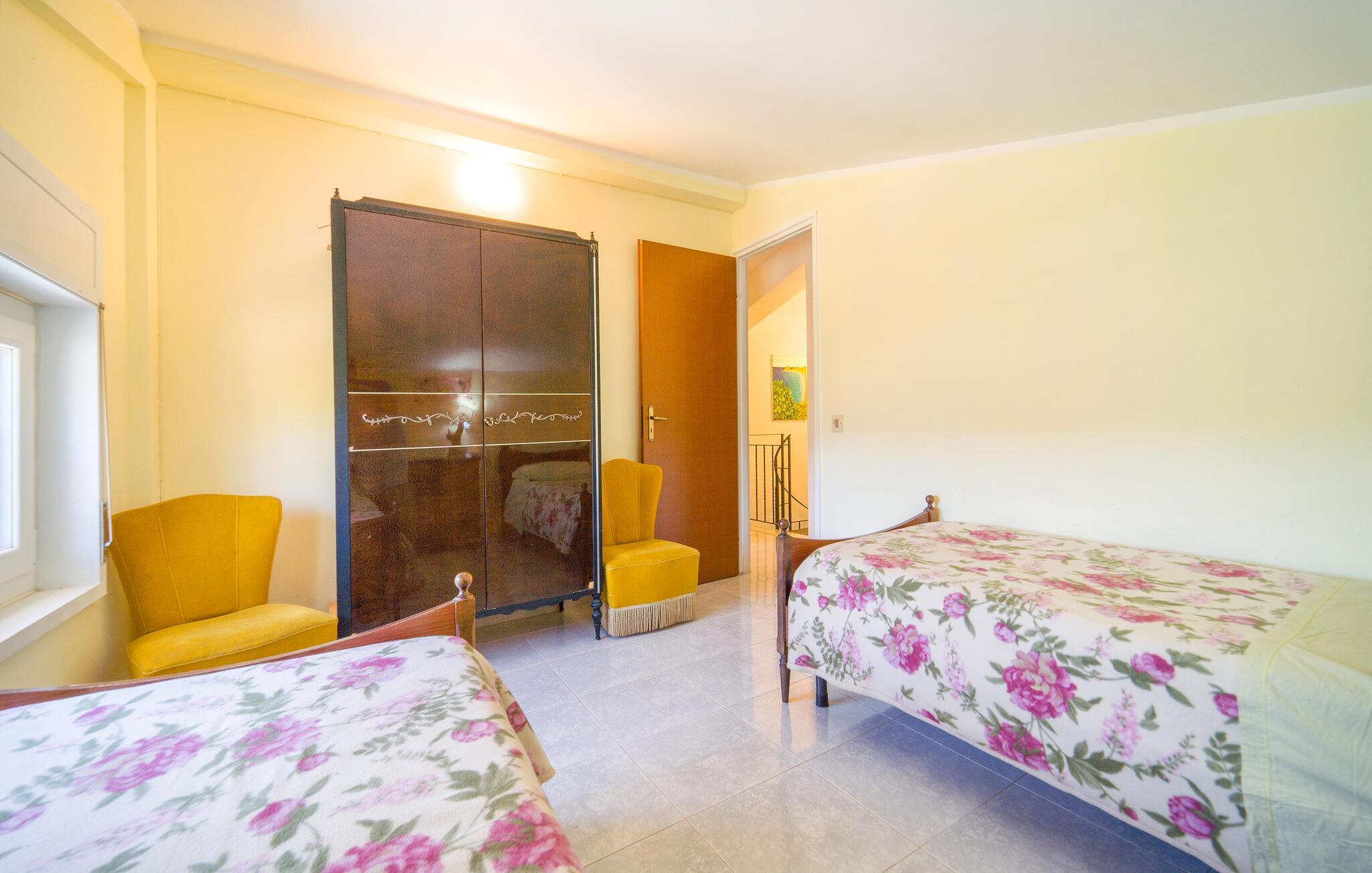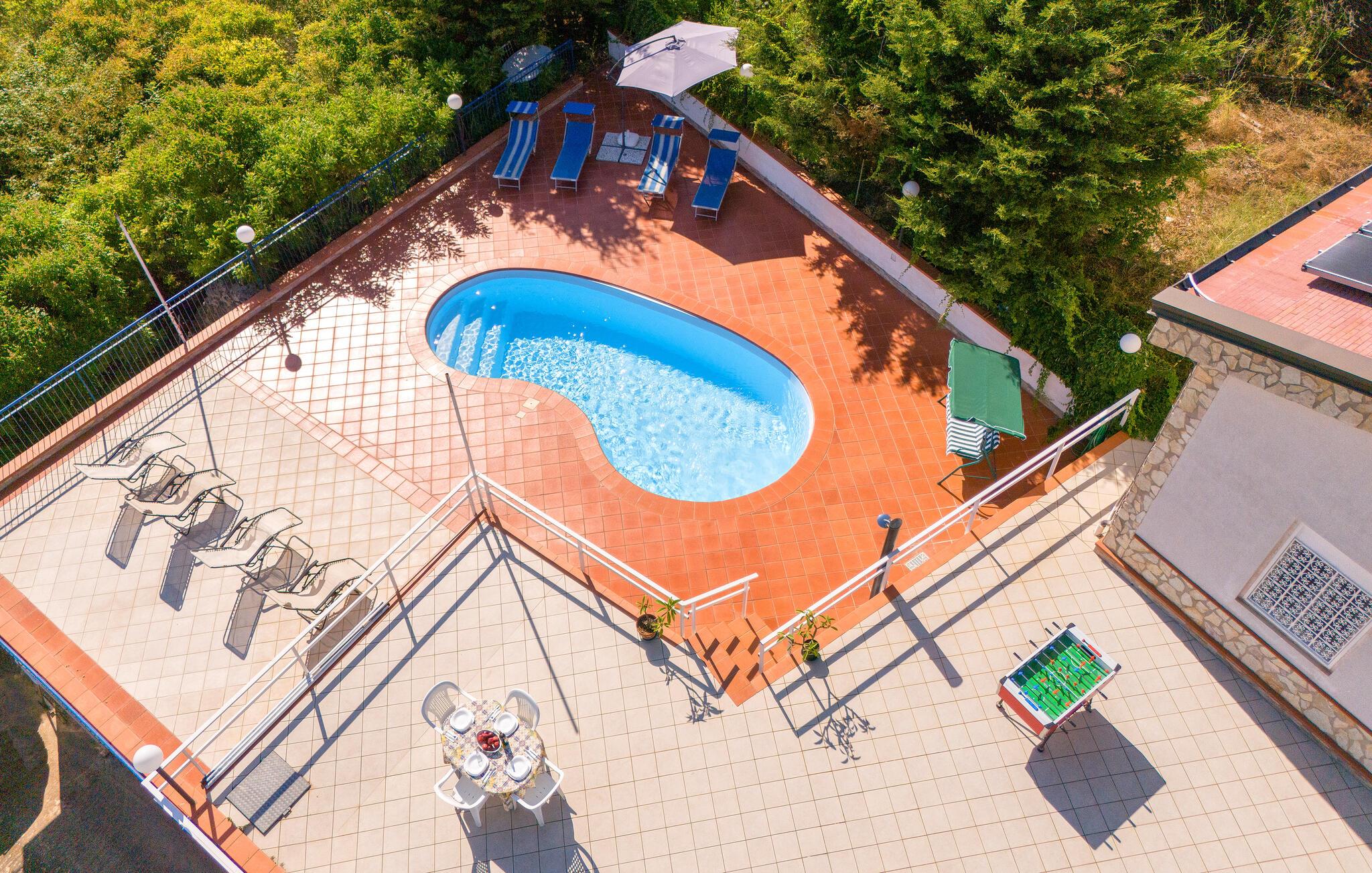 Veranda og udendørs område er udstyret til afslapning og udendørs spisning ved grillen. Stor indhegnet grund med en smuk swimmingpool med udsigt over de omkringliggende bakker. Huset strækker sig over 2 etager. I stueetagen en stor stue, to soveværelser med dobbeltsenge, køkkenet med en karakteristisk brændeovn og et badeværelse. På første sal er der yderligere to dobbeltværelser (et med lavt loft), et dobbeltværelse (lavt til loftet) og et badeværelse.
