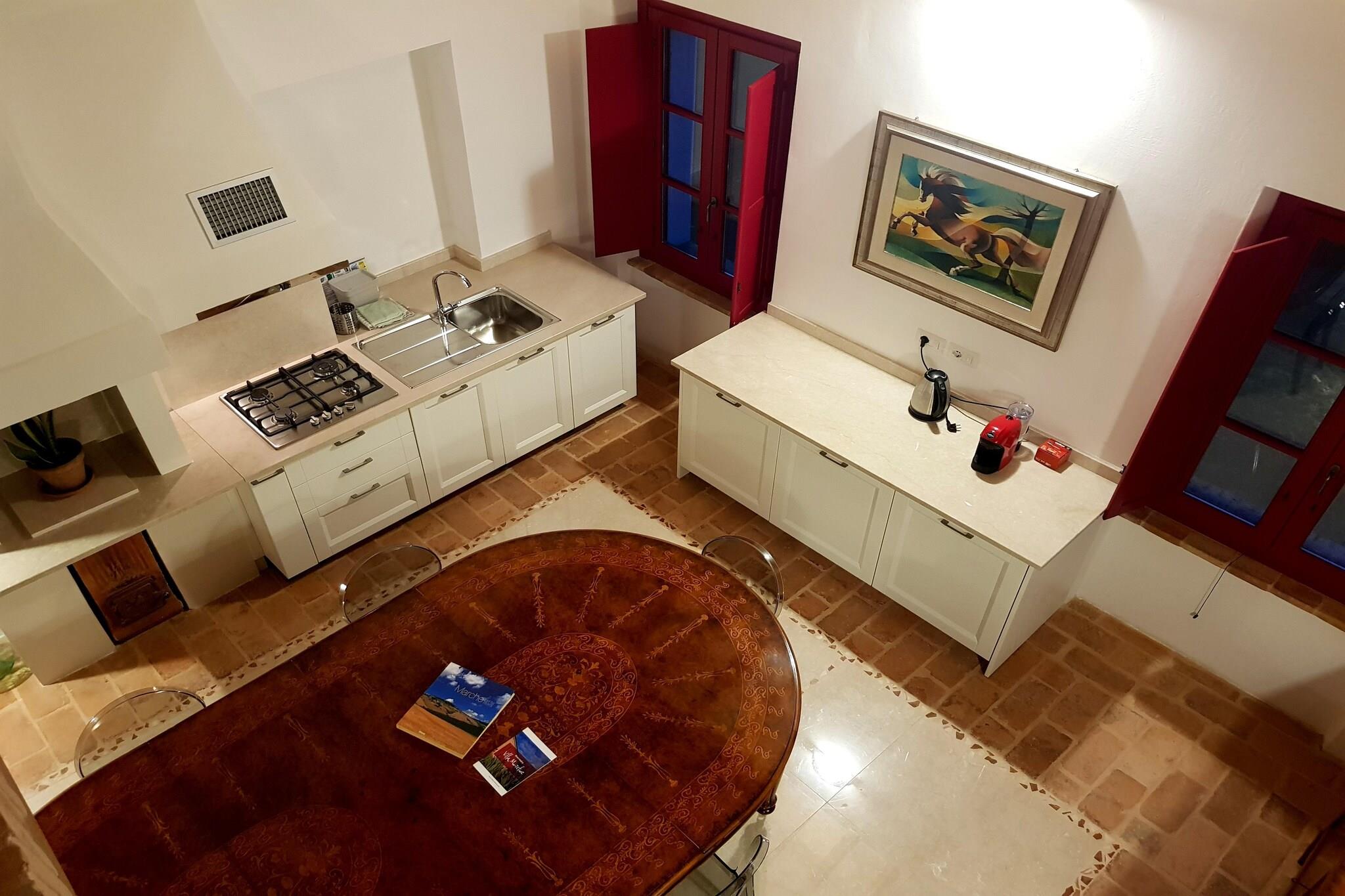 Denne herregård, beliggende i hjertet af Marche-regionen, er en historisk bolig, der tilbyder det bedste fra de grønne bakker, mens det er inden for rækkevidde af de charmerende sandstrande ved Adriaterhavet lejligheder, hver udstyret med moderne bekvemmeligheder for at sikre et behageligt og afslappende ophold. Hver lejlighed er udstyret med gulvvarme og køling, fuldt udstyrede køkkener, vinduer med myggenet og Wi-Fi i alle områder. Derudover har hver lejlighed en have privat møbleret med udendørs møbler, ideel til at nyde det omkringliggende landskab i total privatliv. Gæsterne kan også nyde en eksklusiv swimmingpool med en 15 meter lang pool, perfekt til svømning eller afslapning. Poolområdet er beriget med et rummeligt afslapningsområde, beliggende på trapper i vandet, hvorfra du kan beundre en fantastisk udsigt over Marche-landskabet, hvilket skaber en atmosfære af total fred og harmoni med naturen. Villaen er et ideelt tilflugtssted for dem, der søger en kombination af komfort, elegance og naturlig skønhed.