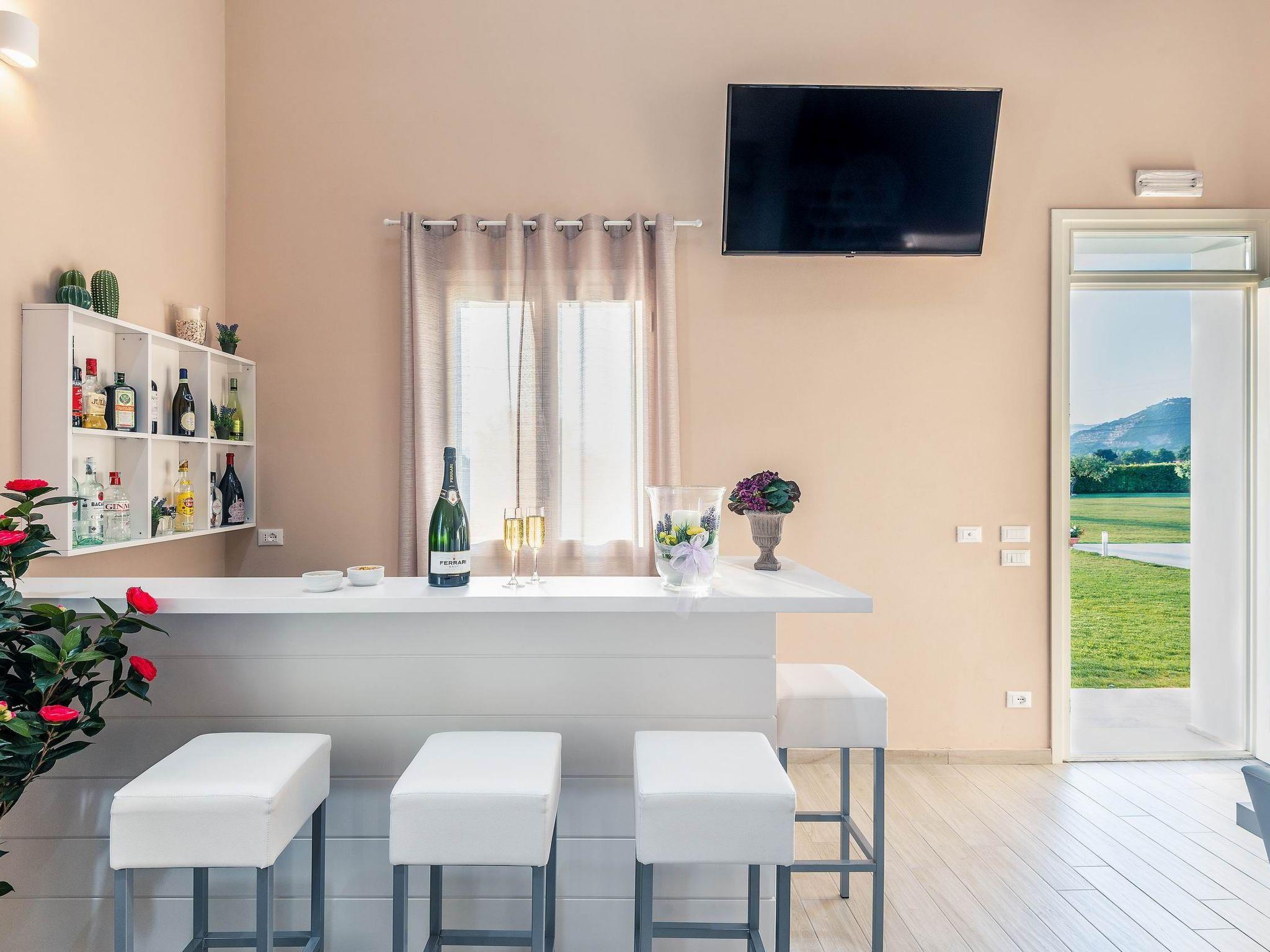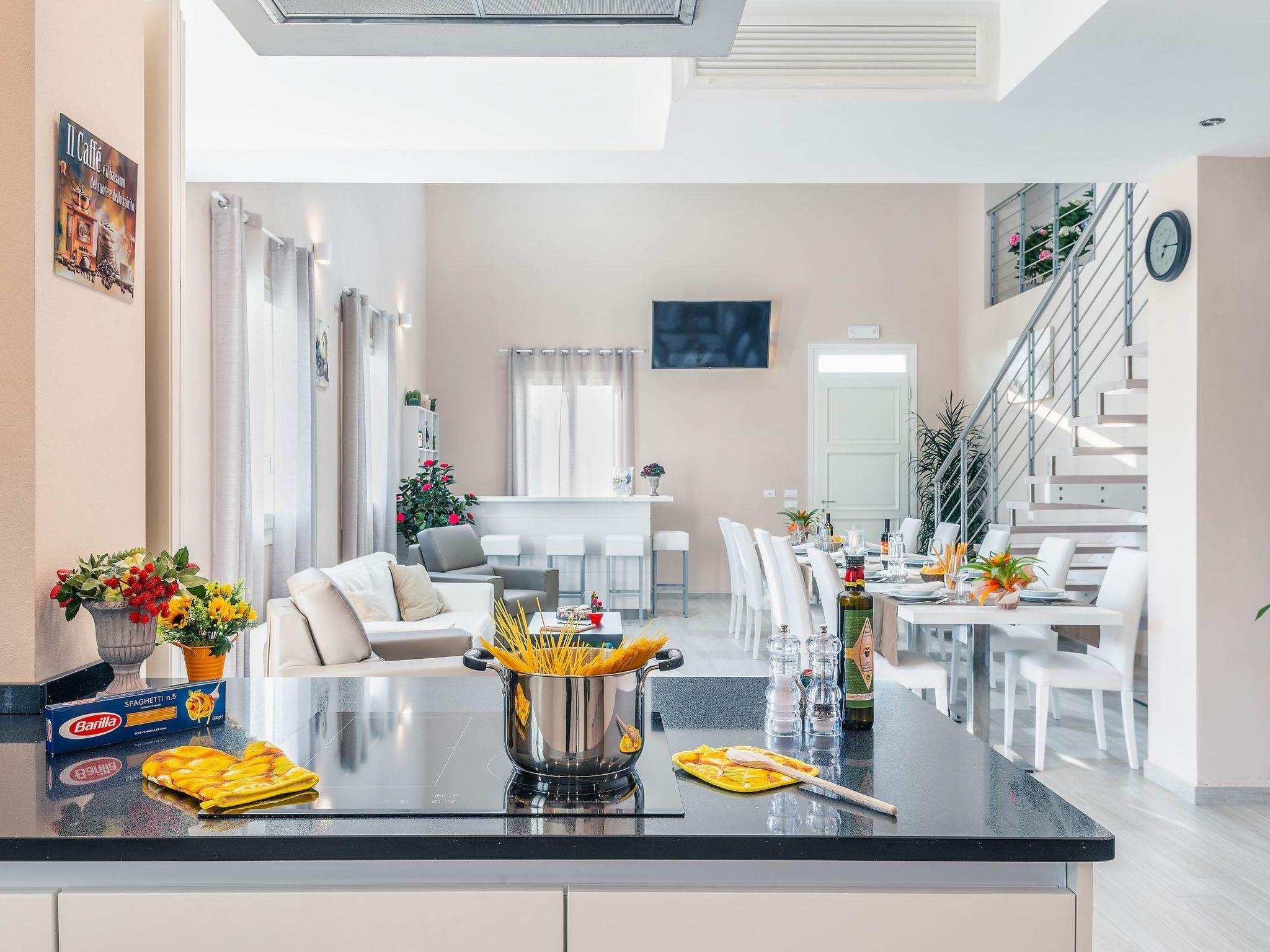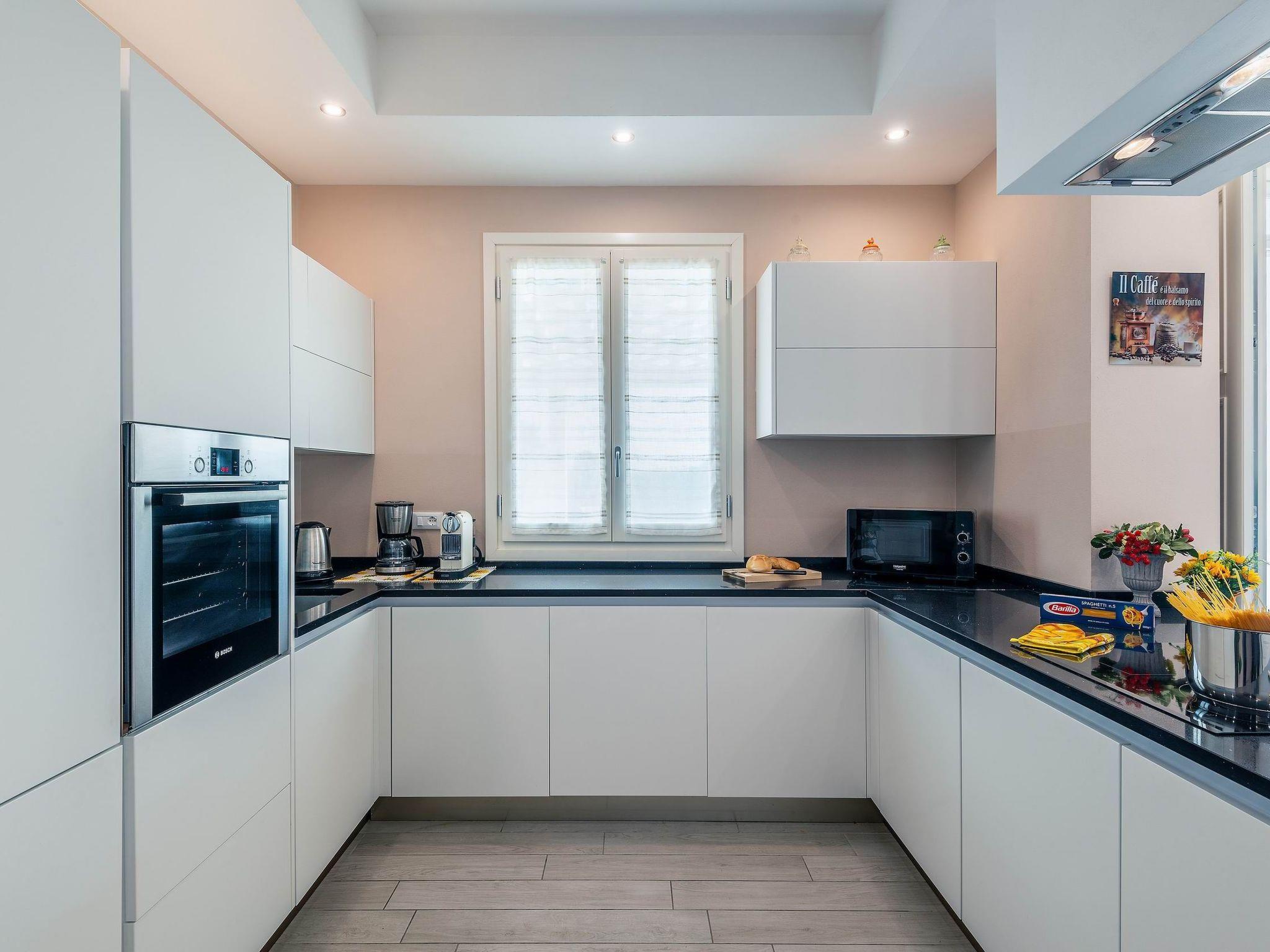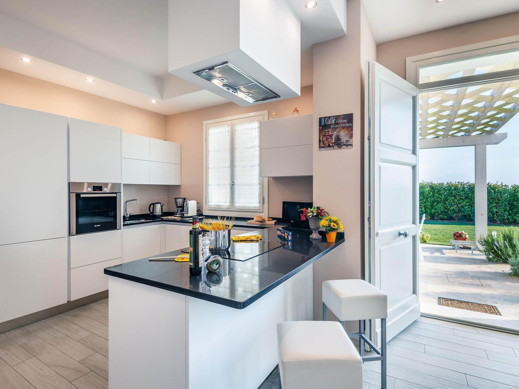 Ground floor: There are various open spaces, divided into a dining area, a well-equipped kitchen (cooker, refrigerator with freezer, oven, dishwasher, microwave, kettle, blender, toaster, American coffee and espresso machine, ice machine), a living room with sofas and satellite TV and stereo system. A double bedroom with satellite TV, a private bathroom with shower and access to the garden. A laundry room with washing machine and dryer as well as iron and ironing board.