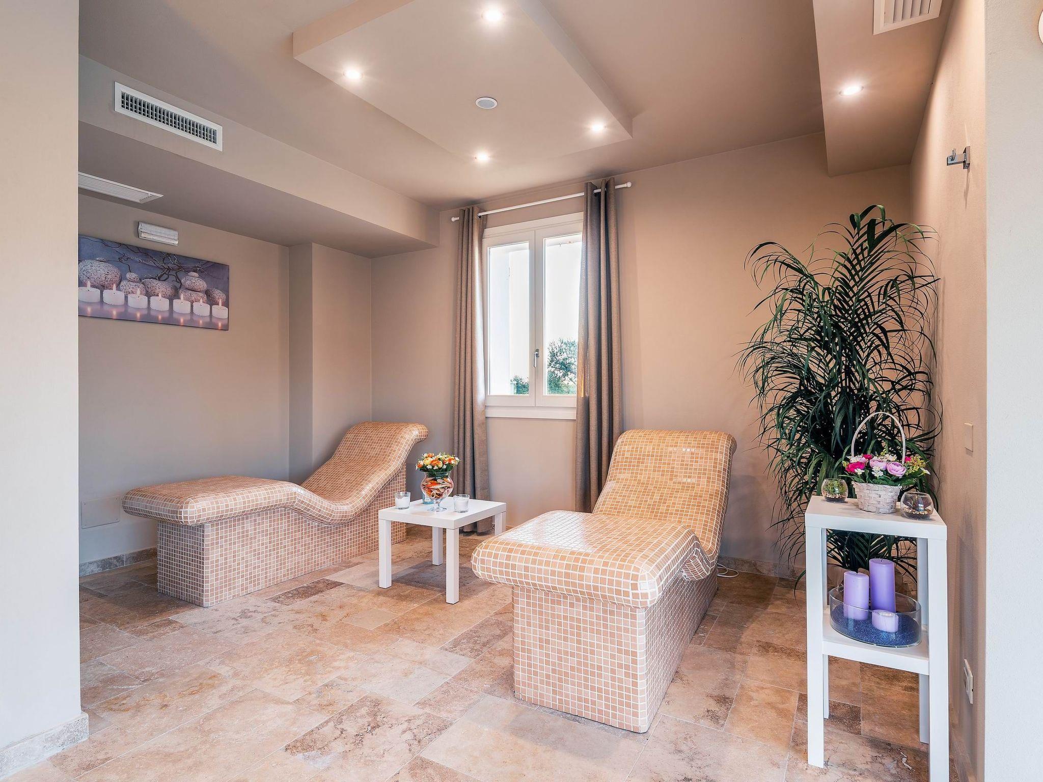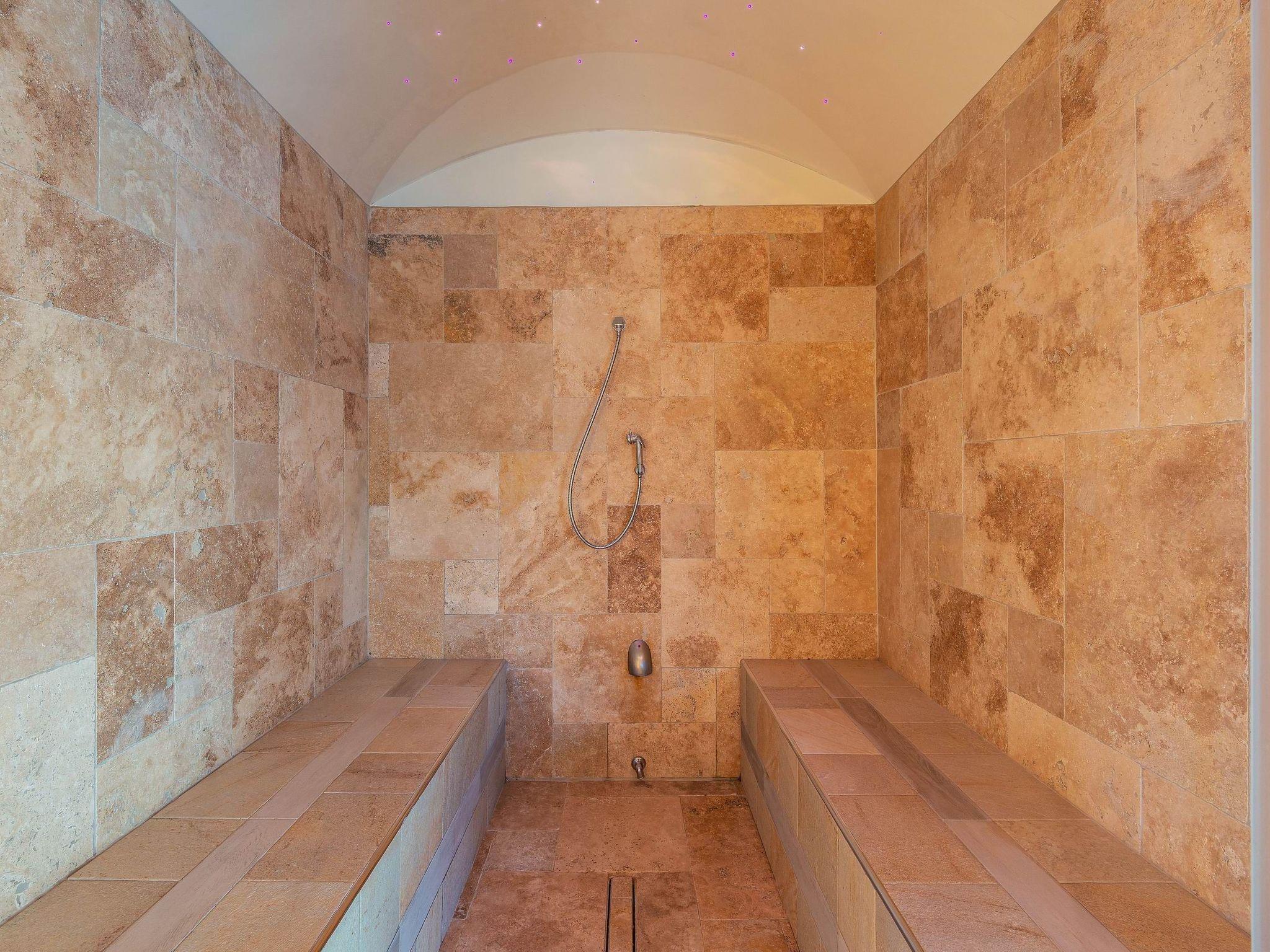 On the ground floor there is also a wellness area with a whirlpool bath (3.80 x 2.5 m, depth 1 m), sauna, 4 m² steam bath, 2 heated wellness loungers and a view of the outdoor area, 2 changing rooms with WC, showers and a bathroom suitable for the disabled.