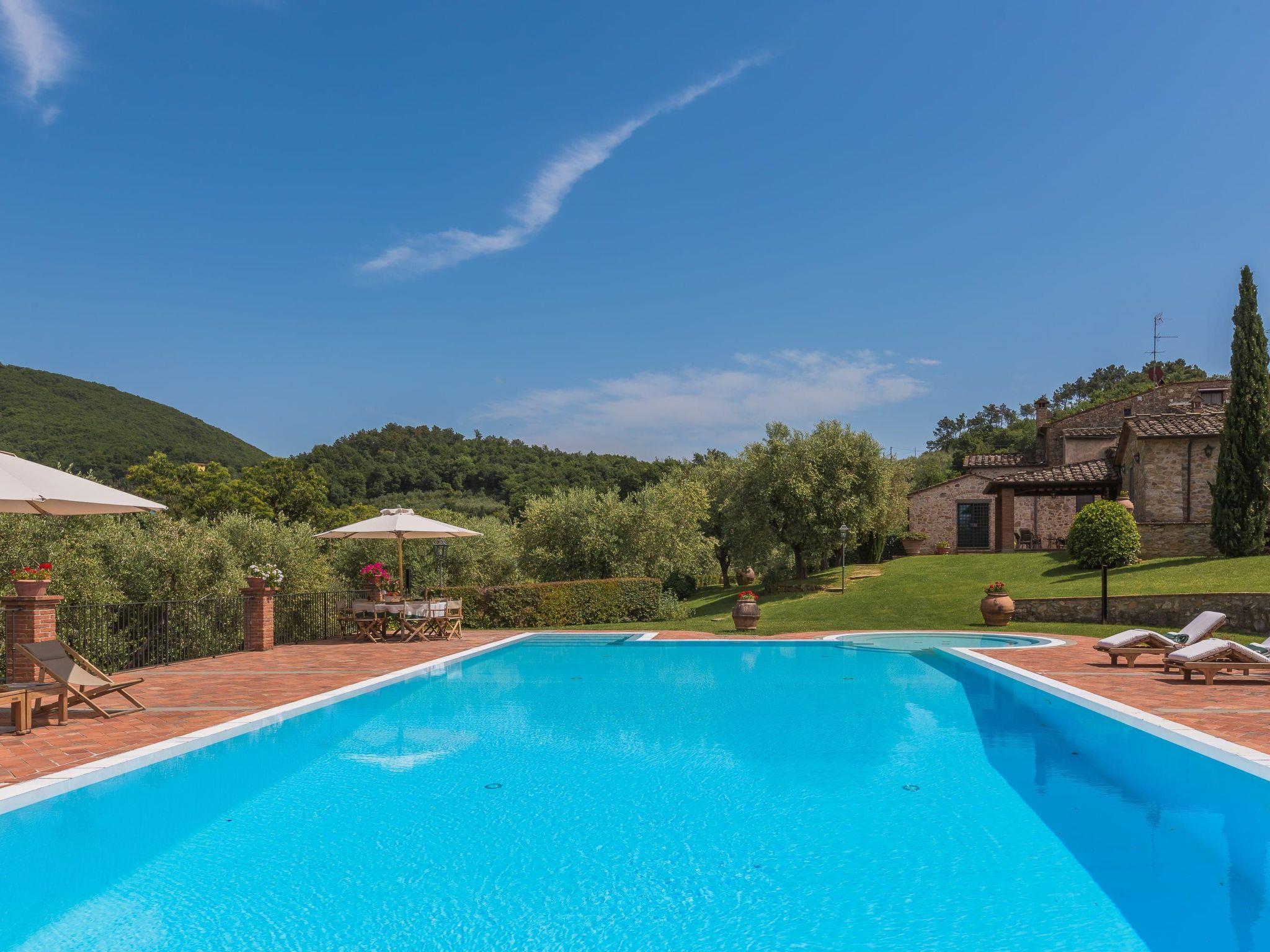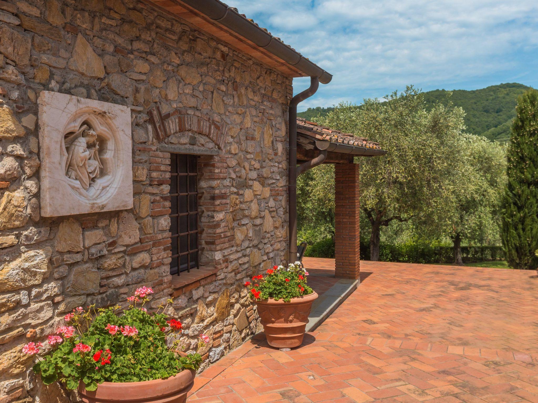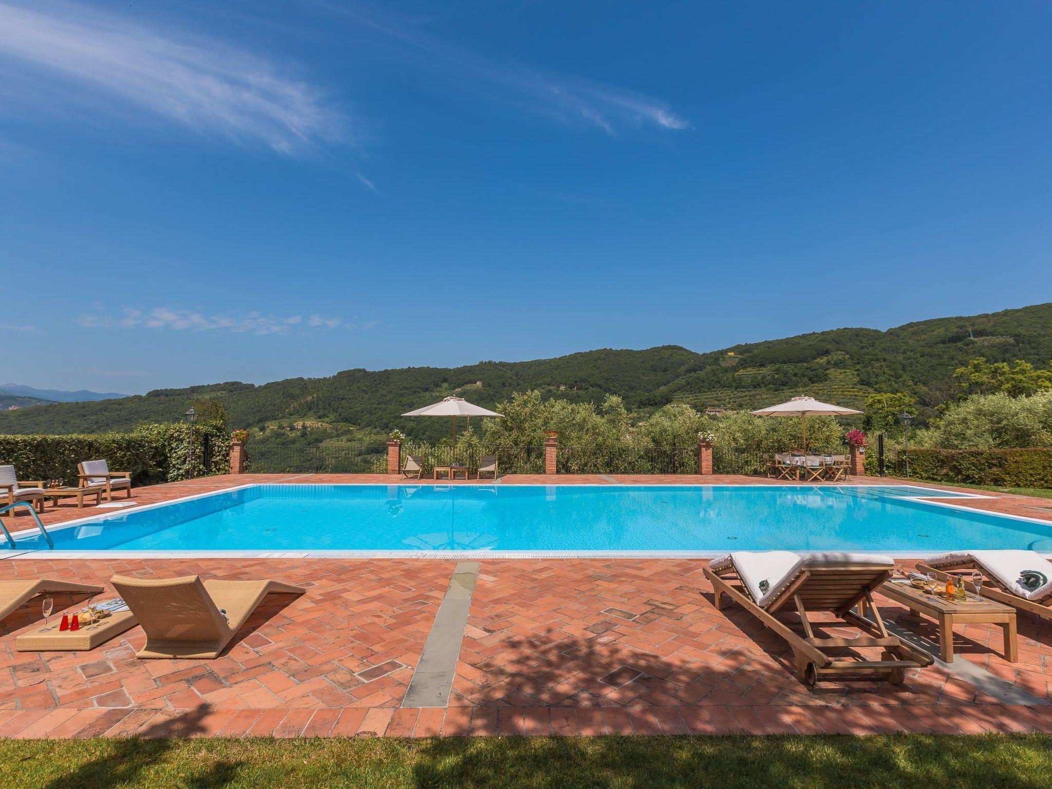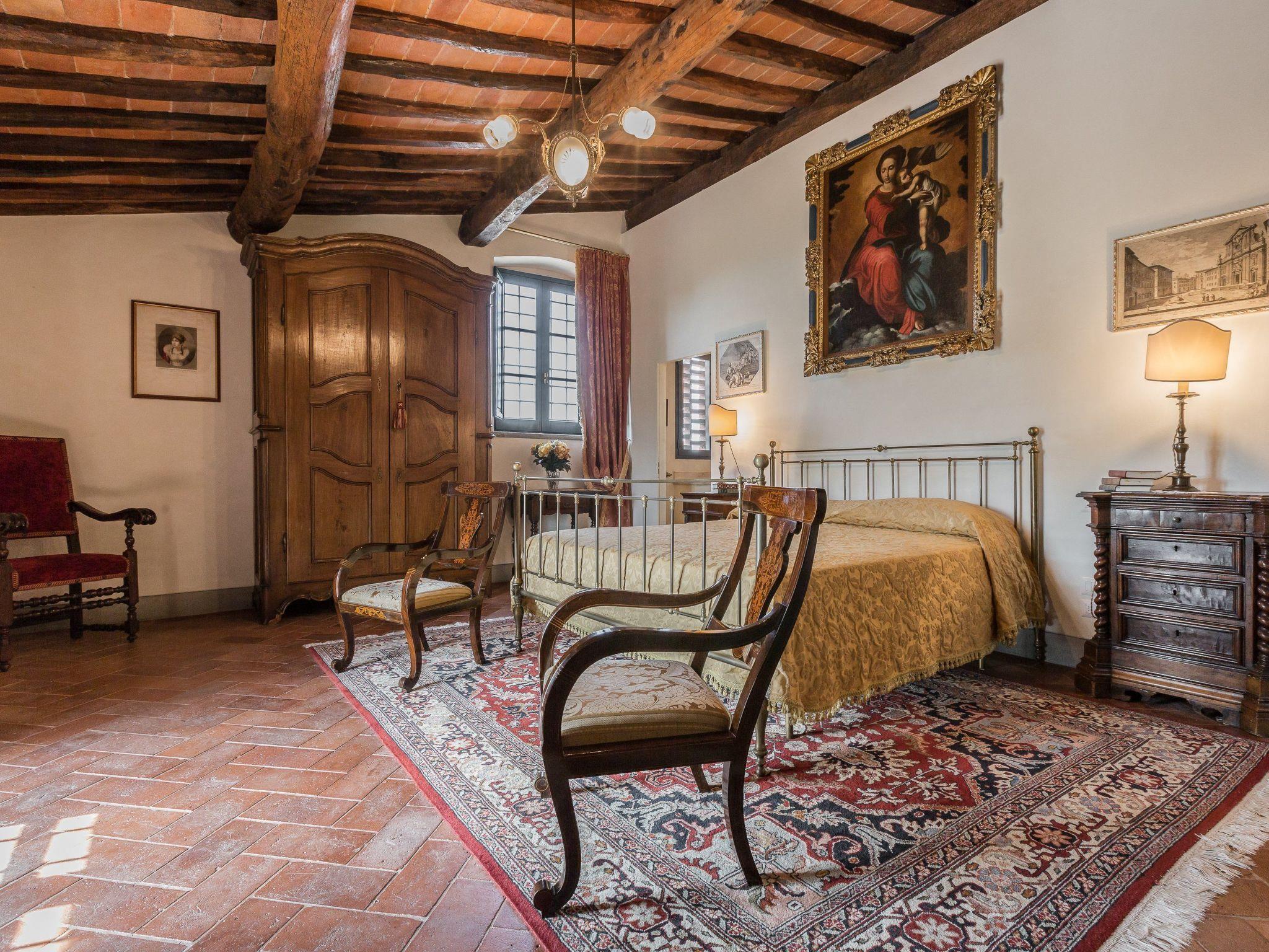 This charming stone villa with swimming pool is situated in the fertile hills of the Valdinievole, just 2 km from the famous spa town of Monsummano Terme. Originally an 18th-century farmhouse built of local stone, the villa is now surrounded by a large garden full of lush plants and beautiful Tuscan terracotta vases. In a picturesque position with a wide view of the surrounding countryside, there is an infinity pool (16 x 8 m, depth from 1.35 to 2.50 m, open from mid-April to mid-October) with a very large whirlpool area for 8 people. Under the pool, equipped with night lighting and an acoustic alarm system for the safety of our young guests, is a large changing room with 2 showers and a WC. There is also a fitness room equipped with a treadmill with digital display, a multifunctional Technogym bench, an exercise bike and a foosball table. The garden also offers several furnished areas, perfect for outdoor dining, including a relaxing stone amphitheatre, a barbecue and a children's corner with a swing and slide. Definitely an ideal place for those seeking peace and tranquillity. The 350 m² villa can accommodate up to 11 people on two floors. It is elegantly furnished with exceptional antiques tastefully collected over the years and features wood-beamed ceilings and beautiful old terracotta floors, lovingly restored by the owners. On the ground floor there is a large living-dining room (80 square metres) with a table for 14 and a magnificent 16th century fireplace (not in use), sloping ceilings with wooden beams and French windows overlooking the garden with views of the historic centre of Monsummano Alto; A further living room with satellite TV (Netflix, Bose Bluetooth acoustic speakers) and a double sofa bed and a single bed leads to the large Tuscan kitchen with fireplace (fully equipped with professional hob with 2 ovens, side-by-side refrigerator with icemaker, dishwasher, microwave, Nespresso coffee machine, American coffee machine, moka coffee maker, toaster, blender, juicer), a cast-iron stove with ovens and a French window leading to the veranda suitable for outdoor dining with a table seating 14 a double bedroom with a 17th-century fireplace (not in use) and French doors leading to a covered veranda; a bathroom with a hydro-massage shower; and a laundry room with a washing machine and dryer. From the entrance hall, a stone staircase leads to the first floor, where there is a large double bedroom (30 m²) with en-suite bathroom with Turkish bath/shower, another double bedroom and a twin bedroom (which can be converted into another double bed), both sharing a bathroom with whirlpool tub and shower with chromotherapy and aromatherapy kit. All rooms are fitted with sumptuous Persian carpets. Amenities: Wi-Fi (up to 30 MB download, up to 3 MB upload), all double beds are king-size, all windows are fitted with mosquito nets, cots, high chairs, baby bottle steriliser on request, heating and air conditioning in all rooms (heating and air conditioning consumption not included), welcome hamper with a light dinner on the evening of arrival and a continental breakfast on the first morning, housekeeping on Wednesdays (2 hours) with towel change, complimentary toiletries in all bathrooms with shower/shampoo/hand soap and body/hand cream, hairdryer in all bathrooms, wall safe, Netflix, Bose Bluetooth speakers, fire extinguisher and fire blanket, carbon monoxide detectors in kitchens, smoke detectors on each floor, first aid kit (one in the villa and one in the pool locker room), audible pool alarm system, 4 mountain bikes, charcoal and fire tablets for barbecues and private parking for up to 5 people. Car, small pets allowed on request. A personal chef, wine and local product tastings, a babysitter, a transfer to/from the airport, a grocery delivery service, a hairdresser/beautician/masseuse at home; Organisation of cookery courses, vineyard visits and wine tastings, painting lessons (on canvas or porcelain); Provision of a chauffeur and a wedding planner and party planner. Distances: nearest shops and restaurants Monsummano Terme 2 km, Montecatini Terme 5 km, San Miniato 30 km, Florence Airport 40 km, Pisa Airport 45 km.