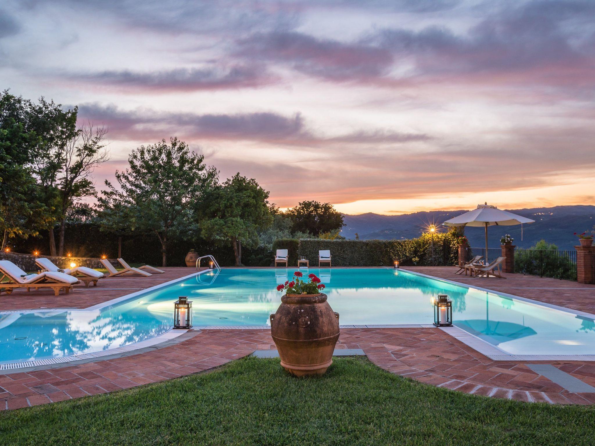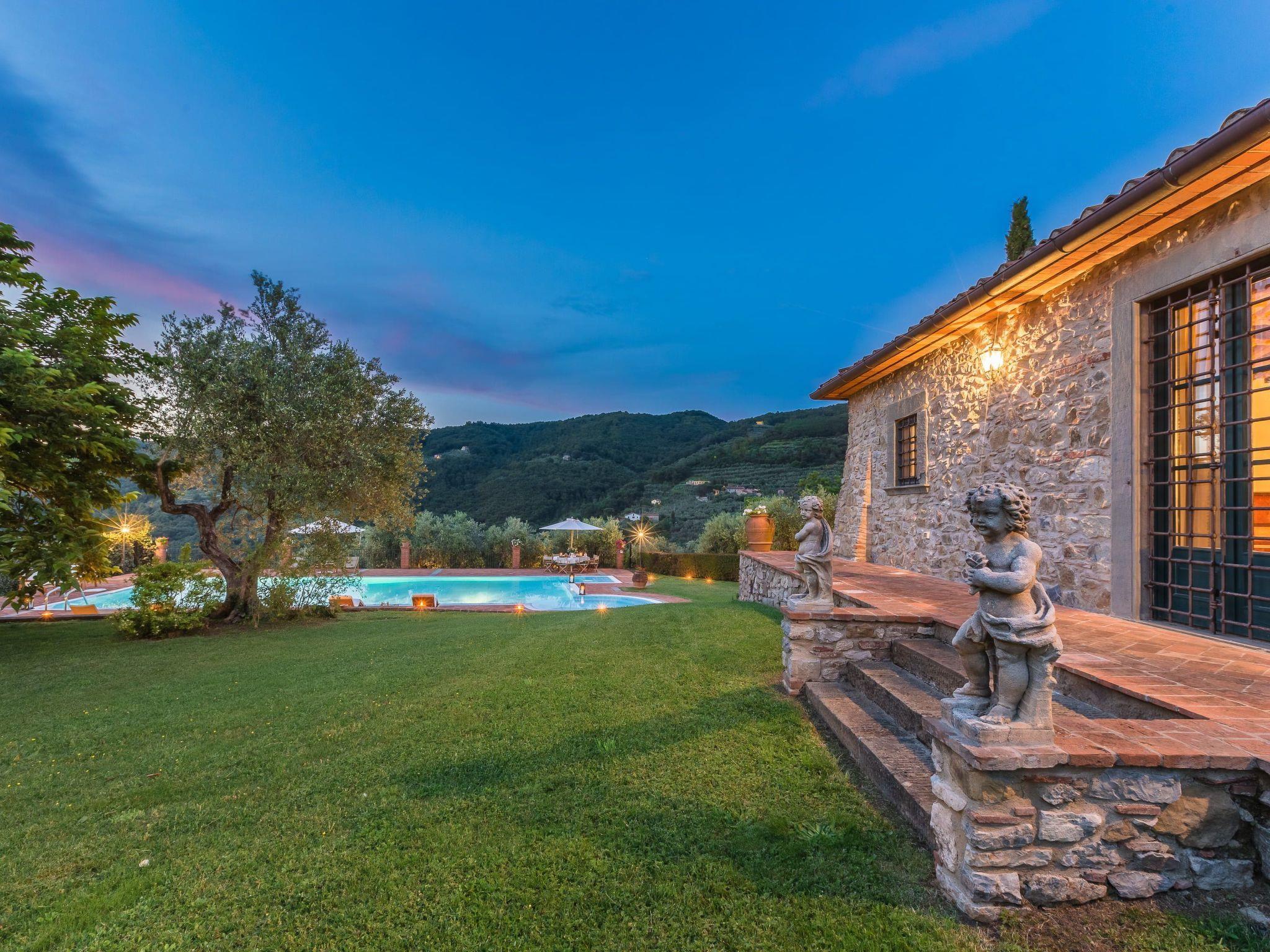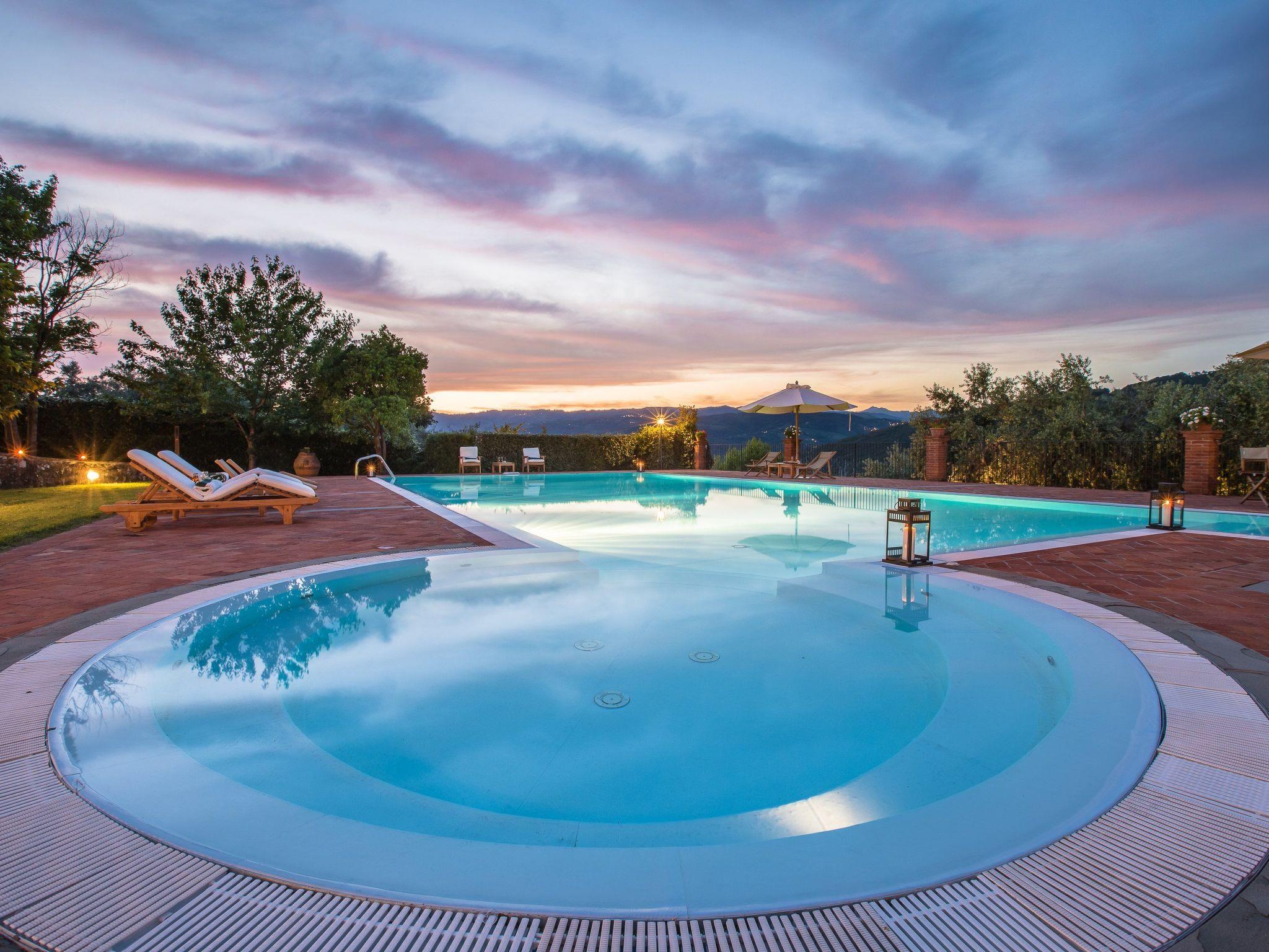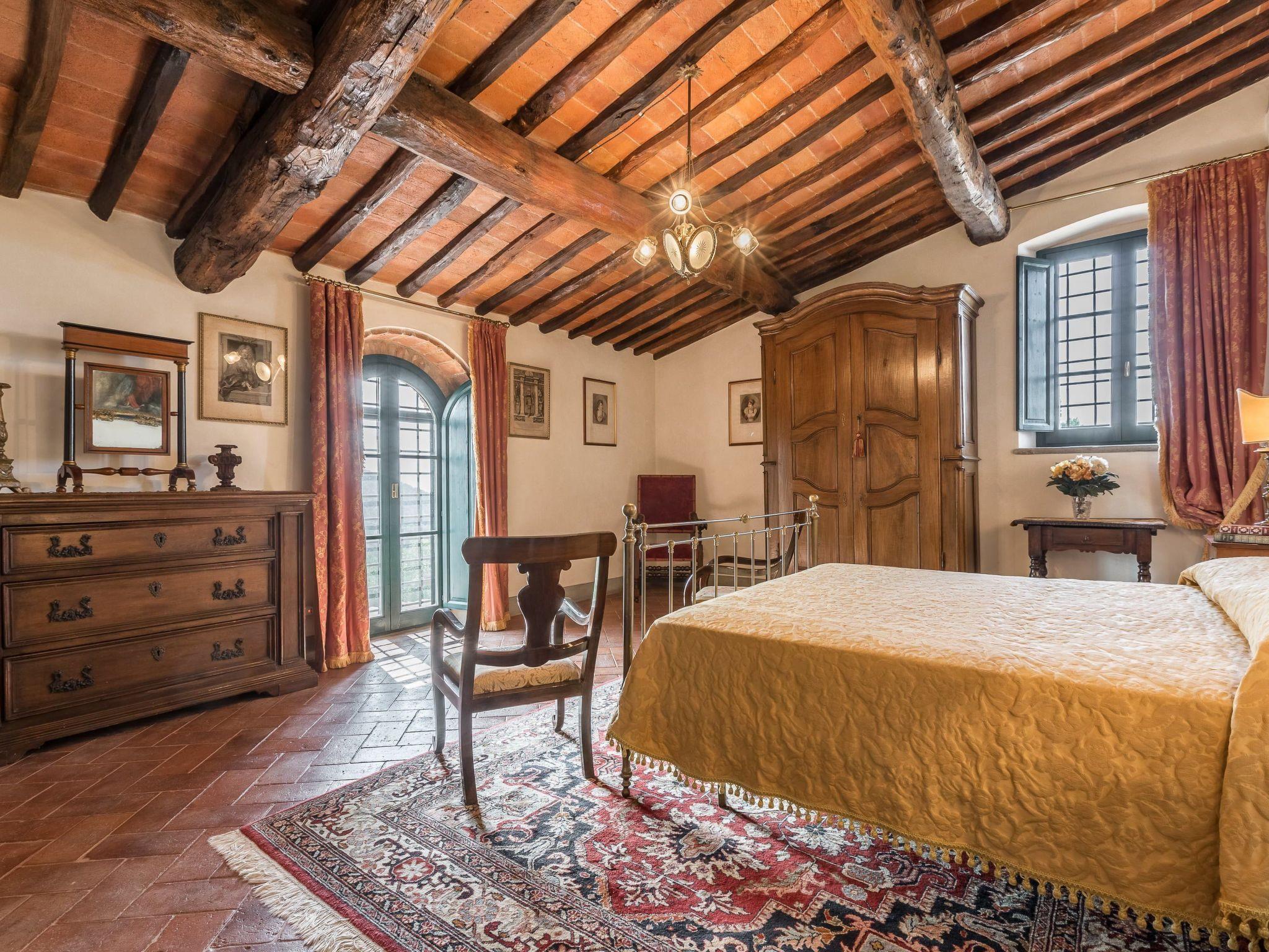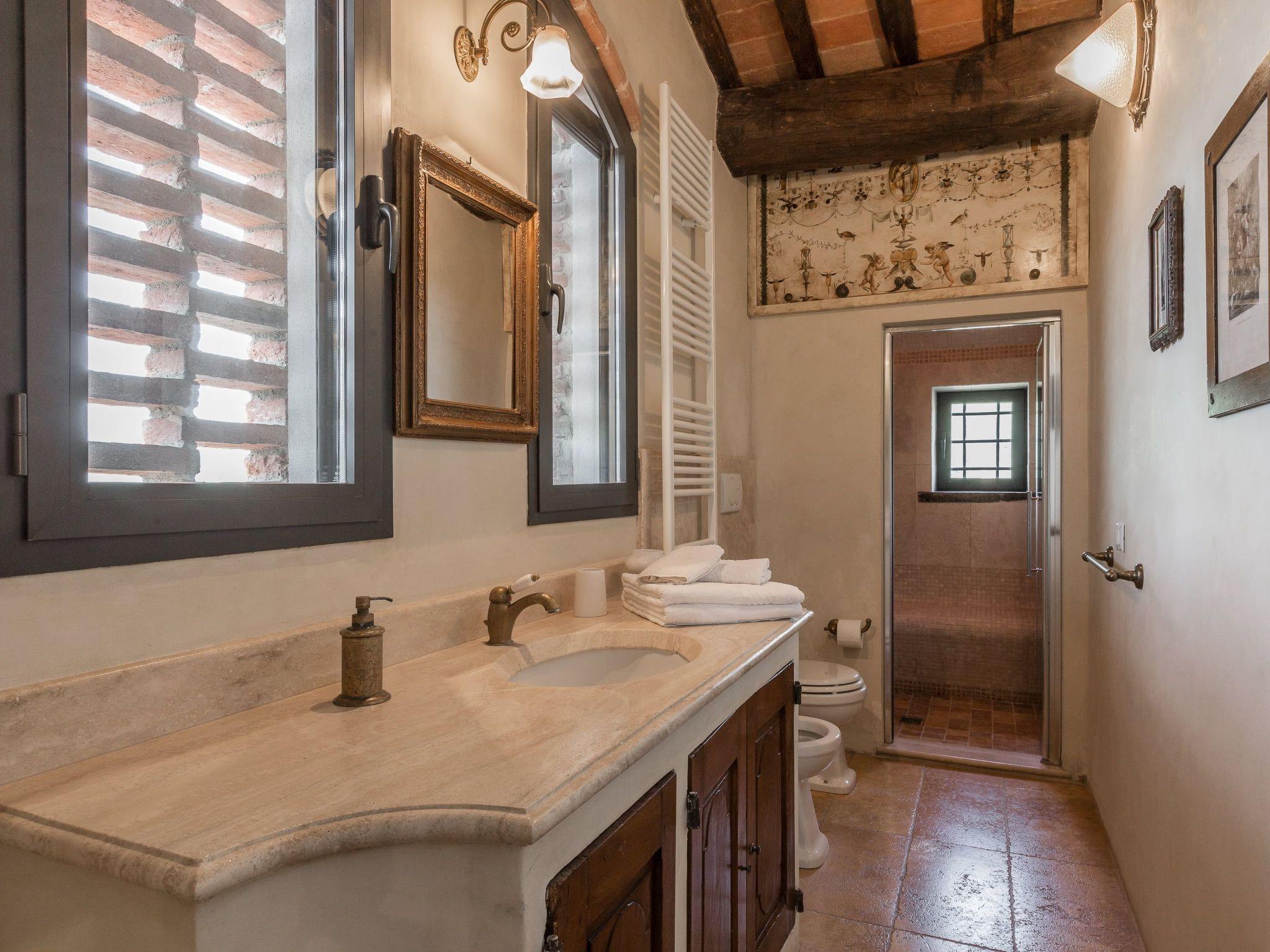 This charming stone villa with swimming pool is situated in the fertile hills of the Valdinievole, just 2 km from the famous spa town of Monsummano Terme. Originally an 18th-century farmhouse built of local stone, the villa is now surrounded by a large garden full of lush plants and beautiful Tuscan terracotta vases. In a picturesque position with a wide view of the surrounding countryside, there is an infinity pool (16 x 8 m, depth from 1.35 to 2.50 m, open from mid-April to mid-October) with a very large whirlpool area for 8 people. Under the pool, equipped with night lighting and an acoustic alarm system for the safety of our young guests, is a large changing room with 2 showers and a WC. There is also a fitness room equipped with a treadmill with digital display, a multifunctional Technogym bench, an exercise bike and a foosball table. The garden also offers several furnished areas, perfect for outdoor dining, including a relaxing stone amphitheatre, a barbecue and a children's corner with a swing and slide. Definitely an ideal place for those seeking peace and tranquillity. The 350 m² villa can accommodate up to 11 people on two floors. It is elegantly furnished with exceptional antiques tastefully collected over the years and features wood-beamed ceilings and beautiful old terracotta floors, lovingly restored by the owners. On the ground floor there is a large living-dining room (80 square metres) with a table for 14 and a magnificent 16th century fireplace (not in use), sloping ceilings with wooden beams and French windows overlooking the garden with views of the historic centre of Monsummano Alto; A further living room with satellite TV (Netflix, Bose Bluetooth acoustic speakers) and a double sofa bed and a single bed leads to the large Tuscan kitchen with fireplace (fully equipped with professional hob with 2 ovens, side-by-side refrigerator with icemaker, dishwasher, microwave, Nespresso coffee machine, American coffee machine, moka coffee maker, toaster, blender, juicer), a cast-iron stove with ovens and a French window leading to the veranda suitable for outdoor dining with a table seating 14 a double bedroom with a 17th-century fireplace (not in use) and French doors leading to a covered veranda; a bathroom with a hydro-massage shower; and a laundry room with a washing machine and dryer. From the entrance hall, a stone staircase leads to the first floor, where there is a large double bedroom (30 m²) with en-suite bathroom with Turkish bath/shower, another double bedroom and a twin bedroom (which can be converted into another double bed), both sharing a bathroom with whirlpool tub and shower with chromotherapy and aromatherapy kit. All rooms are fitted with sumptuous Persian carpets. Amenities: Wi-Fi (up to 30 MB download, up to 3 MB upload), all double beds are king-size, all windows are fitted with mosquito nets, cots, high chairs, baby bottle steriliser on request, heating and air conditioning in all rooms (heating and air conditioning consumption not included), welcome hamper with a light dinner on the evening of arrival and a continental breakfast on the first morning, housekeeping on Wednesdays (2 hours) with towel change, complimentary toiletries in all bathrooms with shower/shampoo/hand soap and body/hand cream, hairdryer in all bathrooms, wall safe, Netflix, Bose Bluetooth speakers, fire extinguisher and fire blanket, carbon monoxide detectors in kitchens, smoke detectors on each floor, first aid kit (one in the villa and one in the pool locker room), audible pool alarm system, 4 mountain bikes, charcoal and fire tablets for barbecues and private parking for up to 5 people. Car, small pets allowed on request. A personal chef, wine and local product tastings, a babysitter, a transfer to/from the airport, a grocery delivery service, a hairdresser/beautician/masseuse at home; Organisation of cookery courses, vineyard visits and wine tastings, painting lessons (on canvas or porcelain); Provision of a chauffeur and a wedding planner and party planner. Distances: nearest shops and restaurants Monsummano Terme 2 km, Montecatini Terme 5 km, San Miniato 30 km, Florence Airport 40 km, Pisa Airport 45 km.