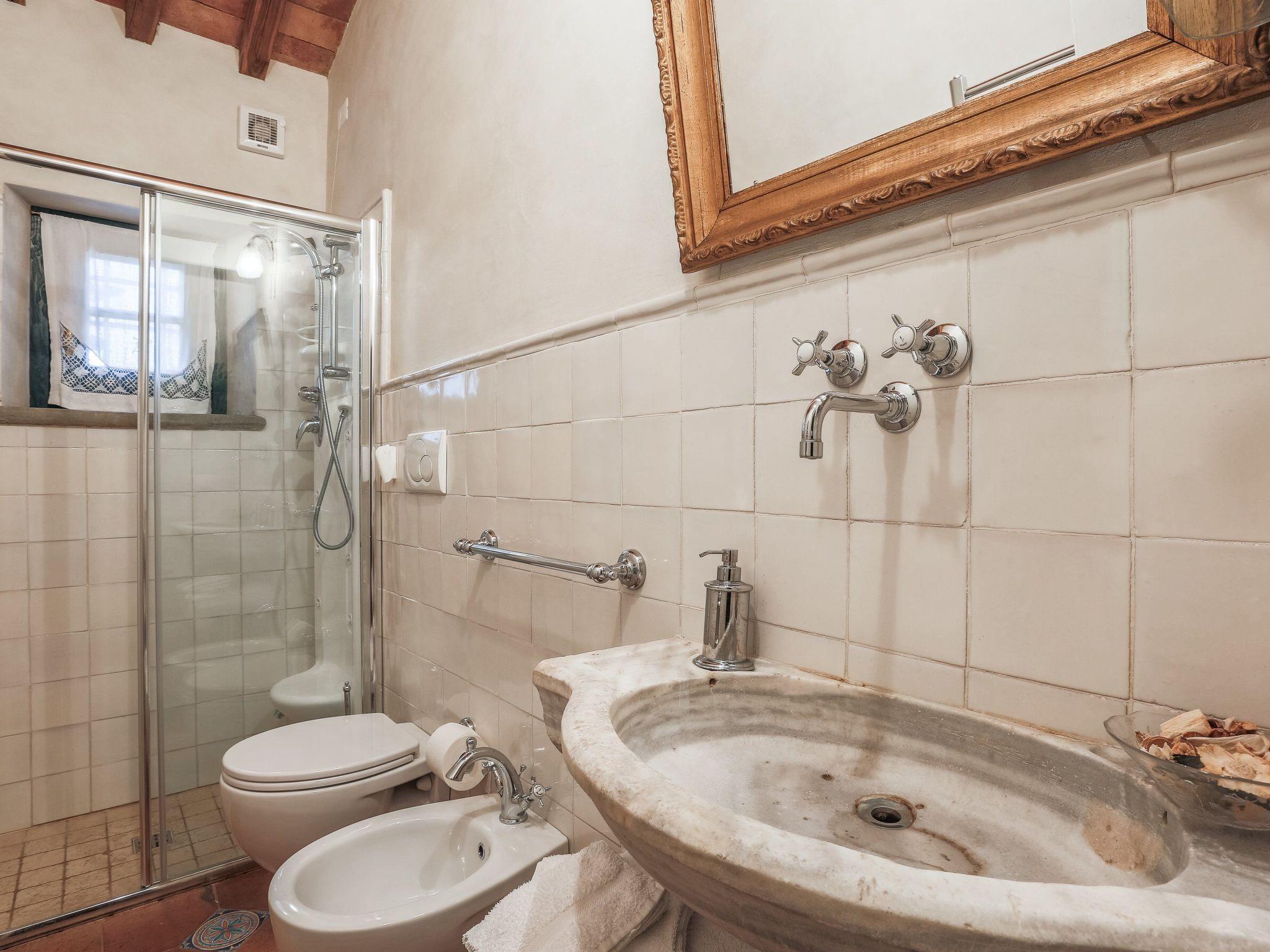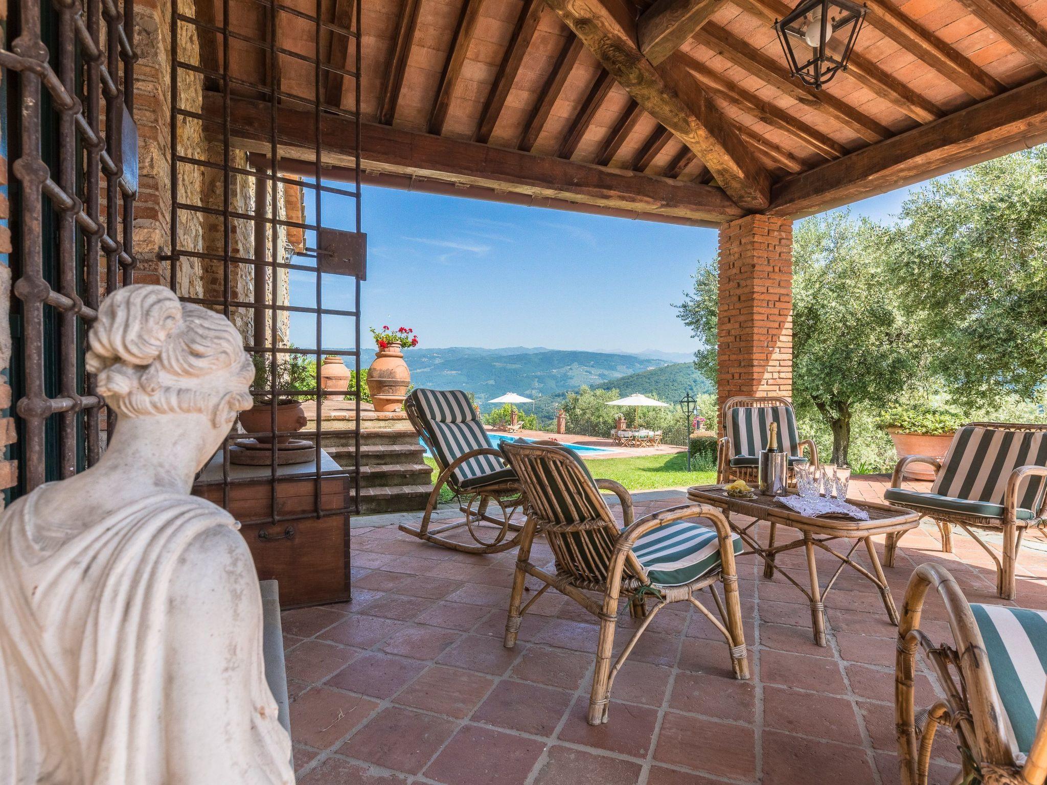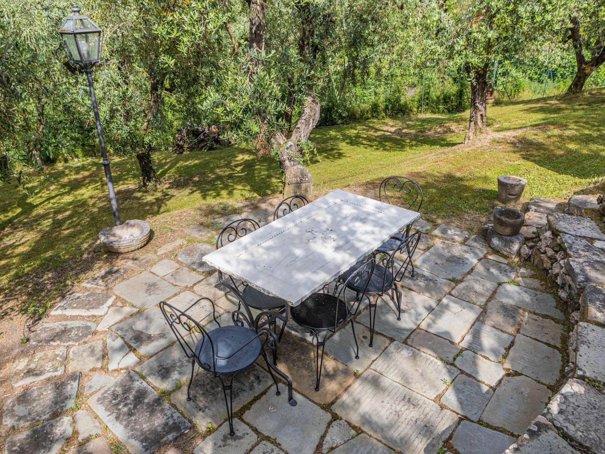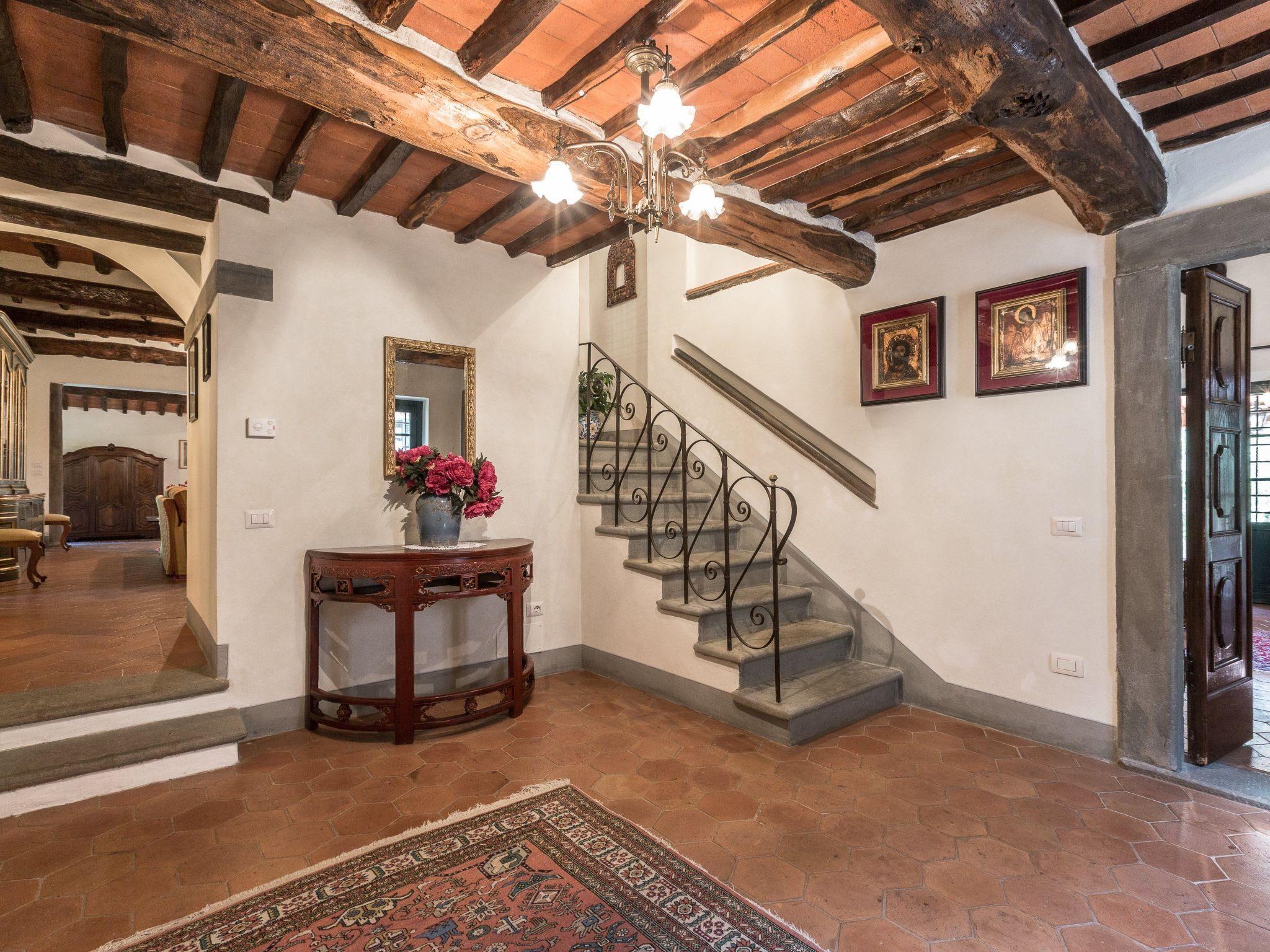 This charming stone villa with swimming pool is situated in the fertile hills of the Valdinievole, just 2 km from the famous spa town of Monsummano Terme. Originally an 18th-century farmhouse built of local stone, the villa is now surrounded by a large garden full of lush plants and beautiful Tuscan terracotta vases. In a picturesque position with a wide view of the surrounding countryside, there is an infinity pool (16 x 8 m, depth from 1.35 to 2.50 m, open from mid-April to mid-October) with a very large whirlpool area for 8 people. Under the pool, equipped with night lighting and an acoustic alarm system for the safety of our young guests, is a large changing room with 2 showers and a WC. There is also a fitness room equipped with a treadmill with digital display, a multifunctional Technogym bench, an exercise bike and a foosball table. The garden also offers several furnished areas, perfect for outdoor dining, including a relaxing stone amphitheatre, a barbecue and a children's corner with a swing and slide. Definitely an ideal place for those seeking peace and tranquillity. The 350 m² villa can accommodate up to 11 people on two floors. It is elegantly furnished with exceptional antiques tastefully collected over the years and features wood-beamed ceilings and beautiful old terracotta floors, lovingly restored by the owners. On the ground floor there is a large living-dining room (80 square metres) with a table for 14 and a magnificent 16th century fireplace (not in use), sloping ceilings with wooden beams and French windows overlooking the garden with views of the historic centre of Monsummano Alto; A further living room with satellite TV (Netflix, Bose Bluetooth acoustic speakers) and a double sofa bed and a single bed leads to the large Tuscan kitchen with fireplace (fully equipped with professional hob with 2 ovens, side-by-side refrigerator with icemaker, dishwasher, microwave, Nespresso coffee machine, American coffee machine, moka coffee maker, toaster, blender, juicer), a cast-iron stove with ovens and a French window leading to the veranda suitable for outdoor dining with a table seating 14 a double bedroom with a 17th-century fireplace (not in use) and French doors leading to a covered veranda; a bathroom with a hydro-massage shower; and a laundry room with a washing machine and dryer. From the entrance hall, a stone staircase leads to the first floor, where there is a large double bedroom (30 m²) with en-suite bathroom with Turkish bath/shower, another double bedroom and a twin bedroom (which can be converted into another double bed), both sharing a bathroom with whirlpool tub and shower with chromotherapy and aromatherapy kit. All rooms are fitted with sumptuous Persian carpets. Amenities: Wi-Fi (up to 30 MB download, up to 3 MB upload), all double beds are king-size, all windows are fitted with mosquito nets, cots, high chairs, baby bottle steriliser on request, heating and air conditioning in all rooms (heating and air conditioning consumption not included), welcome hamper with a light dinner on the evening of arrival and a continental breakfast on the first morning, housekeeping on Wednesdays (2 hours) with towel change, complimentary toiletries in all bathrooms with shower/shampoo/hand soap and body/hand cream, hairdryer in all bathrooms, wall safe, Netflix, Bose Bluetooth speakers, fire extinguisher and fire blanket, carbon monoxide detectors in kitchens, smoke detectors on each floor, first aid kit (one in the villa and one in the pool locker room), audible pool alarm system, 4 mountain bikes, charcoal and fire tablets for barbecues and private parking for up to 5 people. Car, small pets allowed on request. A personal chef, wine and local product tastings, a babysitter, a transfer to/from the airport, a grocery delivery service, a hairdresser/beautician/masseuse at home; Organisation of cookery courses, vineyard visits and wine tastings, painting lessons (on canvas or porcelain); Provision of a chauffeur and a wedding planner and party planner. Distances: nearest shops and restaurants Monsummano Terme 2 km, Montecatini Terme 5 km, San Miniato 30 km, Florence Airport 40 km, Pisa Airport 45 km.