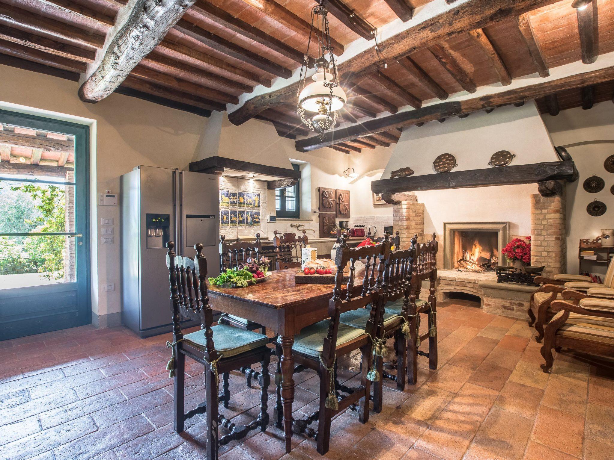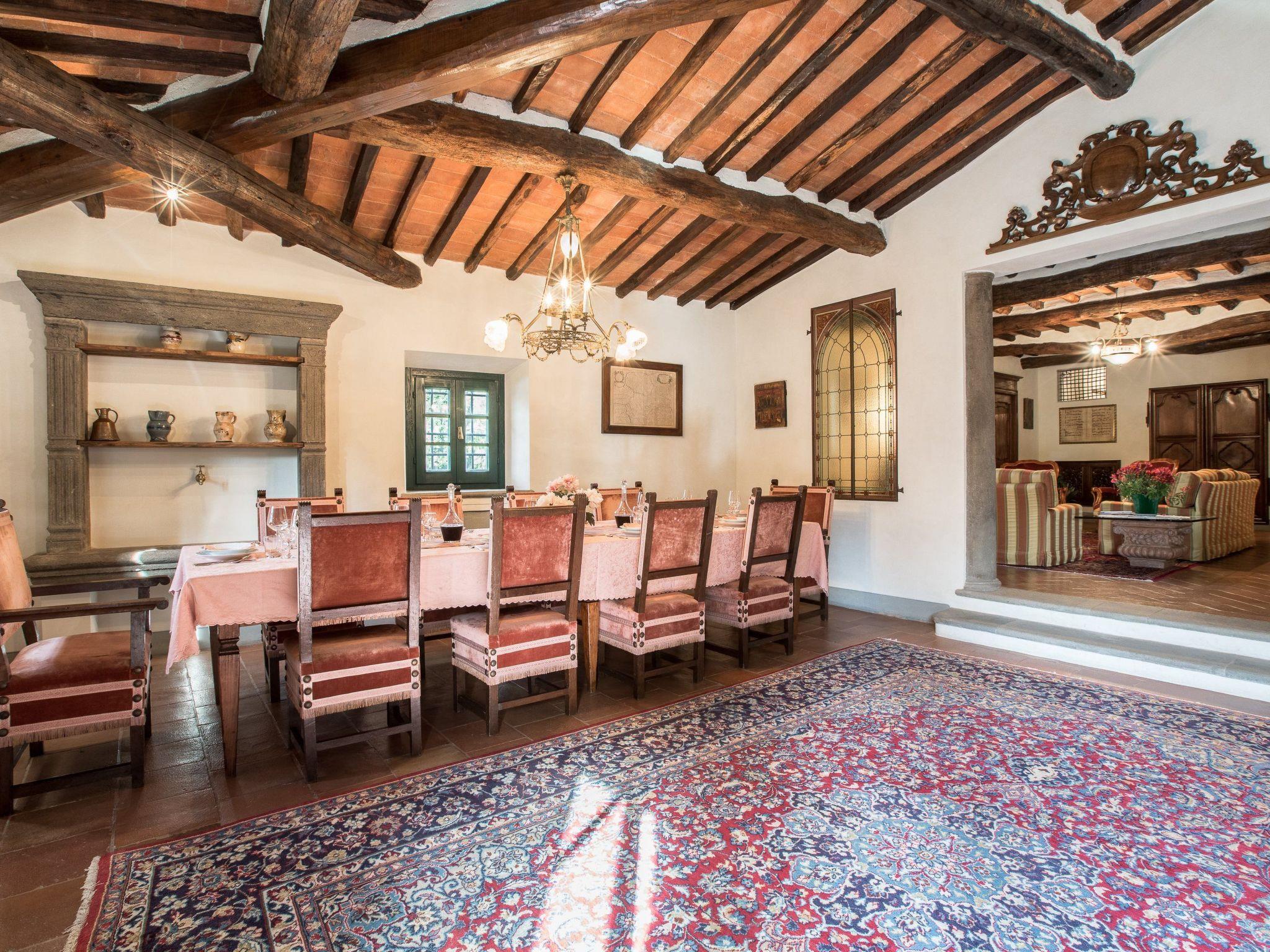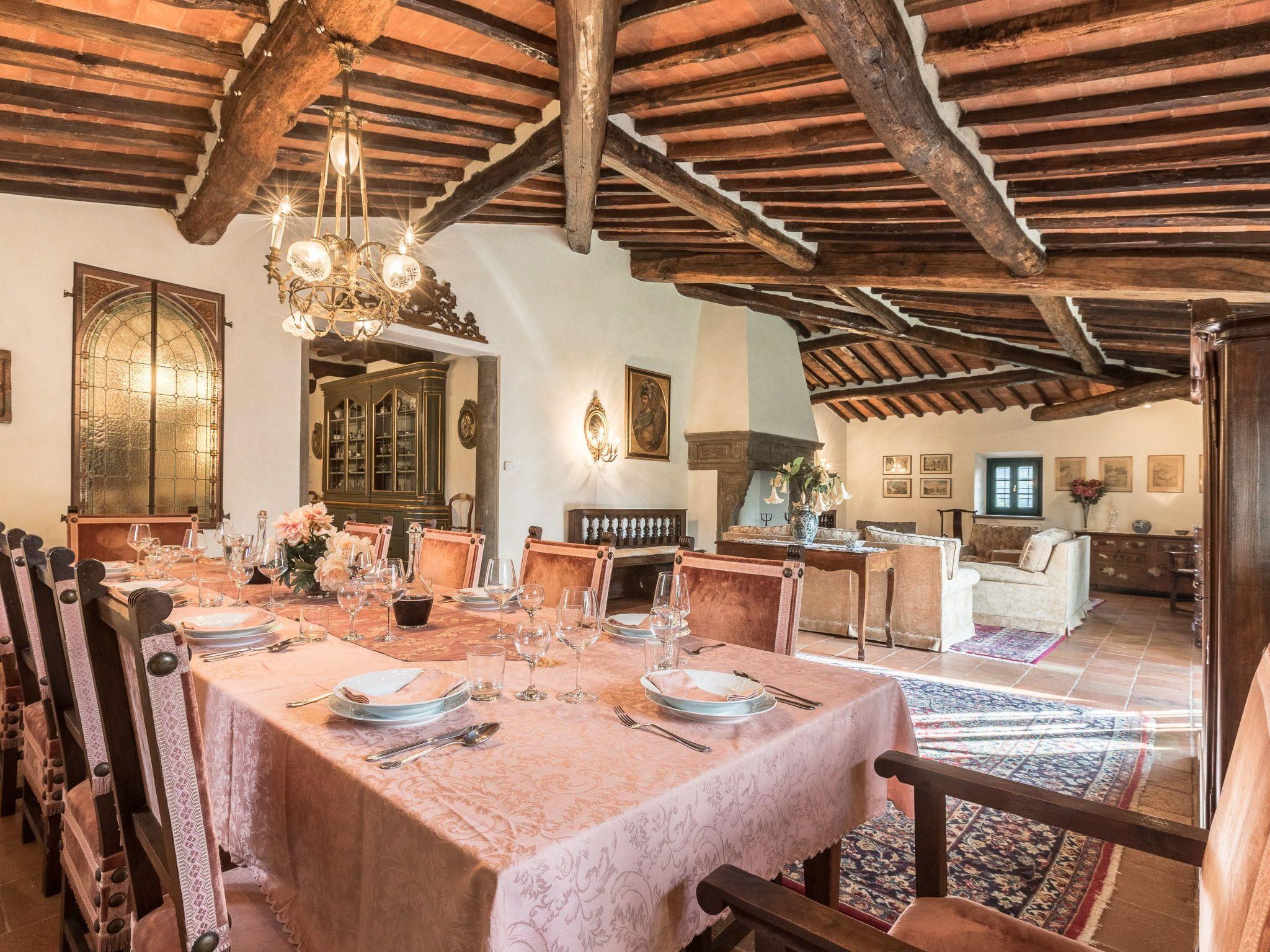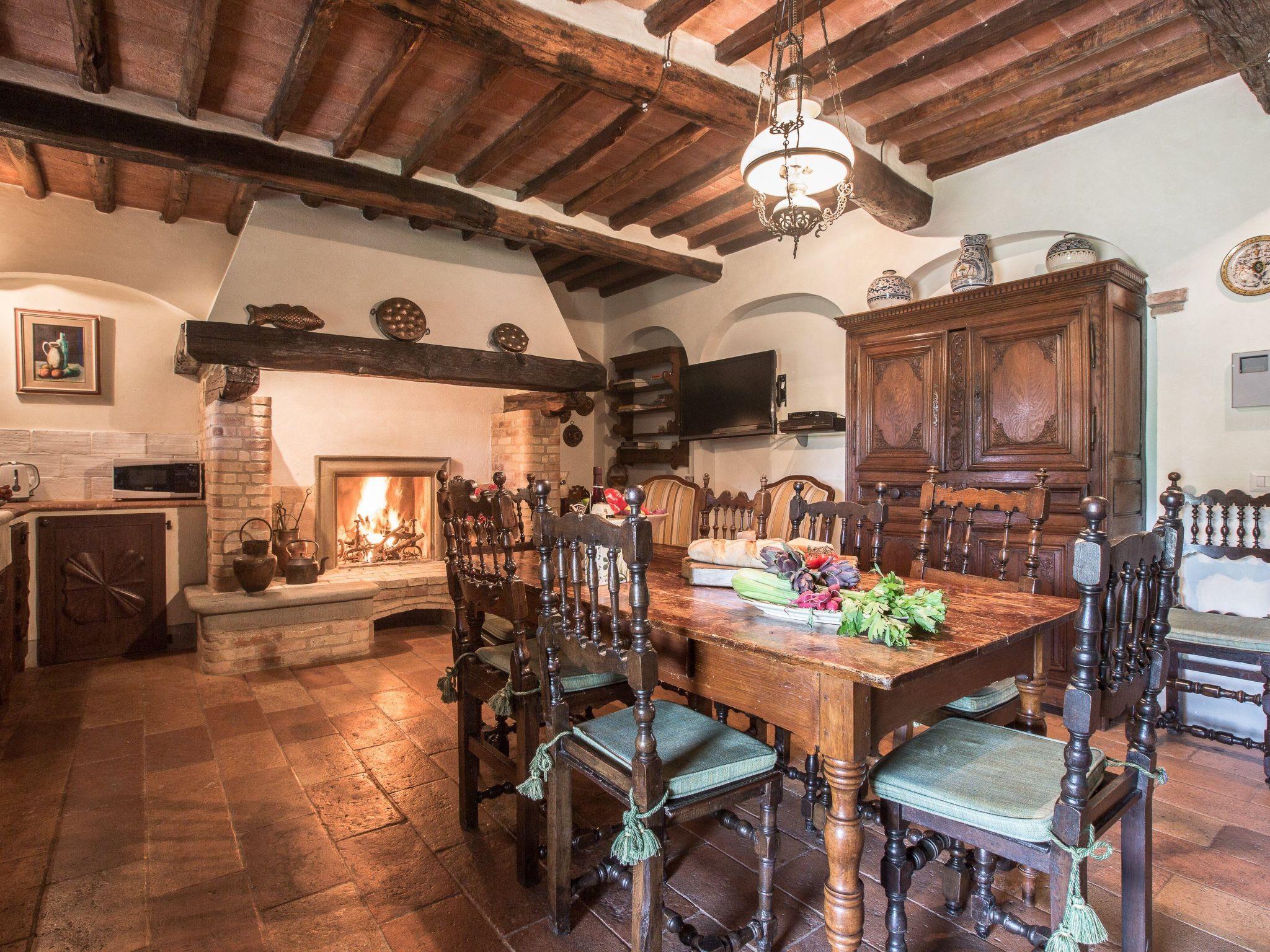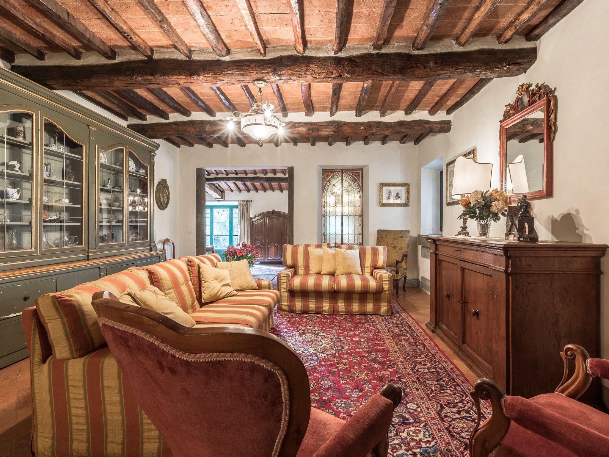 This charming stone villa with swimming pool is situated in the fertile hills of the Valdinievole, just 2 km from the famous spa town of Monsummano Terme. Originally an 18th-century farmhouse built of local stone, the villa is now surrounded by a large garden full of lush plants and beautiful Tuscan terracotta vases. In a picturesque position with a wide view of the surrounding countryside, there is an infinity pool (16 x 8 m, depth from 1.35 to 2.50 m, open from mid-April to mid-October) with a very large whirlpool area for 8 people. Under the pool, equipped with night lighting and an acoustic alarm system for the safety of our young guests, is a large changing room with 2 showers and a WC. There is also a fitness room equipped with a treadmill with digital display, a multifunctional Technogym bench, an exercise bike and a foosball table. The garden also offers several furnished areas, perfect for outdoor dining, including a relaxing stone amphitheatre, a barbecue and a children's corner with a swing and slide. Definitely an ideal place for those seeking peace and tranquillity. The 350 m² villa can accommodate up to 11 people on two floors. It is elegantly furnished with exceptional antiques tastefully collected over the years and features wood-beamed ceilings and beautiful old terracotta floors, lovingly restored by the owners. On the ground floor there is a large living-dining room (80 square metres) with a table for 14 and a magnificent 16th century fireplace (not in use), sloping ceilings with wooden beams and French windows overlooking the garden with views of the historic centre of Monsummano Alto; A further living room with satellite TV (Netflix, Bose Bluetooth acoustic speakers) and a double sofa bed and a single bed leads to the large Tuscan kitchen with fireplace (fully equipped with professional hob with 2 ovens, side-by-side refrigerator with icemaker, dishwasher, microwave, Nespresso coffee machine, American coffee machine, moka coffee maker, toaster, blender, juicer), a cast-iron stove with ovens and a French window leading to the veranda suitable for outdoor dining with a table seating 14 a double bedroom with a 17th-century fireplace (not in use) and French doors leading to a covered veranda; a bathroom with a hydro-massage shower; and a laundry room with a washing machine and dryer. From the entrance hall, a stone staircase leads to the first floor, where there is a large double bedroom (30 m²) with en-suite bathroom with Turkish bath/shower, another double bedroom and a twin bedroom (which can be converted into another double bed), both sharing a bathroom with whirlpool tub and shower with chromotherapy and aromatherapy kit. All rooms are fitted with sumptuous Persian carpets. Amenities: Wi-Fi (up to 30 MB download, up to 3 MB upload), all double beds are king-size, all windows are fitted with mosquito nets, cots, high chairs, baby bottle steriliser on request, heating and air conditioning in all rooms (heating and air conditioning consumption not included), welcome hamper with a light dinner on the evening of arrival and a continental breakfast on the first morning, housekeeping on Wednesdays (2 hours) with towel change, complimentary toiletries in all bathrooms with shower/shampoo/hand soap and body/hand cream, hairdryer in all bathrooms, wall safe, Netflix, Bose Bluetooth speakers, fire extinguisher and fire blanket, carbon monoxide detectors in kitchens, smoke detectors on each floor, first aid kit (one in the villa and one in the pool locker room), audible pool alarm system, 4 mountain bikes, charcoal and fire tablets for barbecues and private parking for up to 5 people. Car, small pets allowed on request. A personal chef, wine and local product tastings, a babysitter, a transfer to/from the airport, a grocery delivery service, a hairdresser/beautician/masseuse at home; Organisation of cookery courses, vineyard visits and wine tastings, painting lessons (on canvas or porcelain); Provision of a chauffeur and a wedding planner and party planner. Distances: nearest shops and restaurants Monsummano Terme 2 km, Montecatini Terme 5 km, San Miniato 30 km, Florence Airport 40 km, Pisa Airport 45 km.