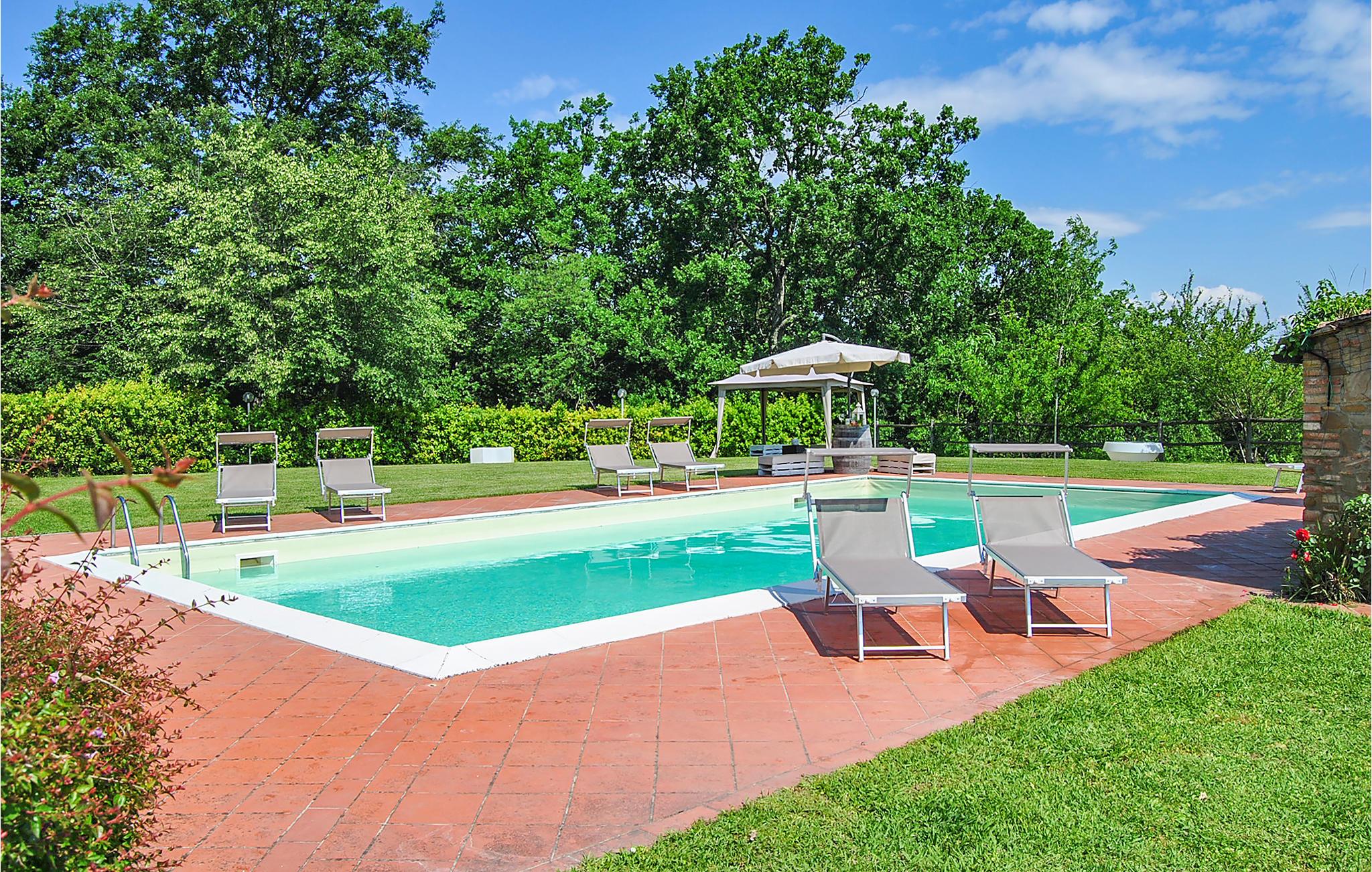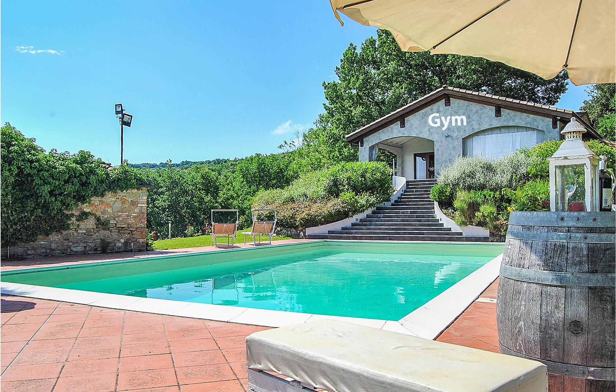 Feriehus med pool, fitnesscenter og stor have i nærheden af Montaione i en panoramisk position. Ejendommen er helt indhegnet og dækker ca. 1000 m², dels med græsplæne og dels med skov. Der er et hovedhus, et udhus med udstyret gymnastiksal, en swimmingpool, et legeområde for børn og et underholdningsområde. Ejendommen har også en lille sø til sportsfiskeri. Montaione er beliggende i en dominerende og central position, ideel til at nå Volterra, San Gimignano, Firenze, Siena eller havet. Den etruskiske kyst kan nås på cirka en times kørsel. Huset tilbyder masser af plads til at arrangere en ferie med familien eller med en gruppe venner. Den sidste del af adgangsvejen er ikke asfalteret (800 m).