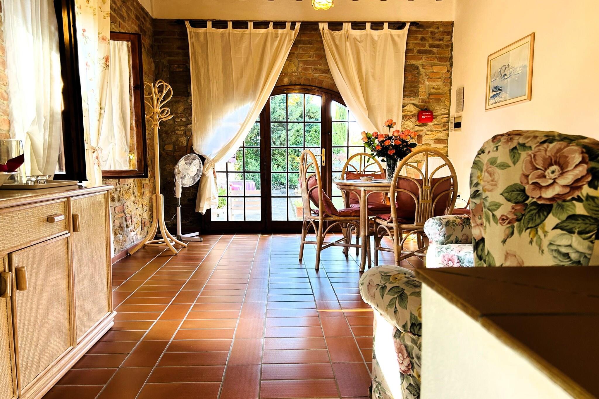 Denne indbydende lejlighed i stueetagen på Via Varna 69 nær Gambassi Terme har en varm opholdsstue med pejs og sovesofa, et veludstyret køkken på 17 m² med ovn, kogeplader, espressomaskine, elkedel, mikrobølgeovn, brødrister, opvaskemaskine og køleskab med fryser samt et spisebord. Den indeholder et soveværelse med dobbeltseng, et værelse med to enkeltsenge, et badeværelse med bruser og bidet samt en 15 m² privat terrasse, der åbner ud til fælles haver, perfekt til par eller små familier, der søger fred i Toscana. Den fælles, indhegnede have tilbyder afslappende omgivelser med loungemøbler og en trækulsgrill. Gæsterne kan nyde en 12×6 m pool med et lavvandet børneområde (åbent april-september), en udendørs bruser, brændeovn og fælles vaskemaskine. Børn og grupper vil elske legeredskaberne, bordtennisbordene, fodboldbordene og målet. Hjemmet ligger omgivet af toscanske bakker, 1 km fra ridestier og 6 km fra fiskesøer i Alberi. Gambassi Termes historiske spa ligger 7 km væk. I Castelfiorentino (3 km) serverer trattoriaer som Chiosco Ai Renai og Casa Masi lokale retter. Udforsk Varnas kirke fra det 13. århundrede og Sacro Monte di San Vivaldo, eller tag på dagsture til San Gimignano (18 km), Siena, Firenze, Pisa og Volterra. Med gratis Wi-Fi og kæledyrsvenlig charme tilbyder dette tilflugtssted kultur og komfort. Trøffelfestivalen finder sted hvert år i den sidste weekend i oktober.