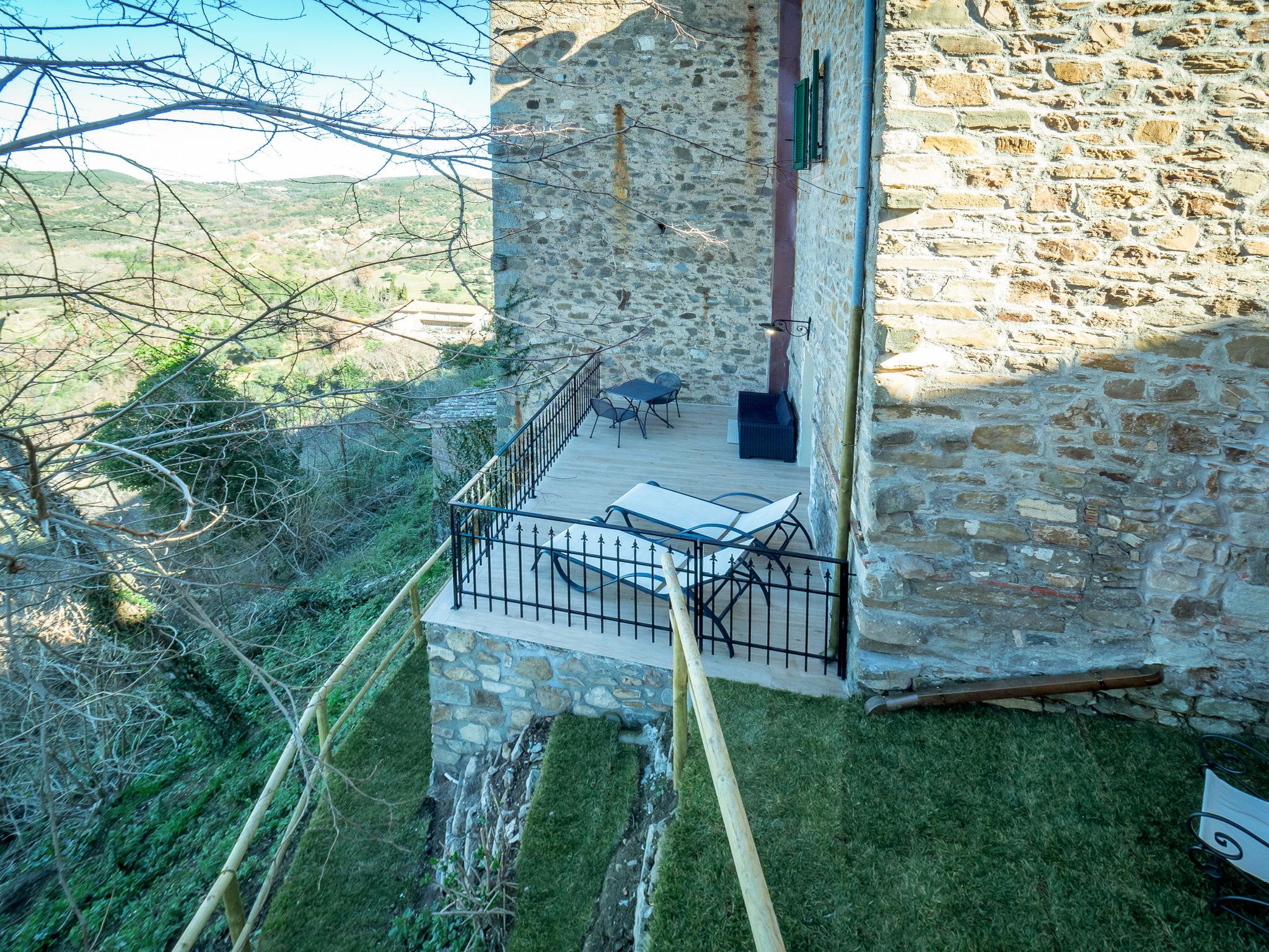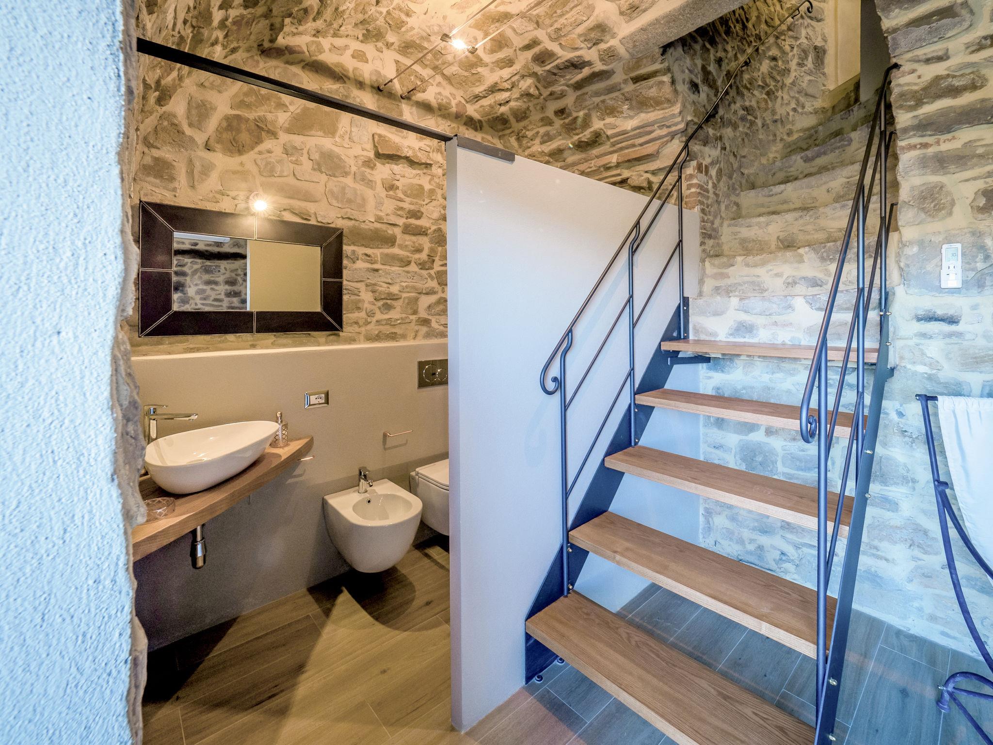 "La Suite del Benessere", 2-room house 70 m2 on 3 levels. Object suitable for 2 adults + 2 children. Fully renovated in 2019, very tasteful and stylish furnishings: living/sleeping room with 1 double sofabed (160 cm), satellite TV. Kitchenette (4 hot plates, oven, dishwasher, 4 gas rings, toaster, kettle, electric coffee machine) with dining table. On the lower ground floor: (steep stair) with shower/bidet/WC and hydro massage bath. Exit to the terrace. Upper floor: 1 open room with panoramic window with 1 french bed (160 cm), shower/bidet/WC. Electric heating, gas heating, air-conditioning. Natural stone floors. Terrace. Terrace furniture, barbecue, deck chairs. Marvellous view of the valley, the countryside and the forest. Facilities: washing machine, safe, children's high chair, baby cot for up to 2 year olds, hair dryer. Internet (WiFi, free). Please note: non-smokers only. Smoke alarm, fire extinguisher. A natural stone staircase leads down from the living room to the wellness area with a large hydro massage bath in the natural stone vaulted cellar of the house. No mandatory extra charges to be paid on-site except for local tax. IT053025C28GWESZXY