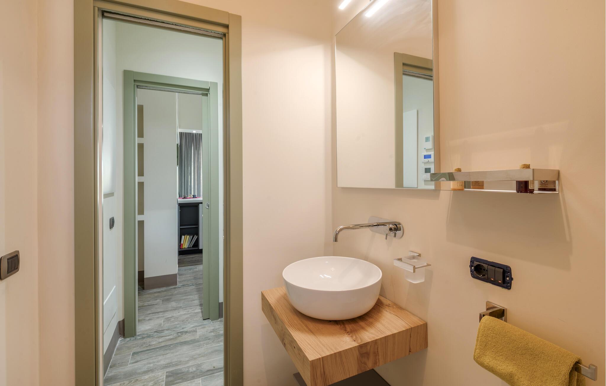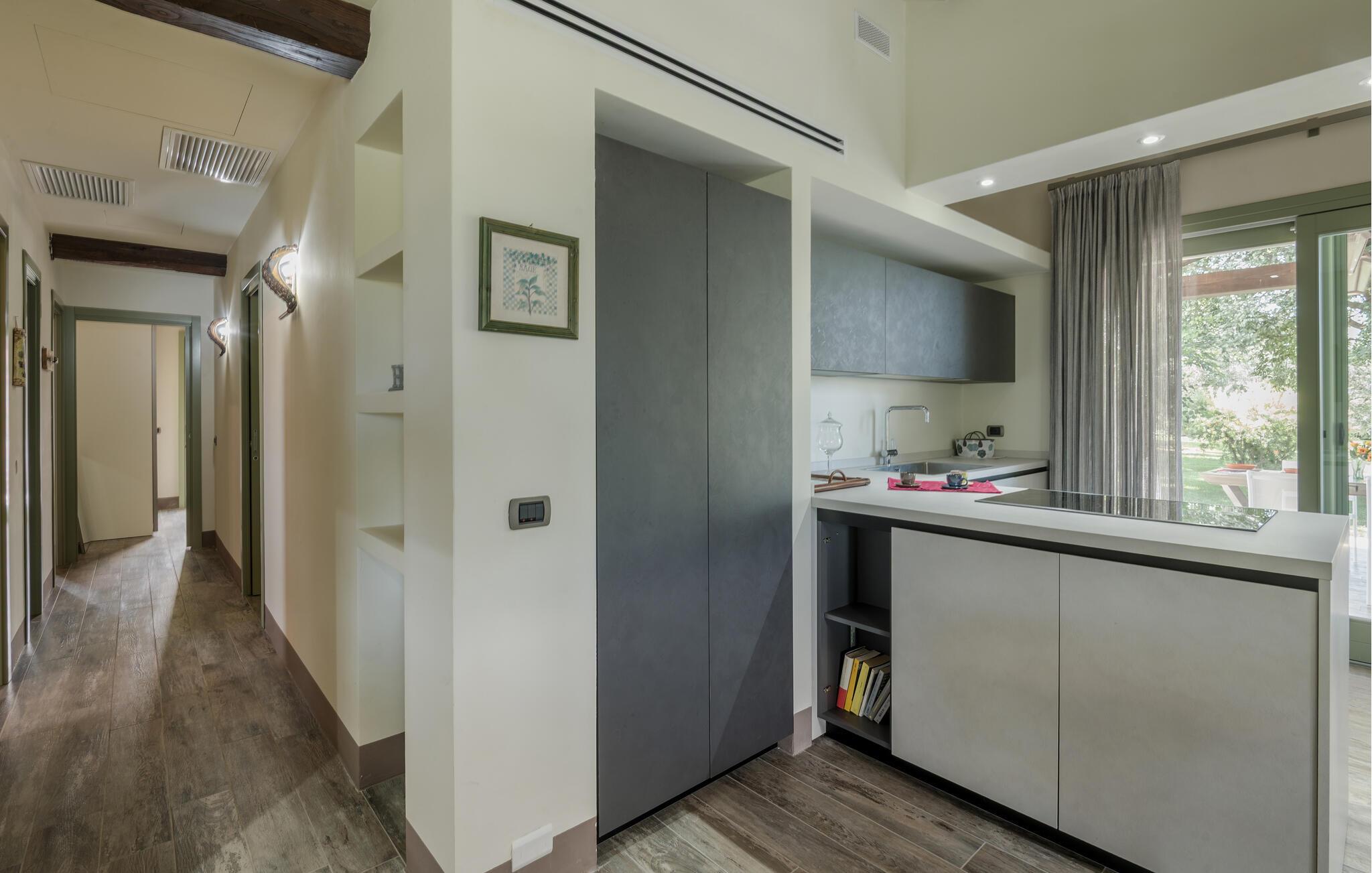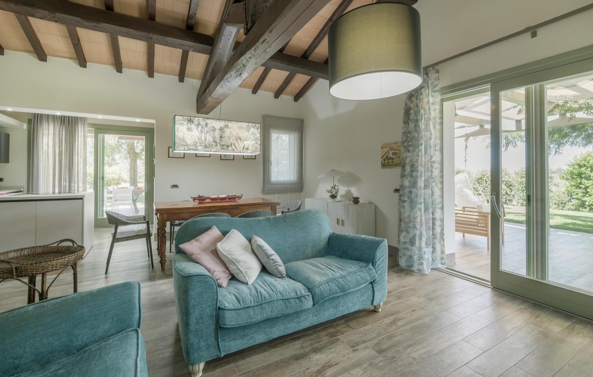 Glæd jer til en afslappende pause med venner eller familie i det elegante interiør i dette rummelige feriehus. Eksperimenter med frisk pasta i det moderne, åbne køkken og nyd resultatet sammen ved det stilfuldt oplyste spisebord. Tilbring rolige aftener med en spændende serie i opholdsstuens feel-good atmosfære.