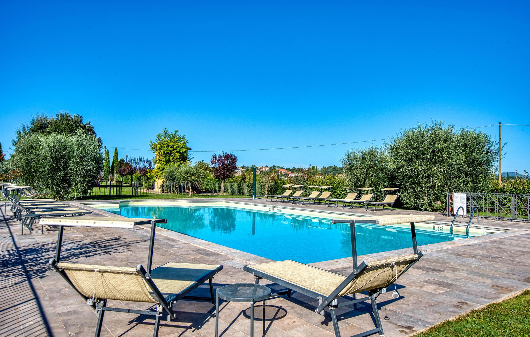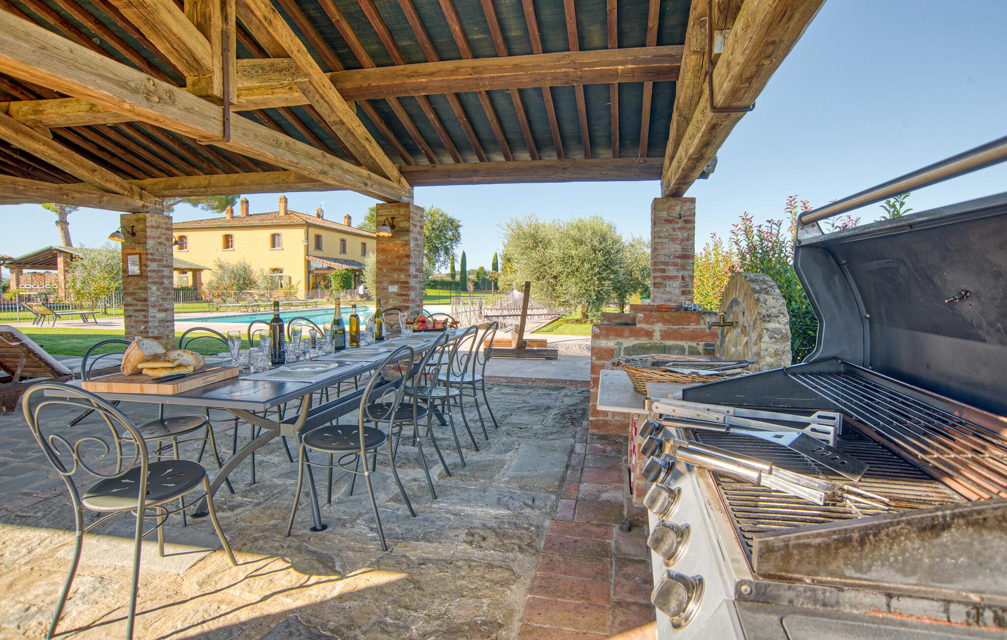 Den åbne opholdsstue i kælderen giver mulighed for at holde en kølig temperatur selv på varme sommerdage; rummet er opdelt i et veludstyret køkkenområde, spiseplads, opholdsstue med maxi-tv, badeværelse og fitnessrum. Der er også et åbent sommerkøkken med grill og pizzaovn på bagsiden af ??huset på den lange overdækkede terrasse med siddepladser og liggestole. Ved poolen finder du en anden overdækket terrasse med behagelige liggestole til afslapning efter en forfriskende svømmetur i den store pool. De meget diskrete ejere bor i en separat villa på ejendommen.