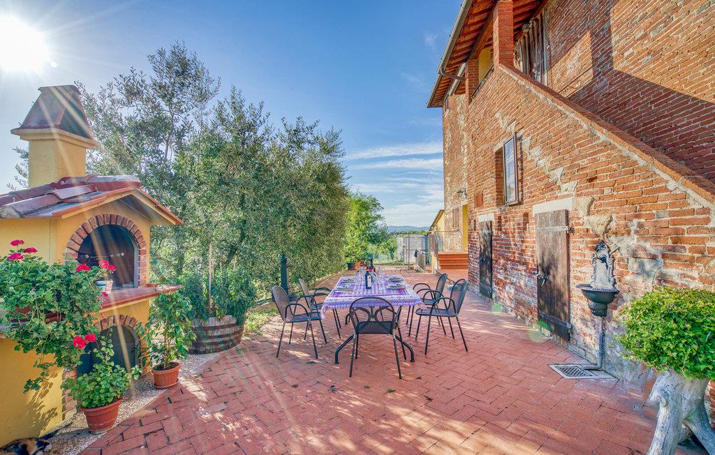 Foran lejligheden er der en lang stenterrasse med siddepladser og grill. Lejligheden har også et velplejet haveområde. Her er siddepladser, solbadning og græsplæne til børn - I kan nyde en bred udsigt over Chiana-dalen fra overalt.