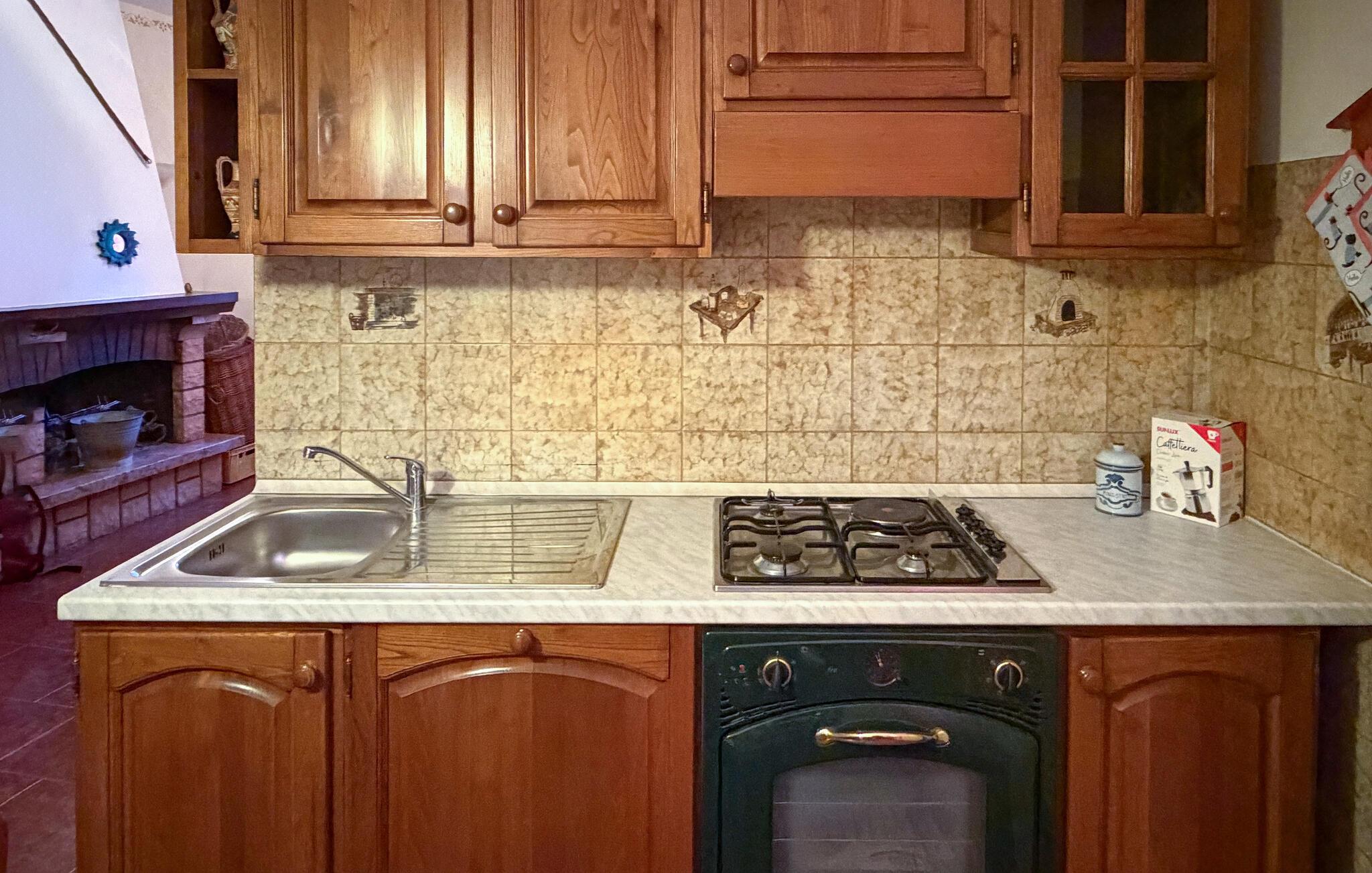 Glæd jer til de varme, rustikke møbler og den autentiske atmosfære i jeres hyggelige ferielejlighed. Benyt jer af det kompakte køkken i landlig stil og tilbered jeres måltider med lethed. Sæt jer ved det tilstødende spisebord og nyd at tilbringe tid sammen i rolige omgivelser.
