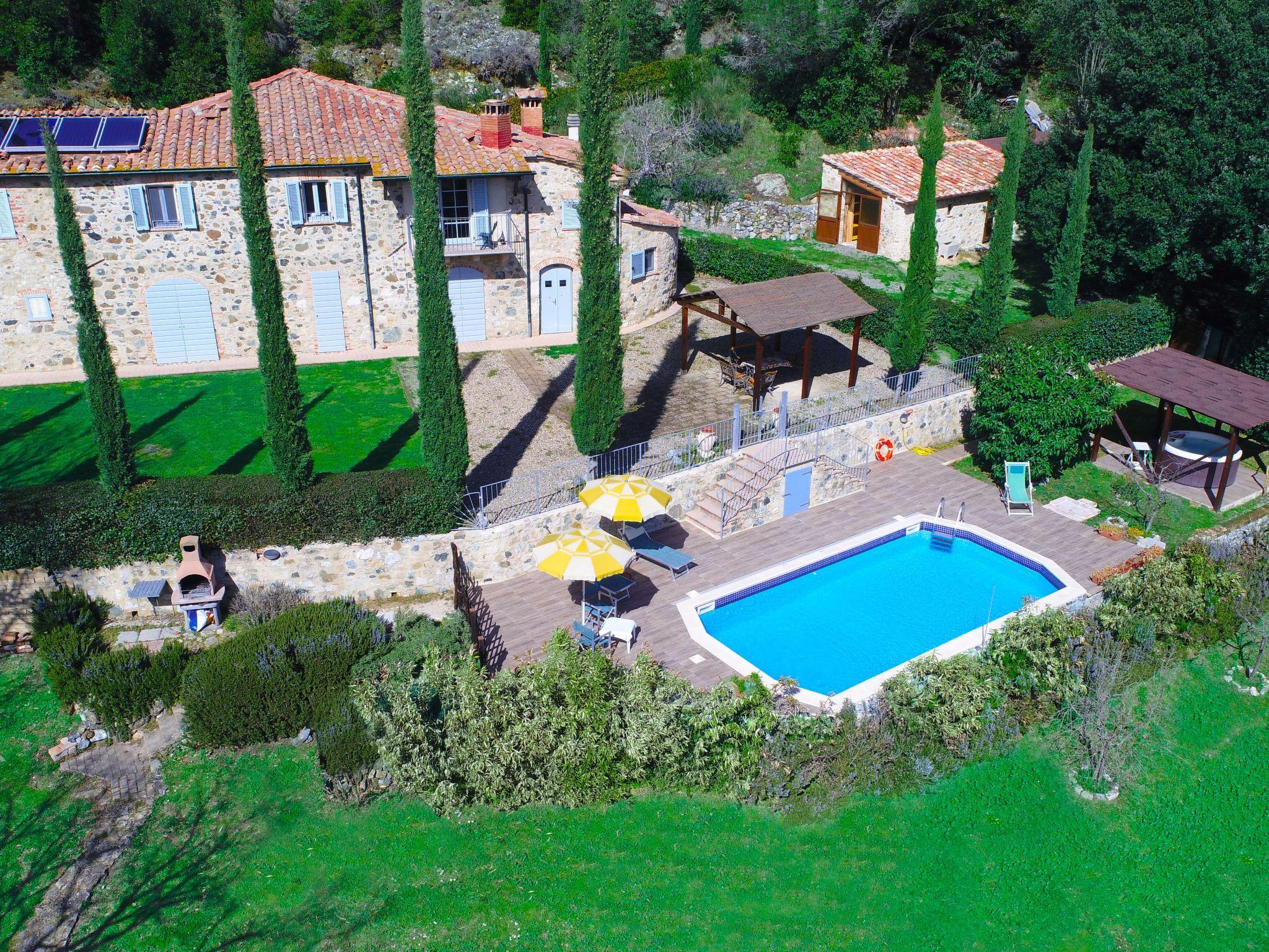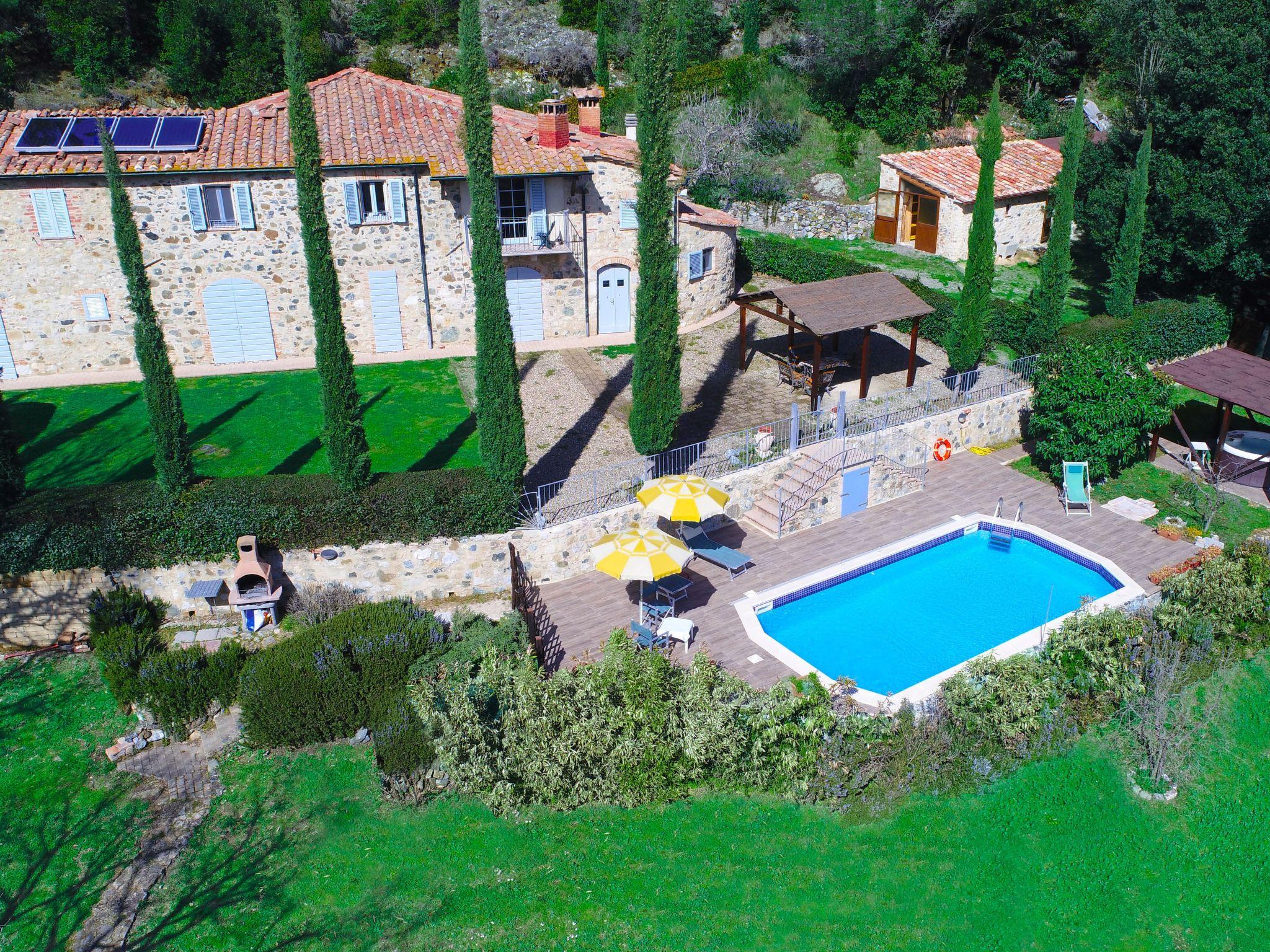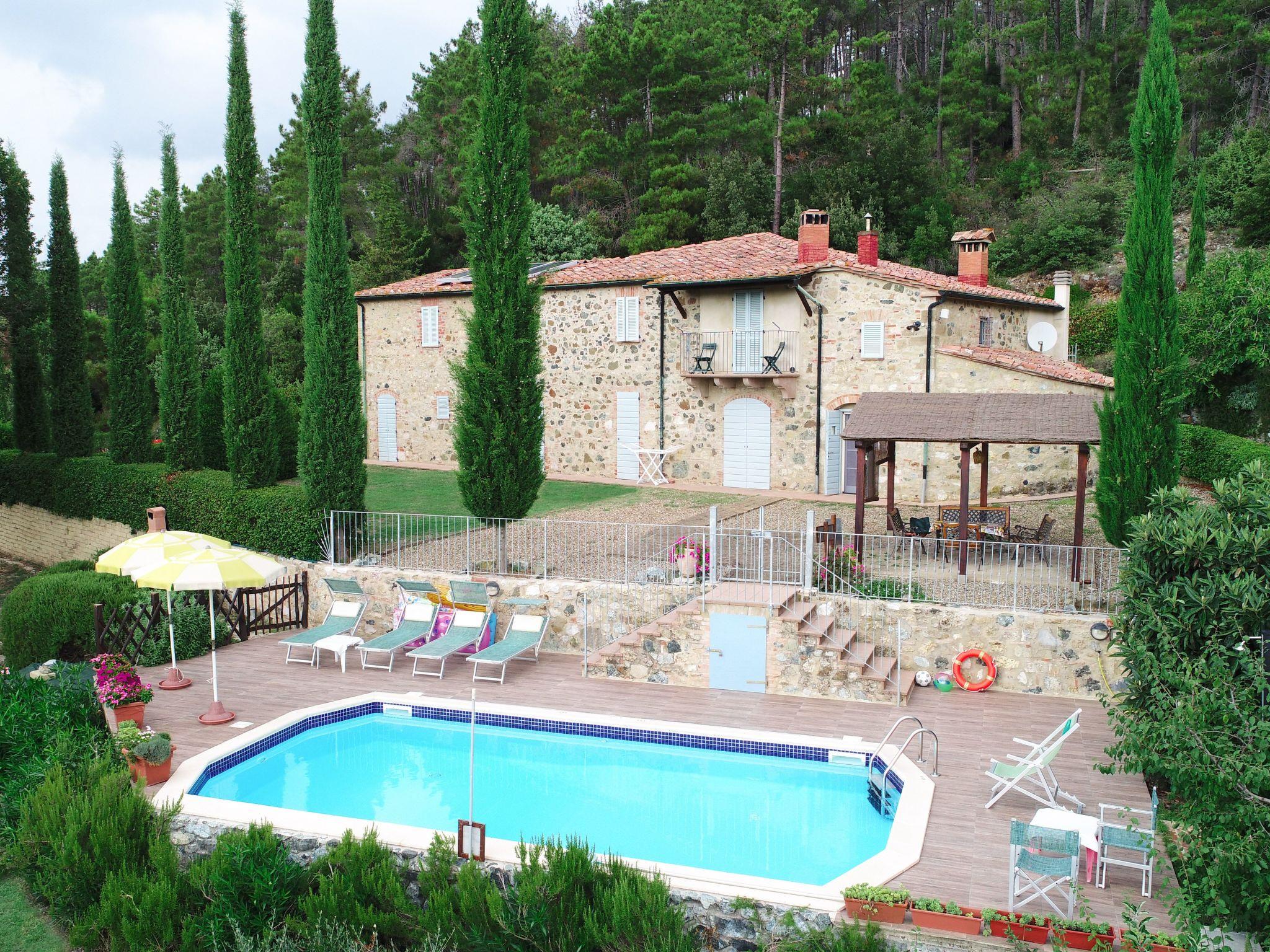 Private villa surrounded by greenery located between the art cities of Siena and Volterra, with private swimming pool and jacuzzi for exclusive use. From the villa it is possible to enjoy the view of the Rocca Sillana fortress and the medieval tower of Montecastelli Pisano. A relaxing environment perfect for both summer holidays and romantic honeymoons. A high level of privacy will accompany your vacation. Thanks to the third additional room (extra service) you can stay up to a maximum of 7 people. So you can relax, away from the smog and city noise. The villa has an outdoor heated Jacuzzi for 5 people and a swimming pool overlooking the lawn.Thanks to the location, you can easily visit the most important art cities of Tuscany, such as Siena, Florence, Volterra, Pisa, San Gimignano, the Chianti cellars and many small medieval villages. A few hundred meters from the villa is the medieval village of Montecastelli Pisano where you will also find a restaurant / pizzeria and bar. We will be at your disposal throughout your stay, you will have assistance and support from the day of your arrival in which we will deliver the keys to the day of your departure.Short description 1Other rooms: room with washing machine and ironing boardTotal kitchens: 1SurroundingsSports facilities in the surrounding area: Climbing, Soccer field, Riding school, TennisSurroundings 1Excursion destinations: Siena, Volterra, Florence, Pisa, San Gimignano, Bolgheri.Garden and outdoor spacesGarden facilities: Barbecue, Garden furniture availableAdjacent leisure facilities: Swimming pool, Private outdoor swimming pool, Tub, Whirlpool tubServices 1Other: It is possible to request a chef for one or more evenings to cook for you inside the villa and then serve you the dishes.Outside: Balcony; Barbecue; Garden; Garden furniture; Parking available; Private parking; Private swimming pool; Terrace ; Veranda;General: 3 double bed; Renovation year: 2009; Bathrooms: 3; 2 bedrooms +1 extra bedroom; Land area: 2000 m;Living: Fireplace; Computer; Sofa bed; DVD player; Radio; TV; Satellite TV;Bathroom / WC: Shower; Fon; Toilet;Cooking: Kettle; Stove; Electric cooker; Oven; Freezer; Fridge; Dishwasher; Coffee machine; Coffee machine; Microwave; Toaster;Other: Non smoking accommodation; Vacuum; Internet; Washing machine; Children's bed; Heating; Cooling fan; View of the mountains; WIFI;Distances (by air, approx.): Airport distance: 100.00 km; Sea distance: 50.00 km; Distance to nearest village: 2.00 km; Distance from restaurants / bars: 1,00 km; Distance station: 43.00 km; Distance to supermarket: 1.00 km;SurroundingsSports facilities in the surrounding area: TennisGarden and outdoor spacesGarden facilities: Barbecue, Garden furniture availableAdjacent leisure facilities: Swimming pool, Whirlpool tub