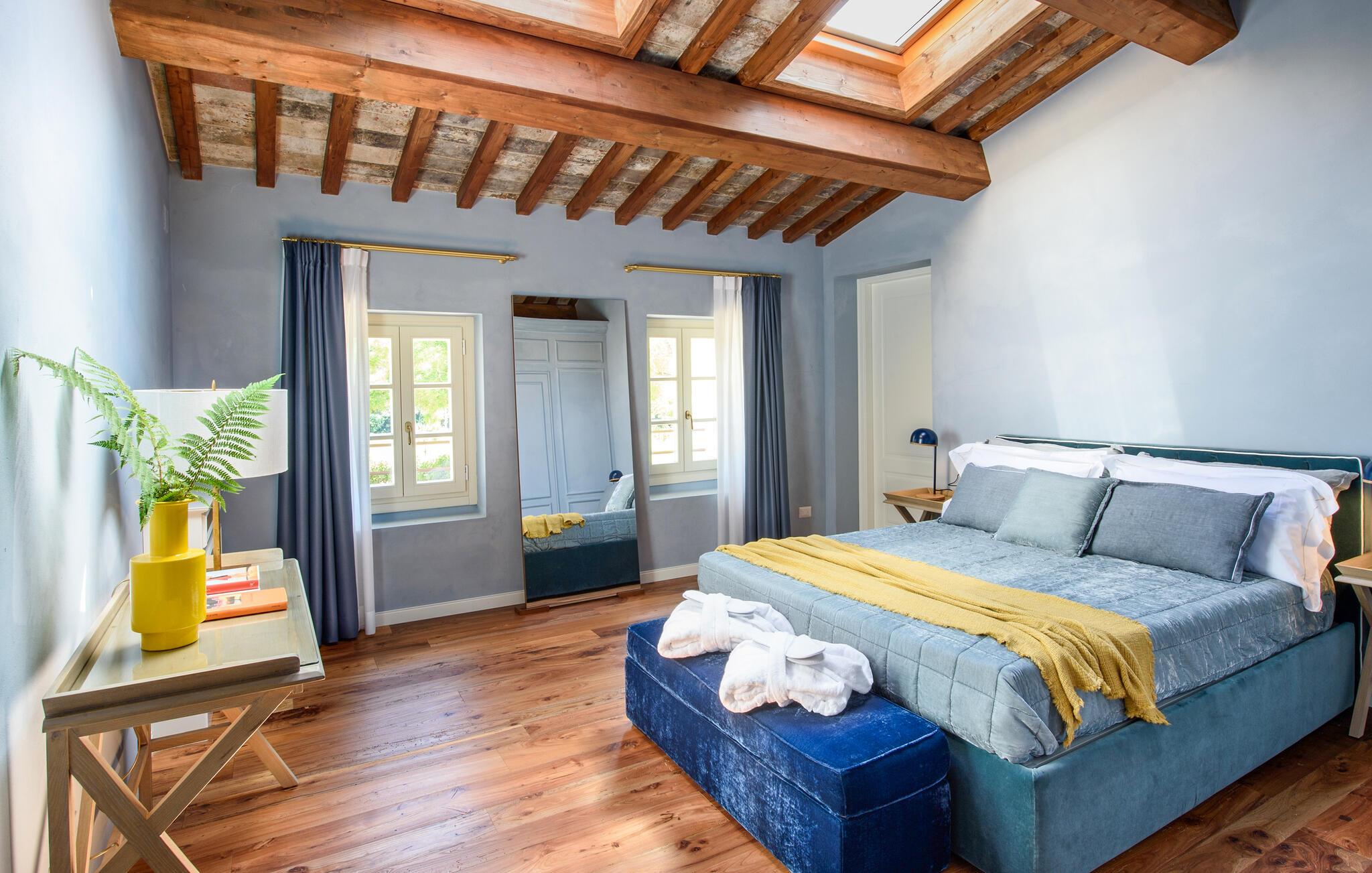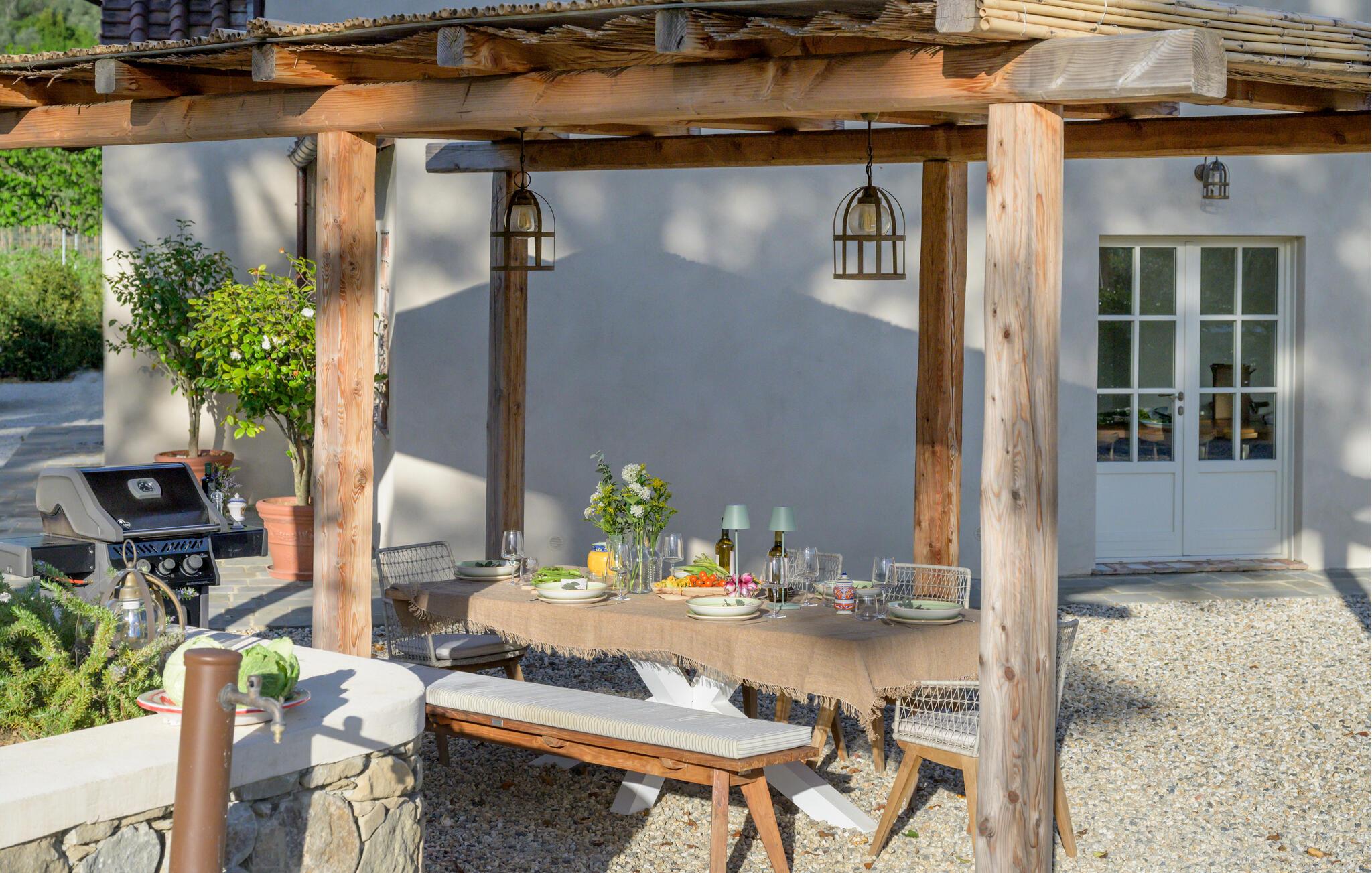Denne rummelige villa er noget særligt med en smagfuld blanding af moderne design og toscansk hygge. Lyse værelser, synlige træbjælker og elegante møbler skaber en indbydende atmosfære. Tilbered lækre måltider sammen i det åbne køkken og fejr dem i den hyggelige spiseplads. Tænd brændeovnen, læn jer tilbage med en bog eller stream en spændende film.